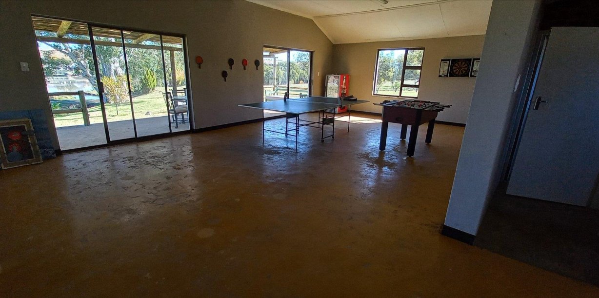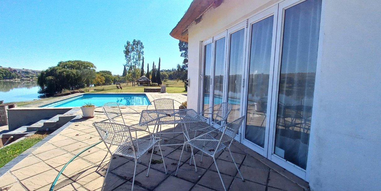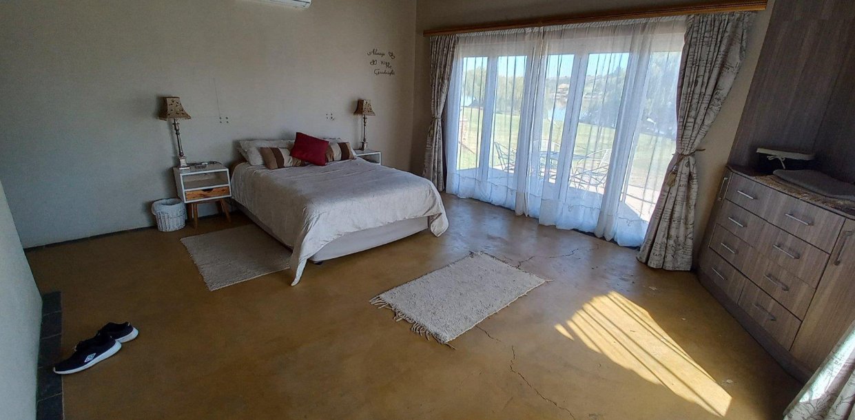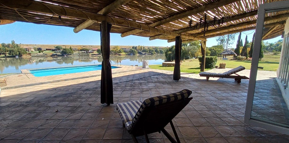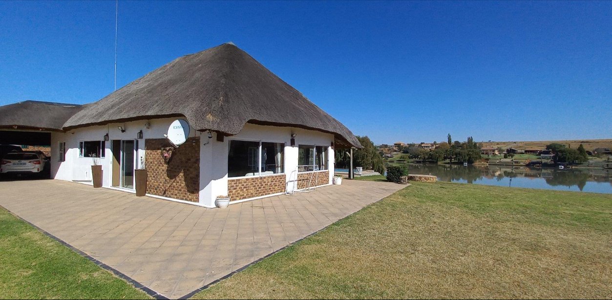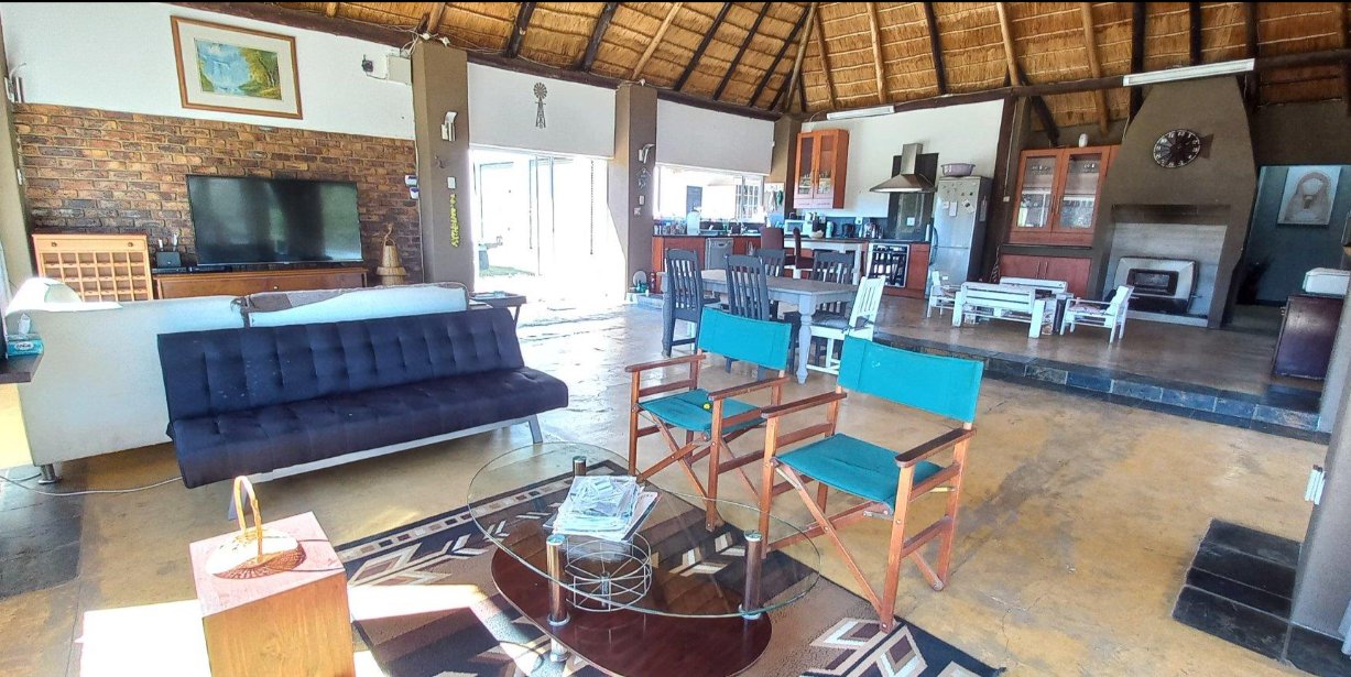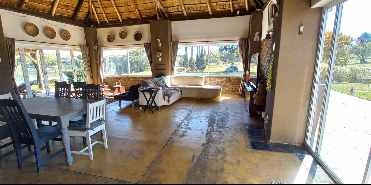 The first 3 hectare's which is located on the river with boat launch and 3 separate dwellings. The 1st is the main house which has a thatched roof allowing cooler summer days and warmer winters. Also giving of that holiday feeling with the raised rustic feel. The sliding doors and windows allow light to pass through allowing the outdoor feel to really set in, which leads to the patioed area overlooking the pool and great Vaal river.
