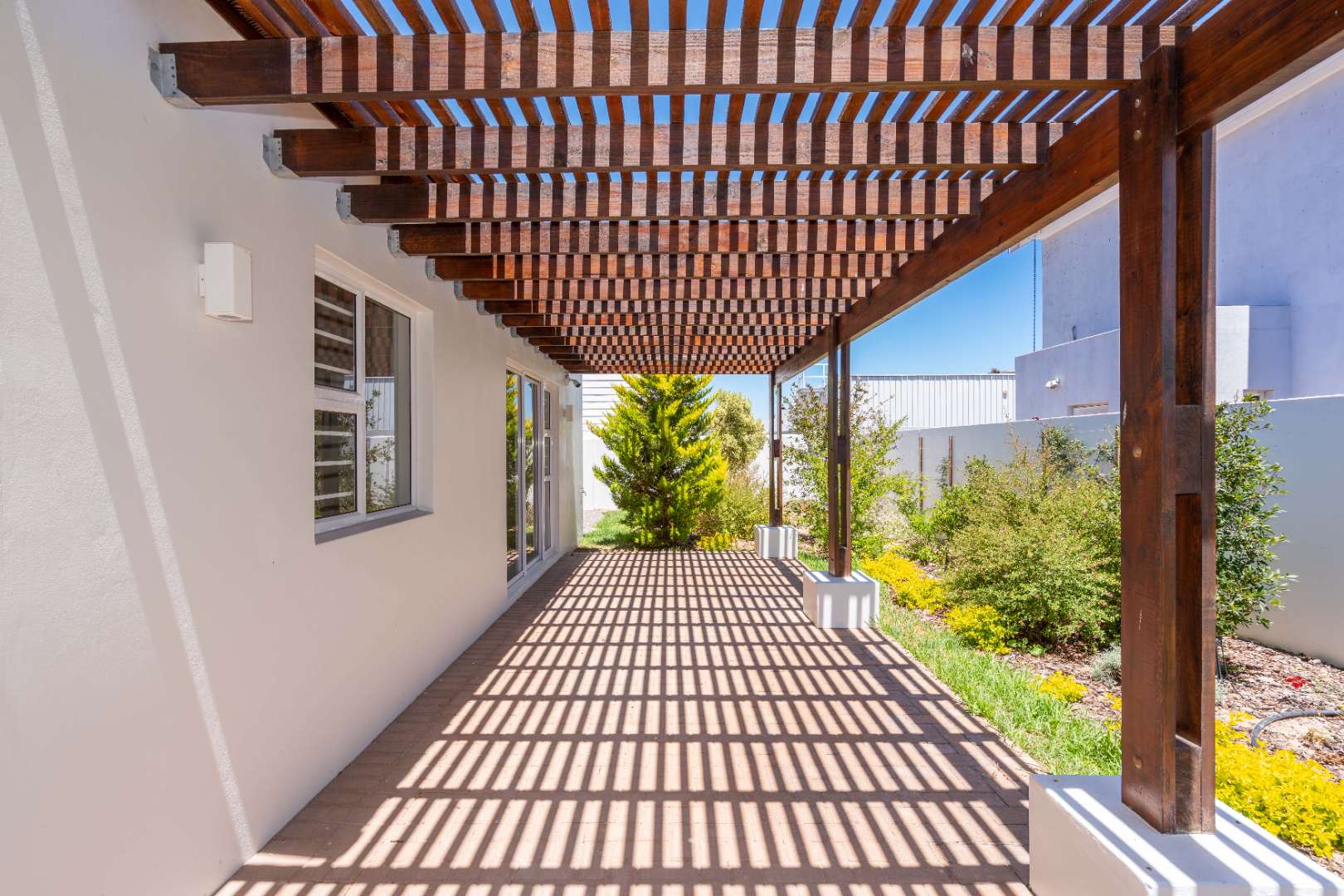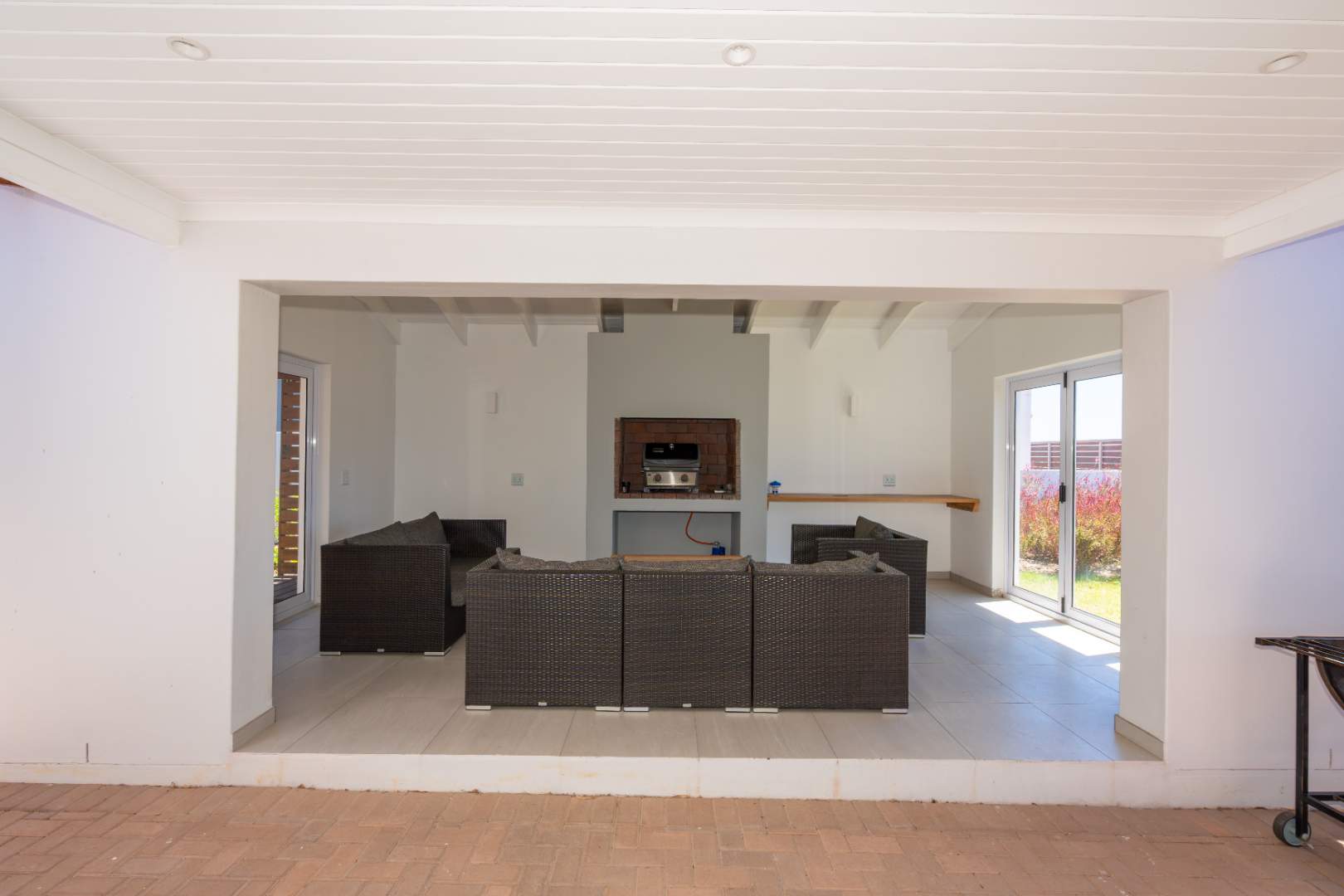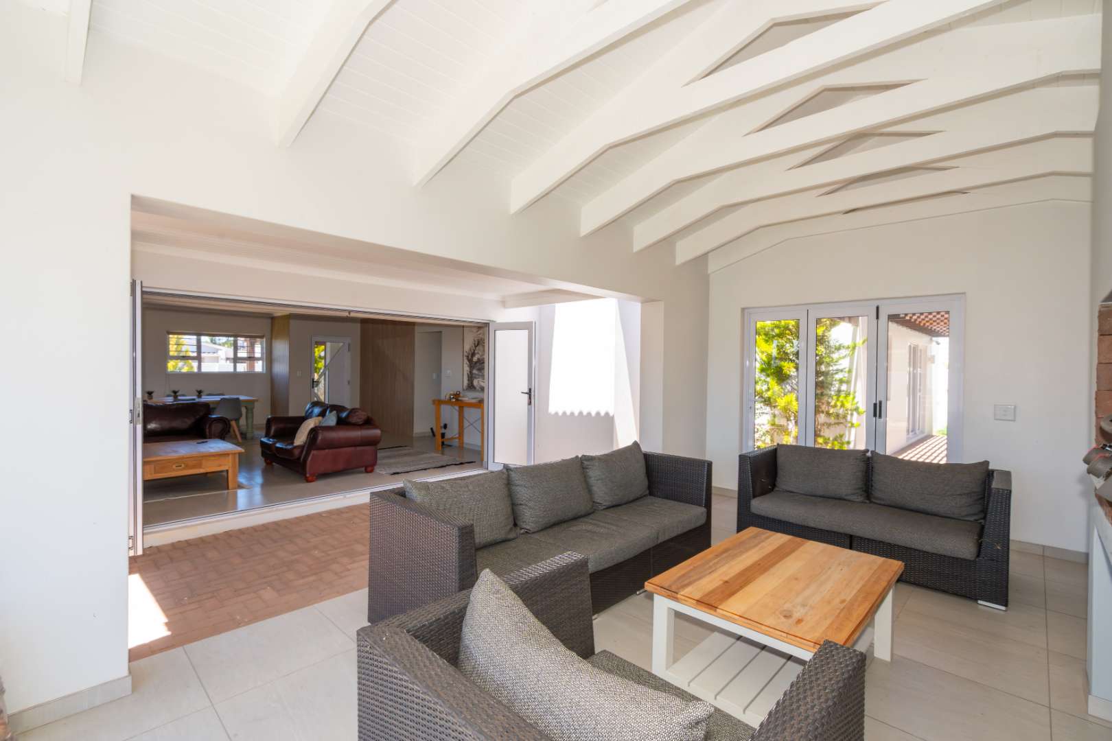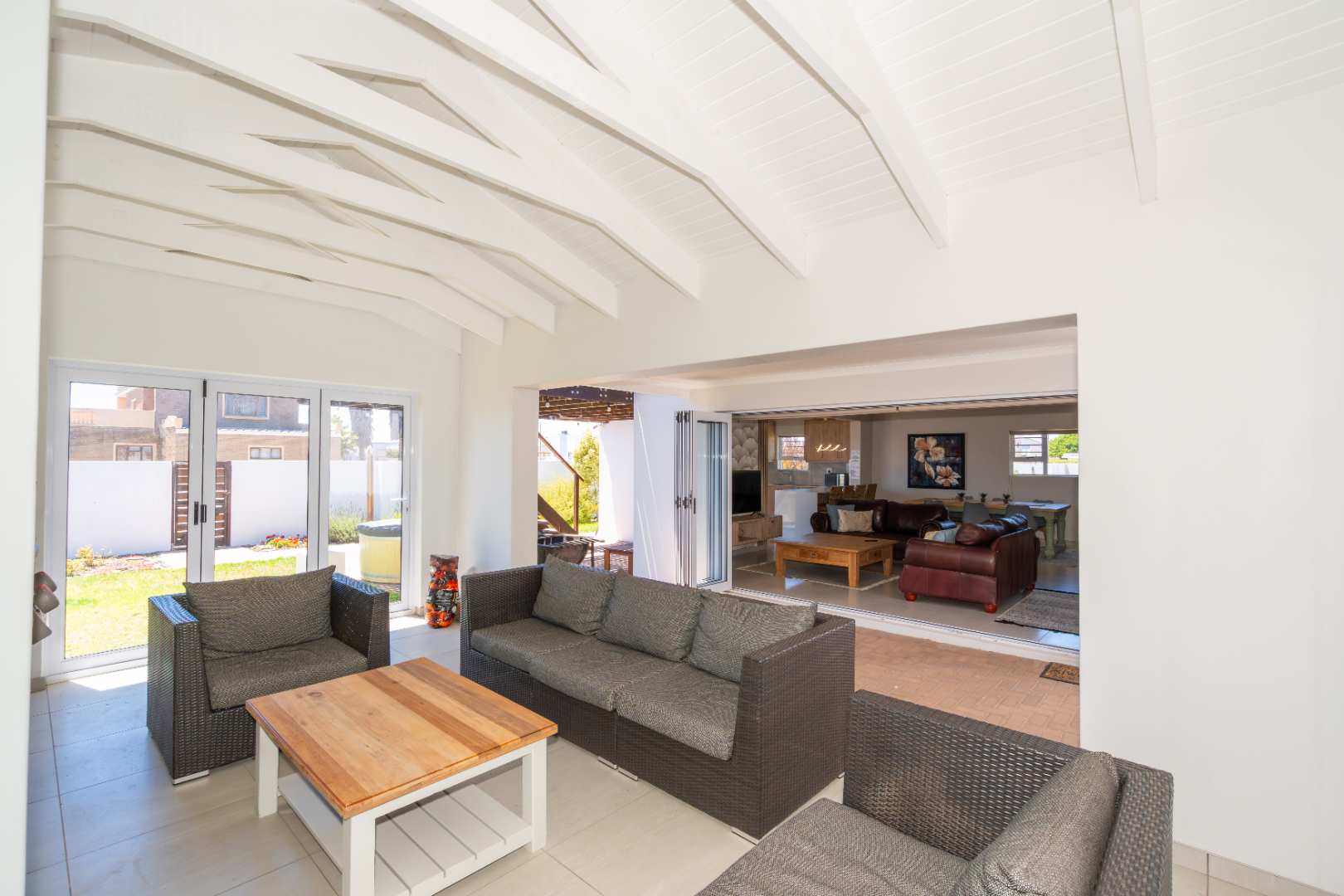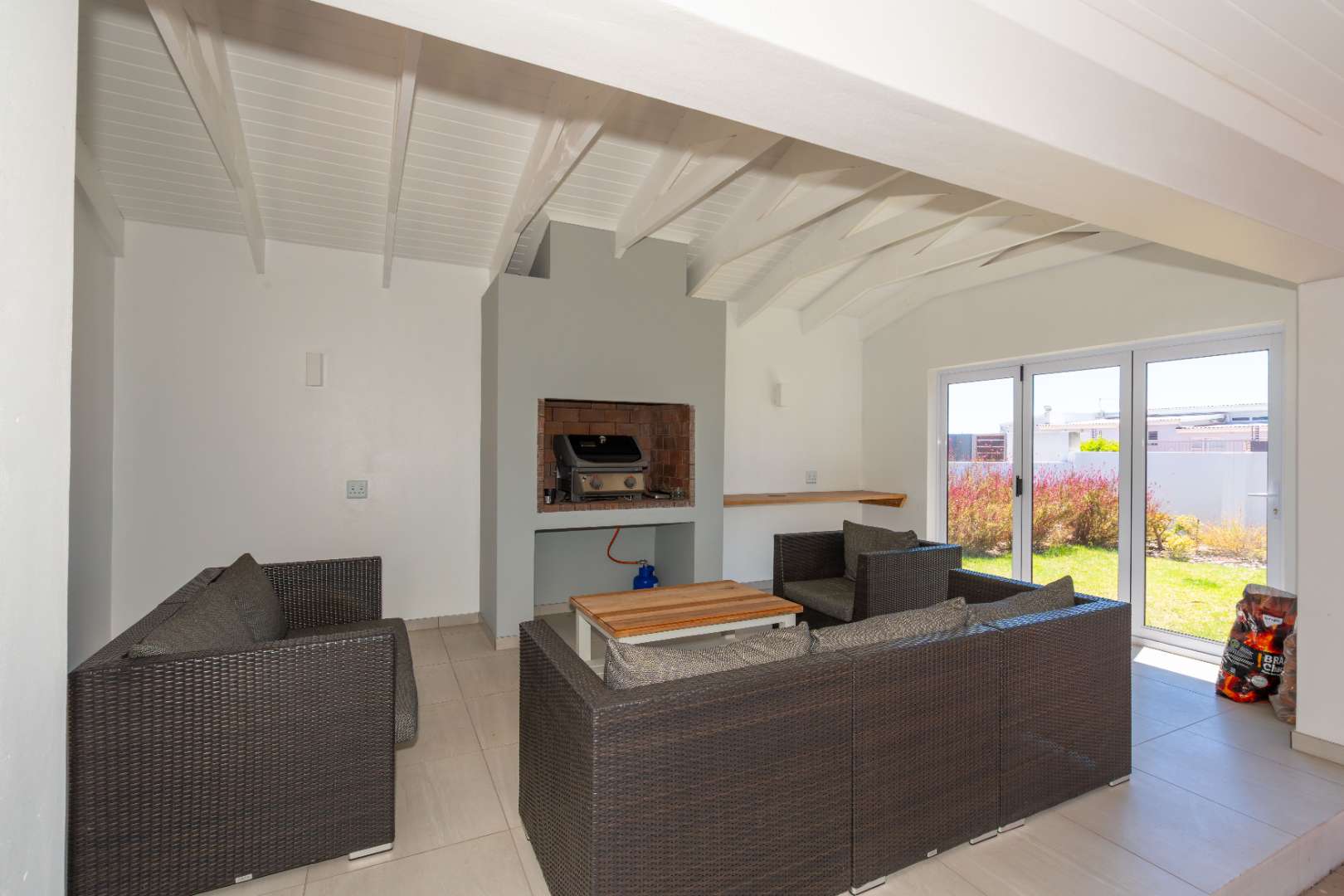 Stacker doors create a seamless indoor-outdoor flow, opening onto an enclosed patio with a built-in braai—perfect for entertaining. An elevated wooden deck offers lovely views of the lagoon, while the established garden includes an automatic sprinkler system. An outdoor shower adds convenience after a day at the beach.