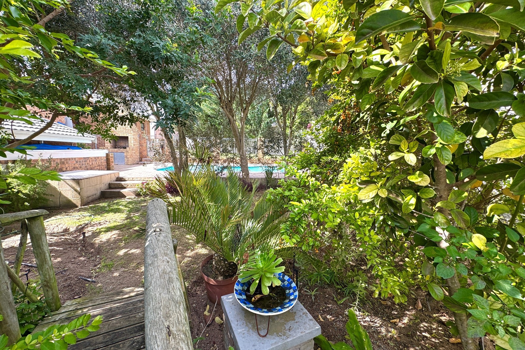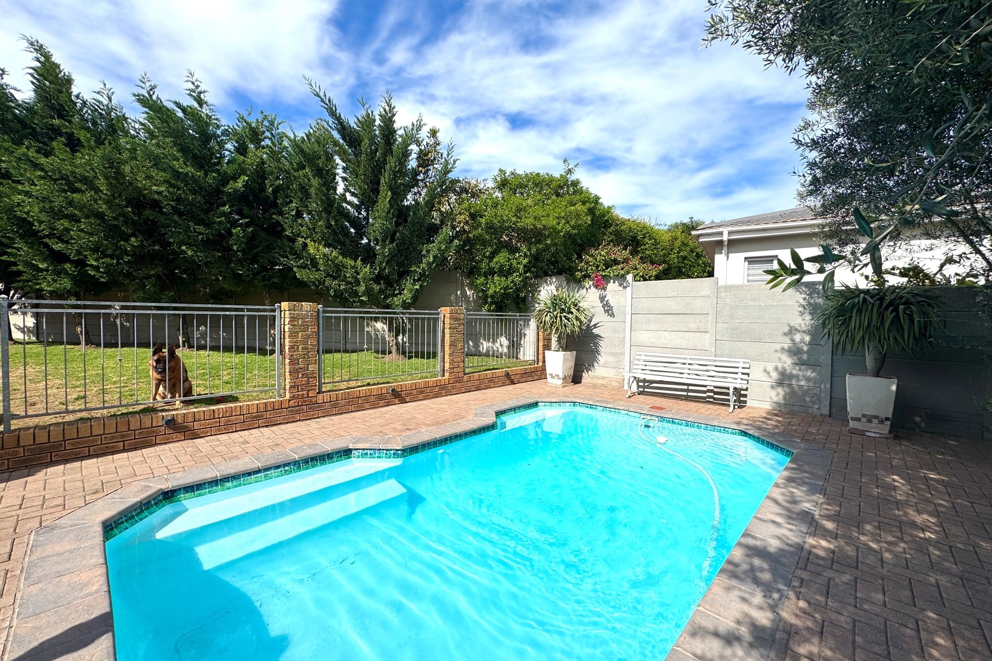 A secure, well-maintained back garden with a fenced-off pool for safety