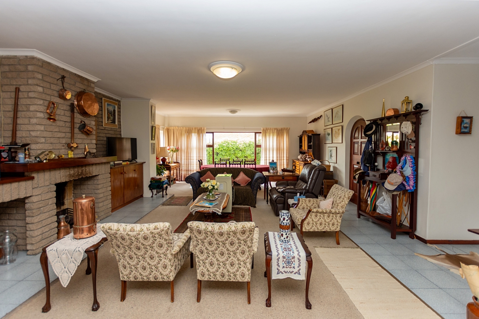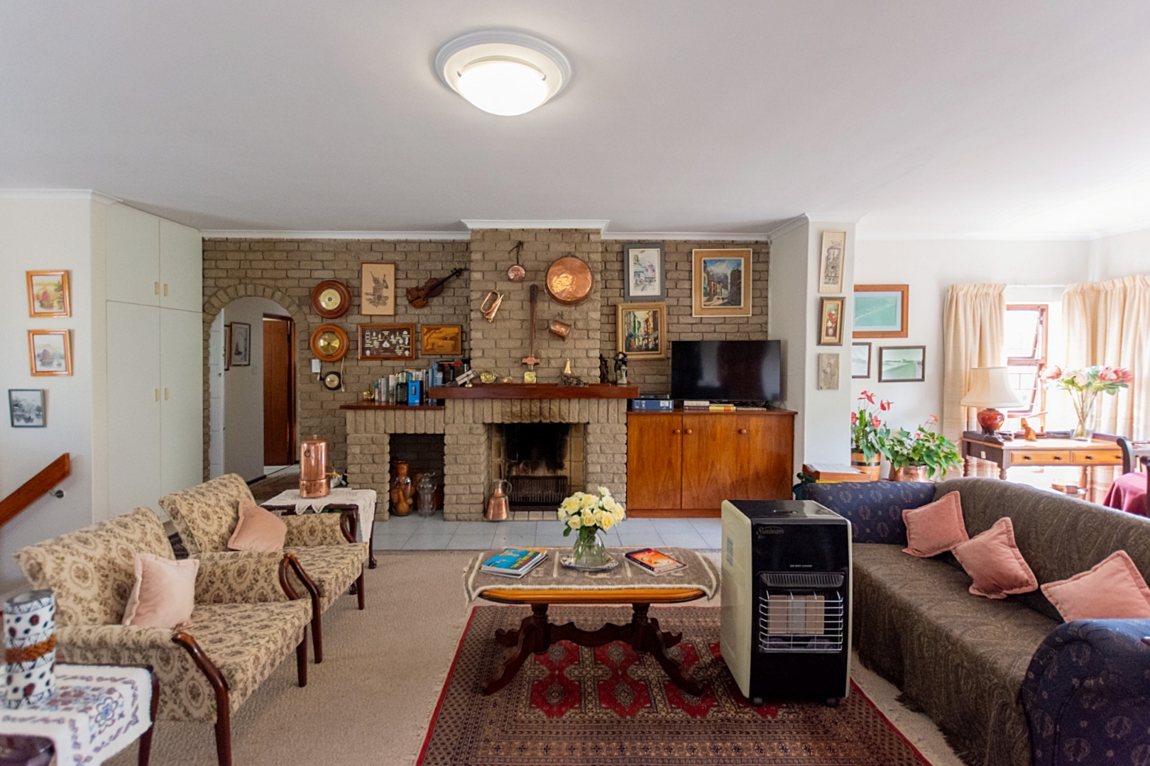 Open-plan living area with a cozy fireplace