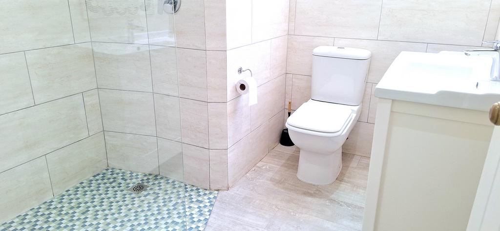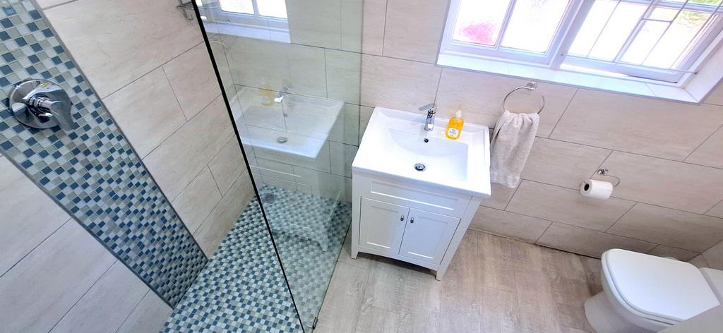 Two modern bathrooms, each with spacious showers, a toilet, and a basin.