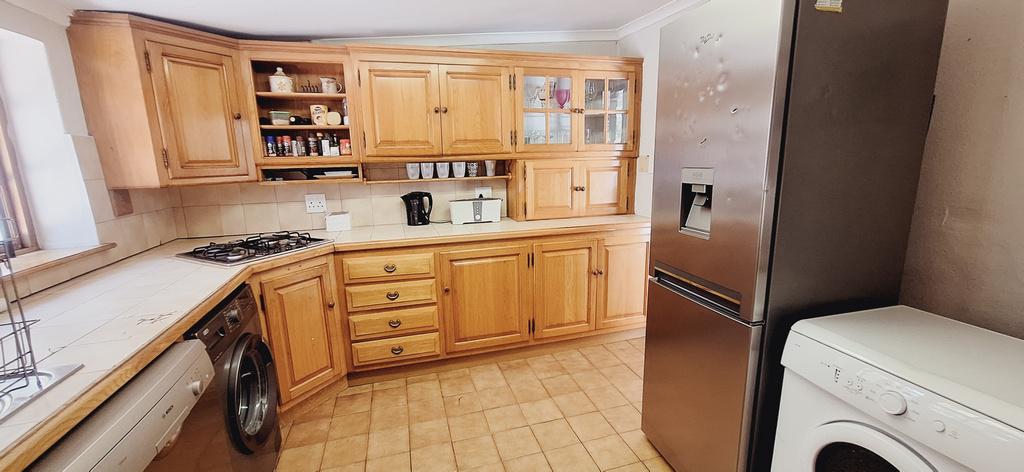 The farm-style kitchen is a nostalgic nod to the past, featuring a gas hob and a visible space where the old coal stove once stood. The kitchen also offers laundry and dishwasher connections for modern convenience.