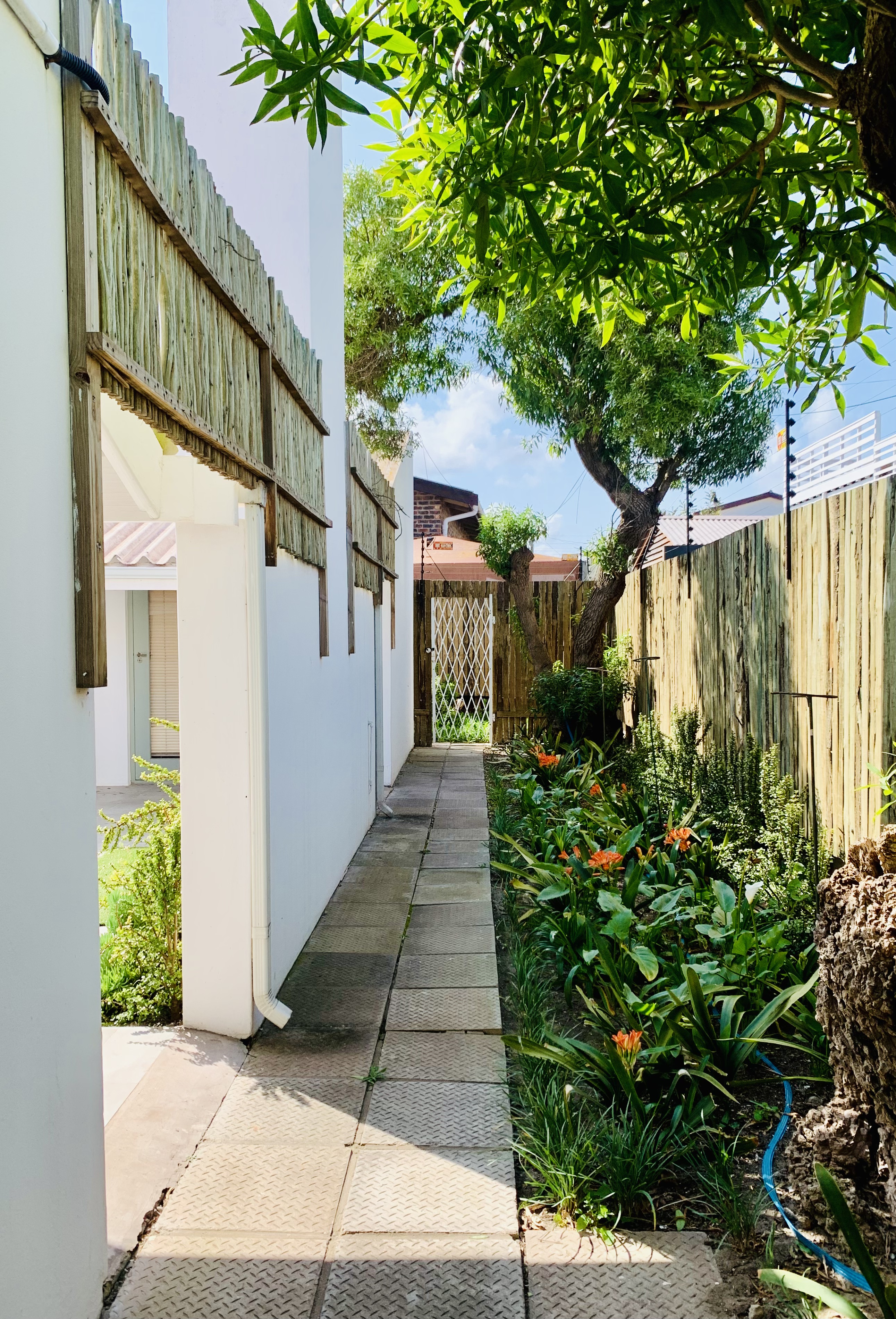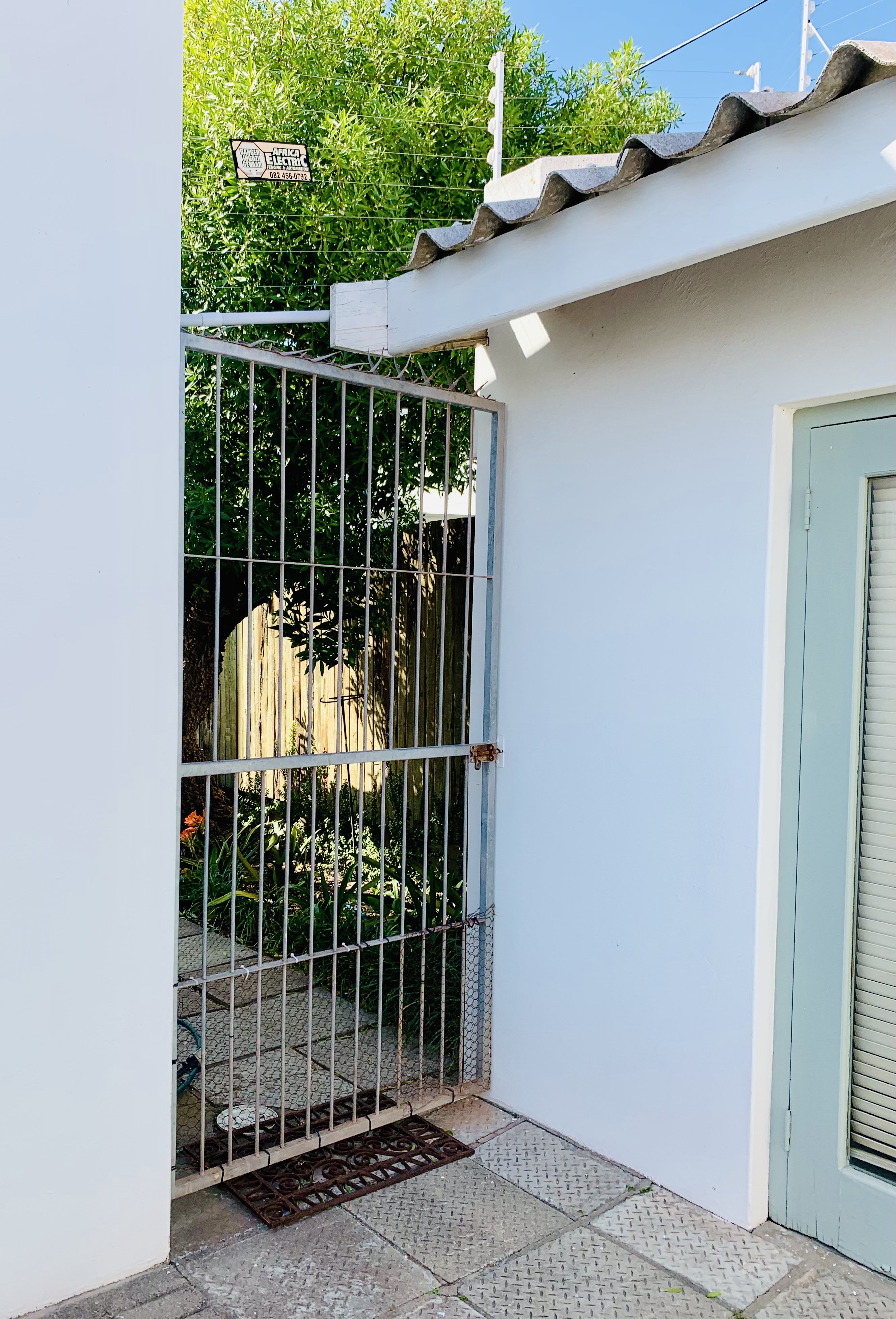 The yard is partly enclosed, featuring an electric gate at the parking area, with a pathway that meanders through a narrow garden at the back, enhancing the area’s charm, complete with safety gates at both ends.
