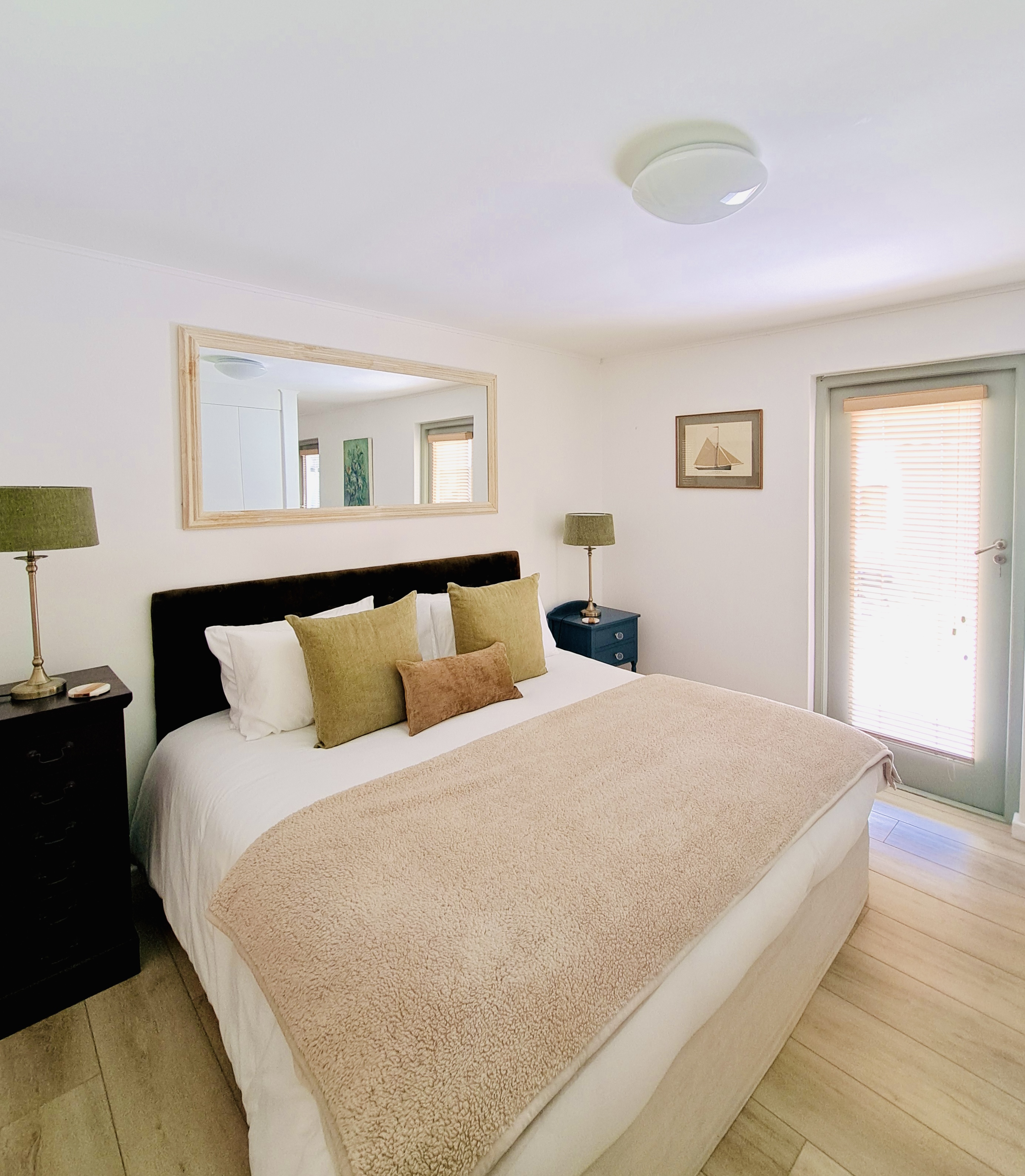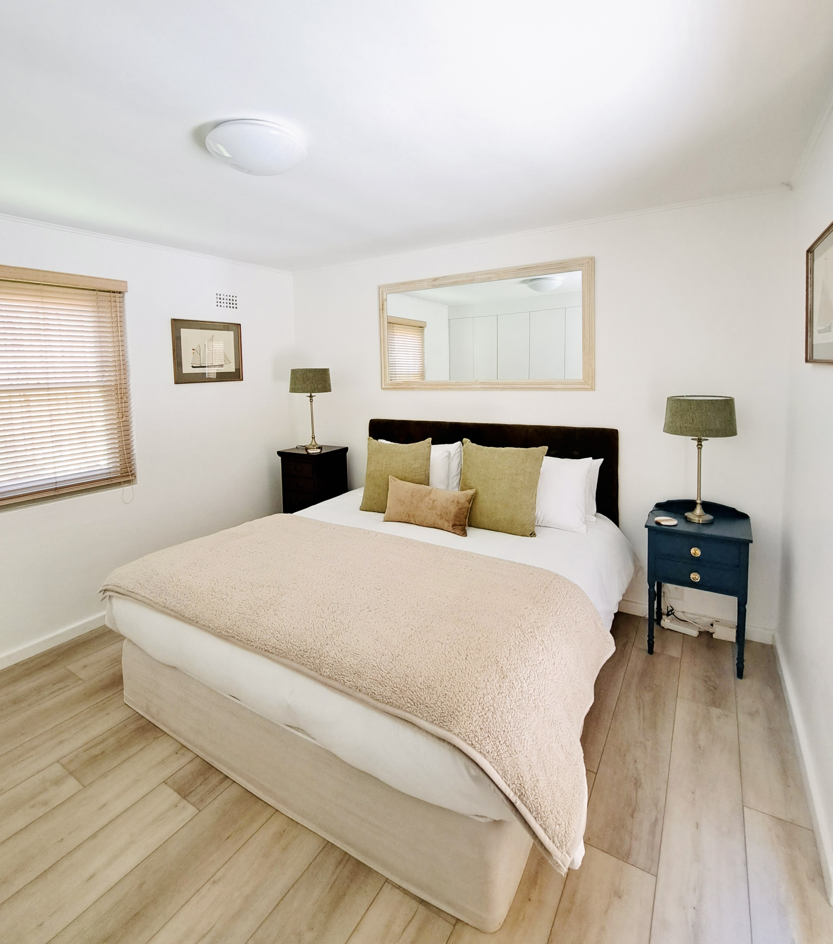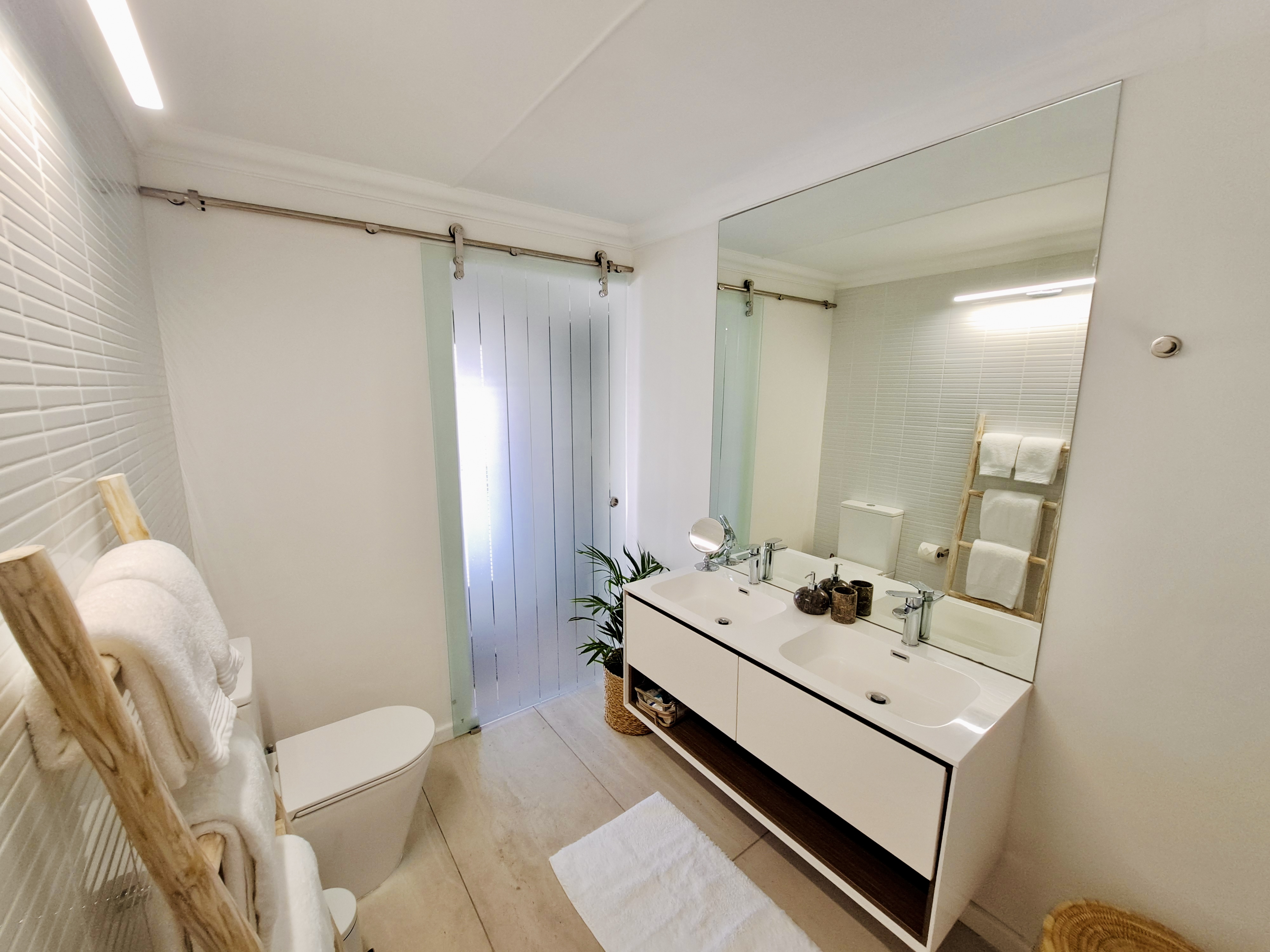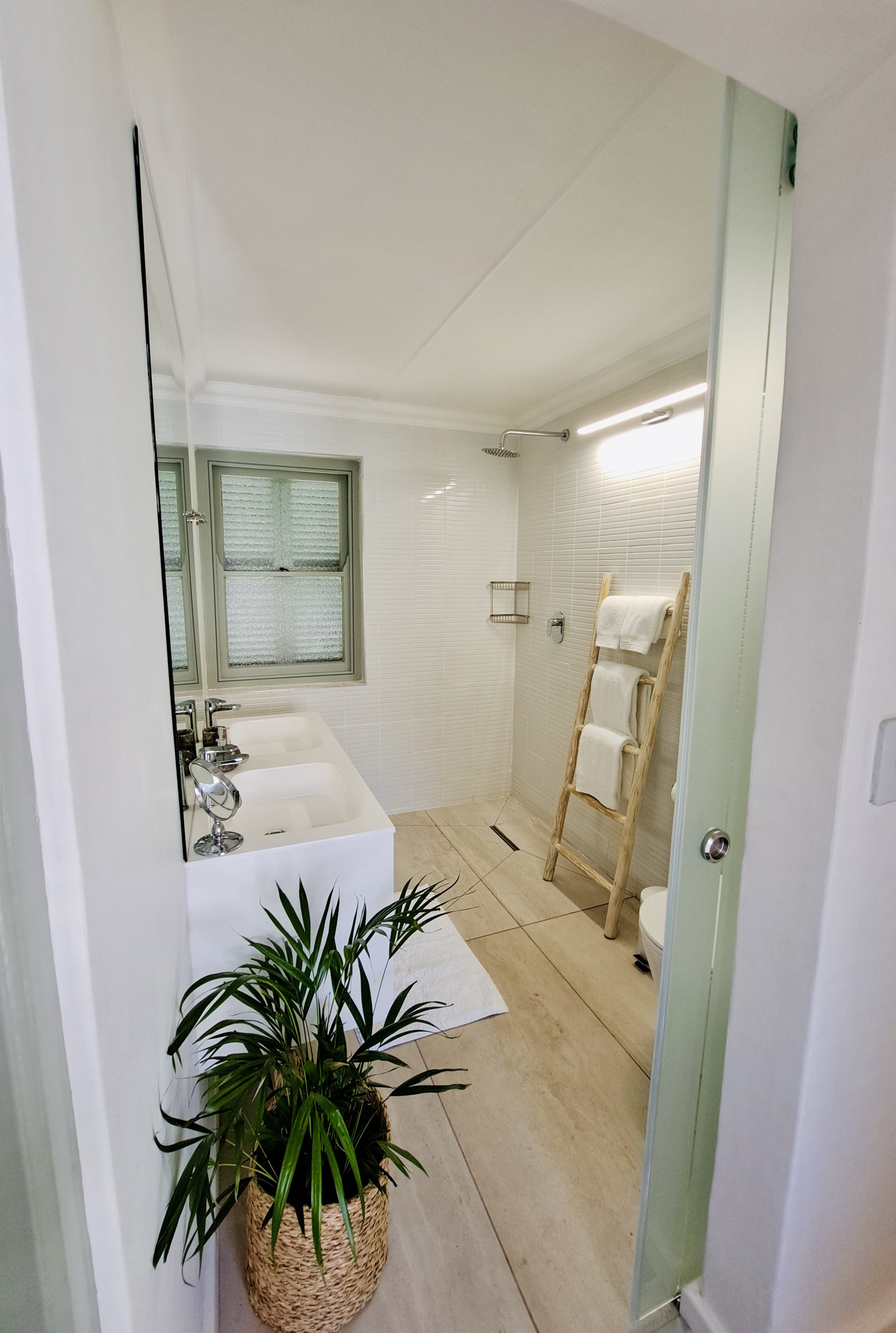 All three bedrooms in the main house allows direct access to the courtyard. A king-size bed is provided in the master bedroom, queen-size and double bed respectively the two guest bedrooms, and a queen-size bed in the flatlet. The master bedroom's en-suite bathroom features a double vanity and a modern wet room shower, enhancing the spacious feel. The two guest bathroom, serving the guest bedrooms, has a similar configuration with a single vanity, while the flatlet includes a walk-in shower cubicle.