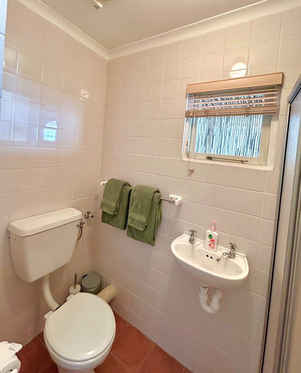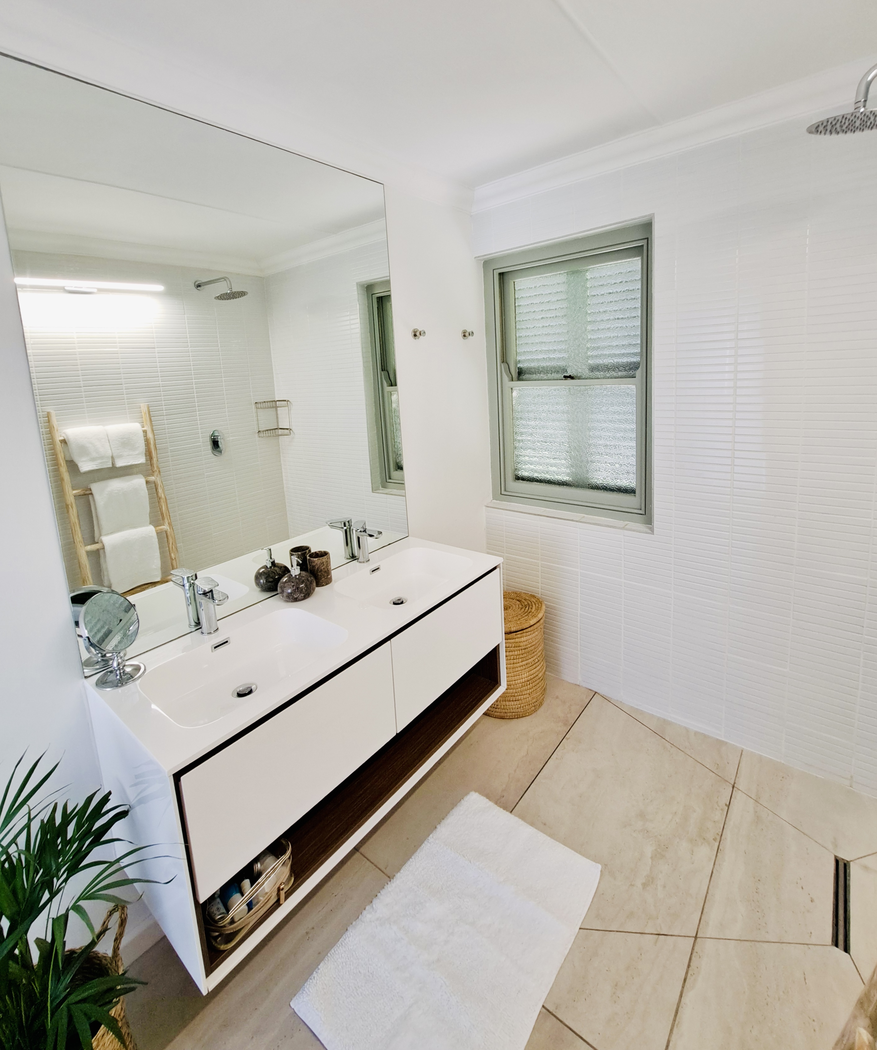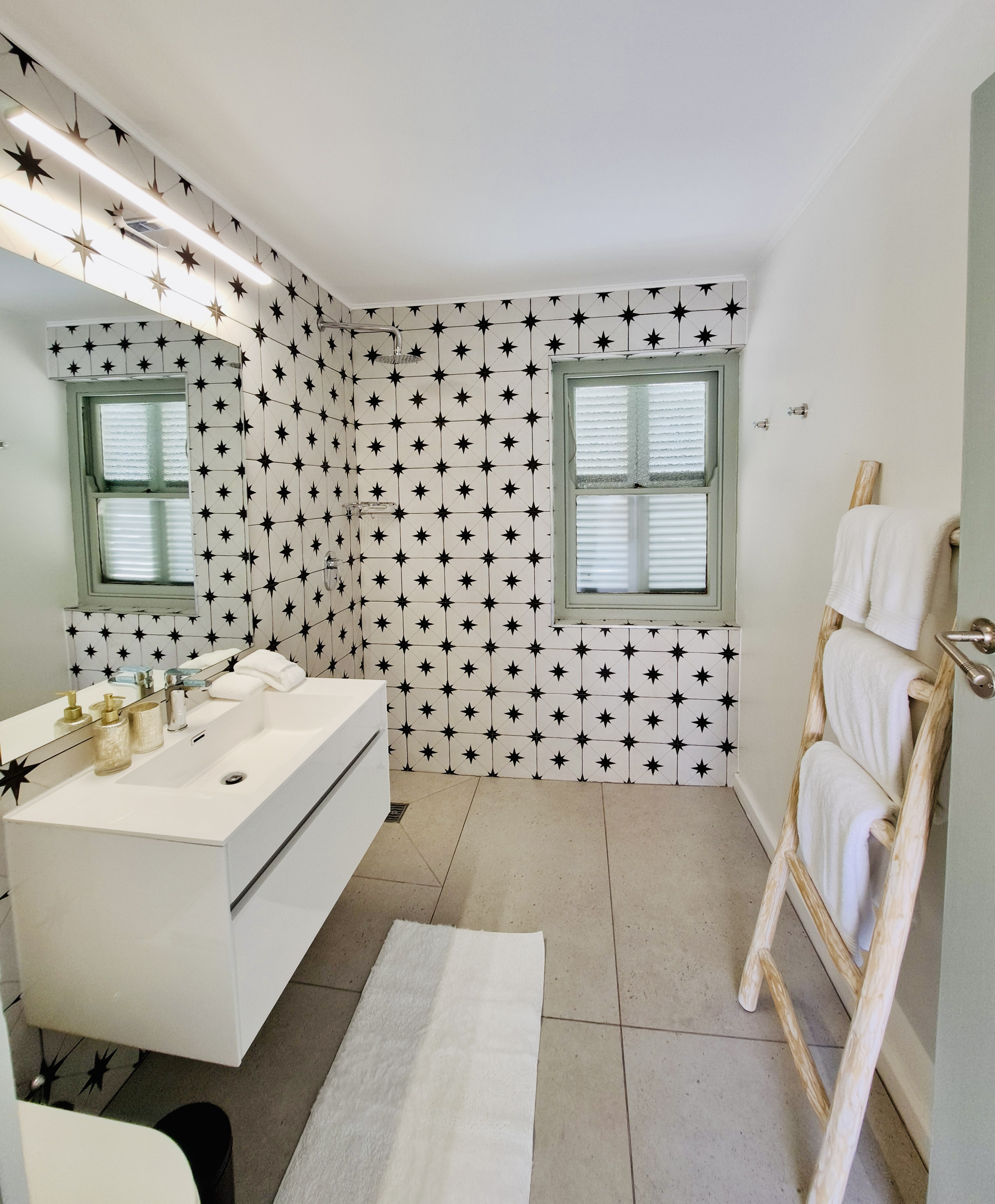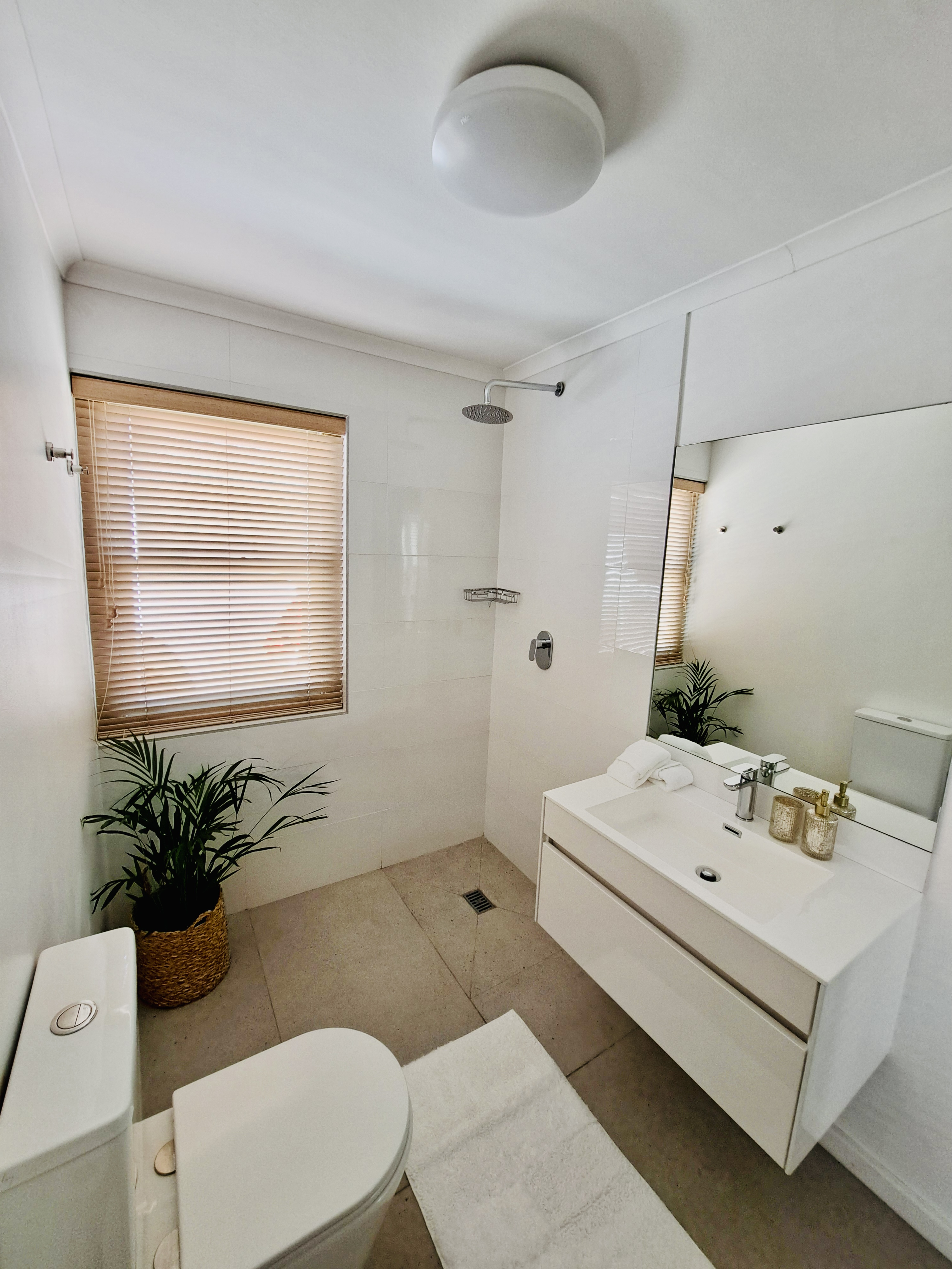 All three bedrooms in the main house allows direct access to the courtyard. A king-size bed is provided in the master bedroom, queen-size and double bed respectively the two guest bedrooms, and a queen-size bed in the flatlet. The master bedroom's en-suite bathroom features a double vanity and a modern wet room shower, enhancing the spacious feel. The two guest bathroom, serving the guest bedrooms, has a similar configuration with a single vanity, while the flatlet includes a walk-in shower cubicle.
