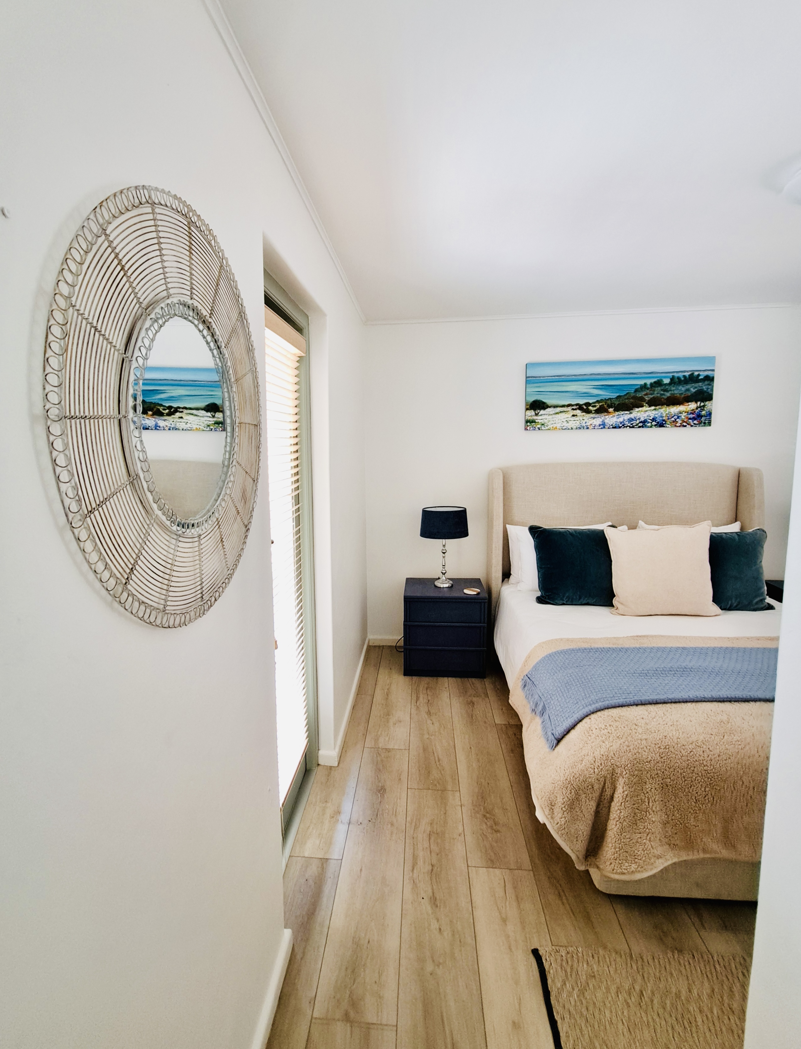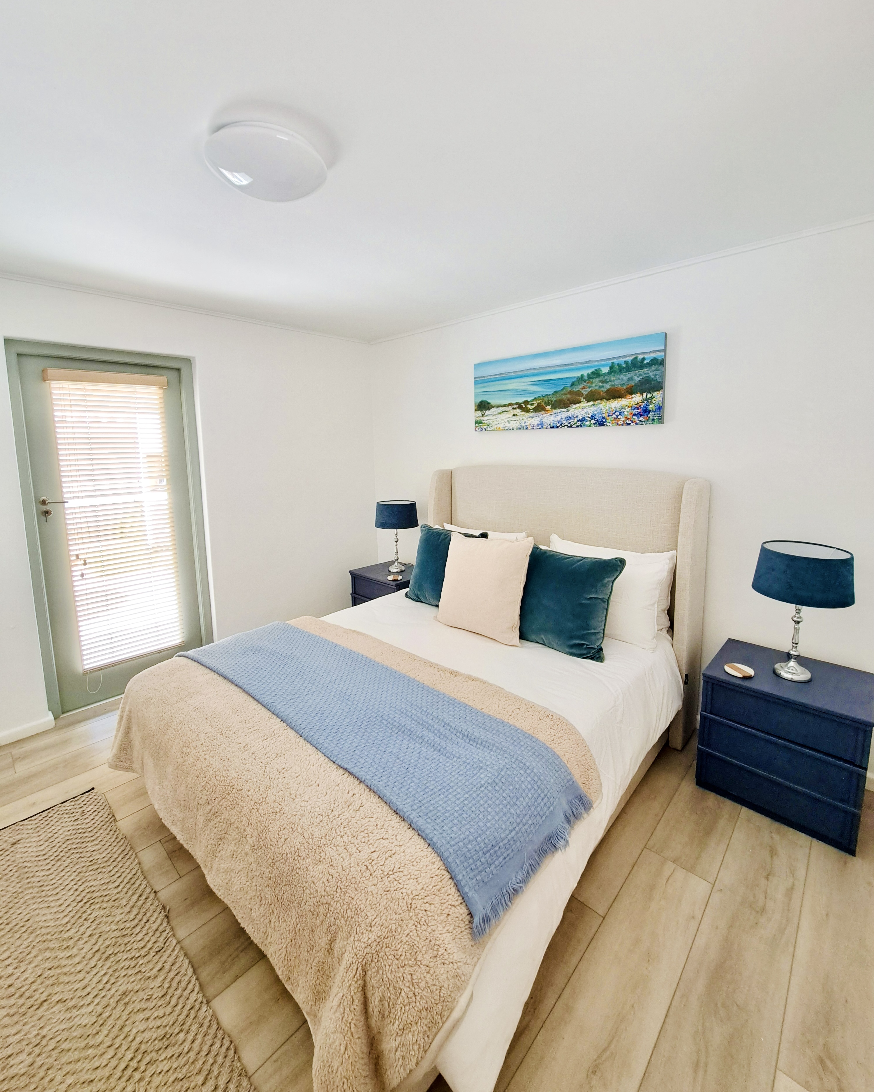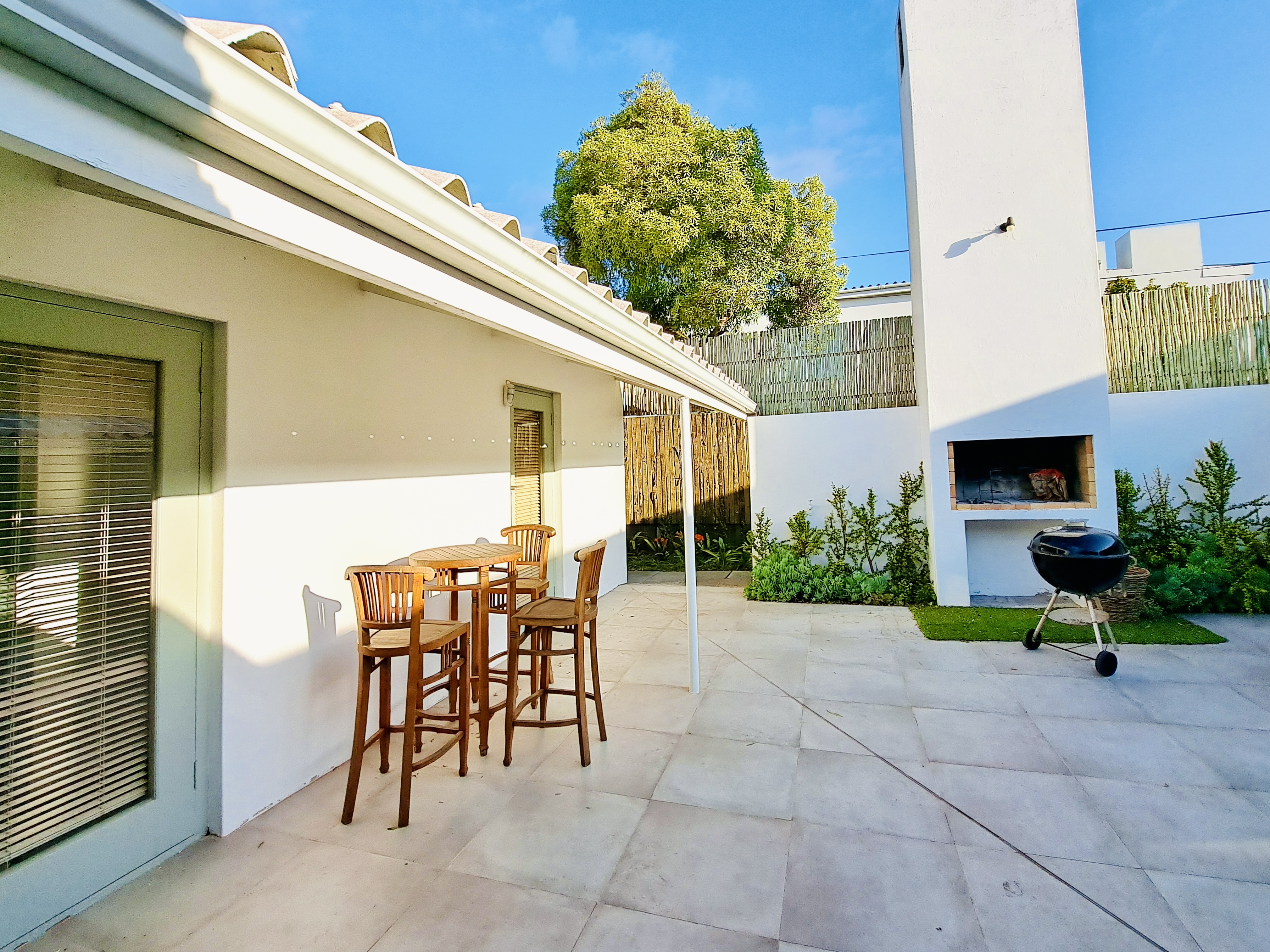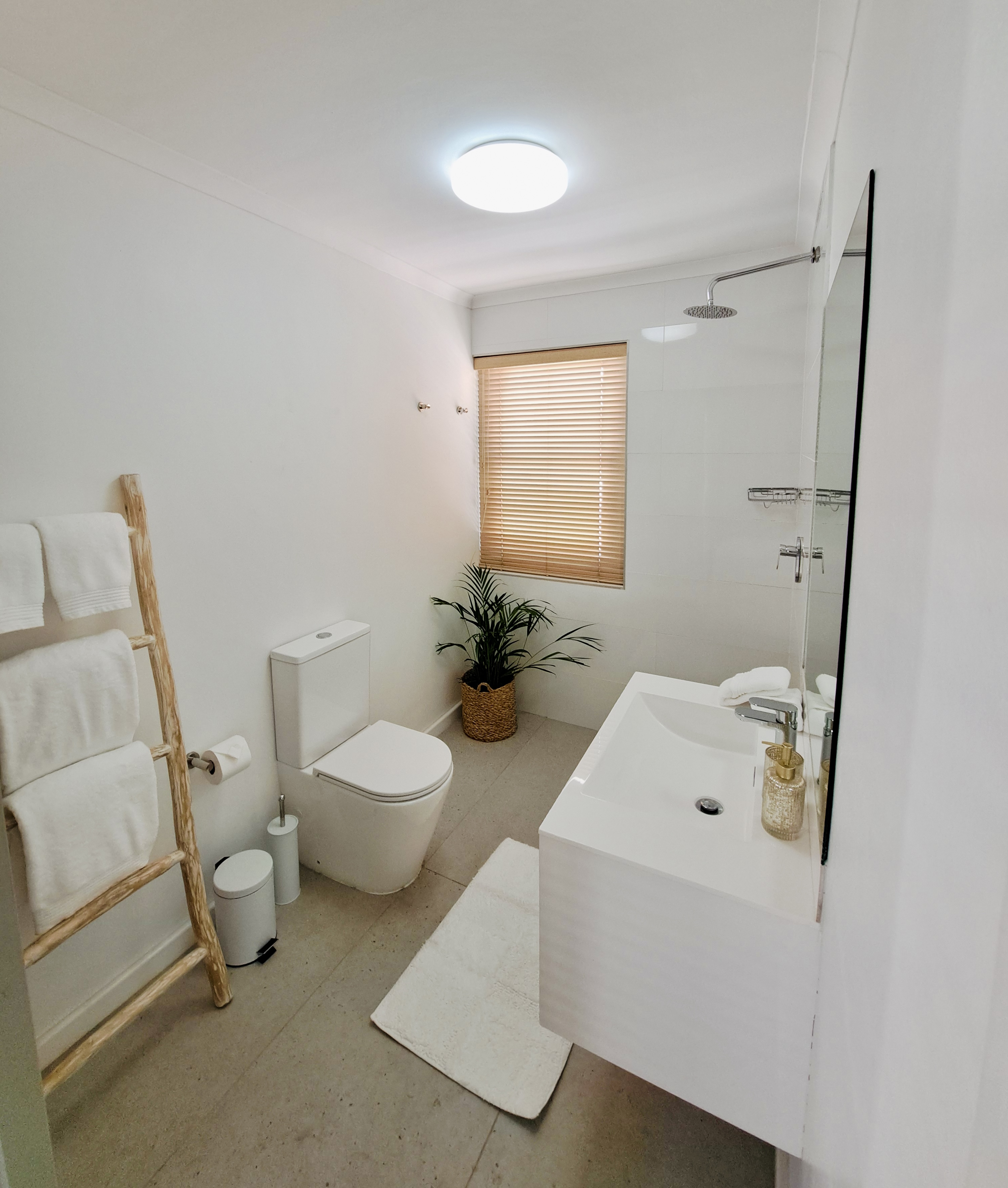 All three bedrooms in the main house allows direct access to the courtyard. A king-size bed is provided in the master bedroom, queen-size and double bed respectively the two guest bedrooms, and a queen-size bed in the flatlet. The master bedroom's en-suite bathroom features a double vanity and a modern wet room shower, enhancing the spacious feel. The two guest bathroom, serving the guest bedrooms, has a similar configuration with a single vanity, while the flatlet includes a walk-in shower cubicle.