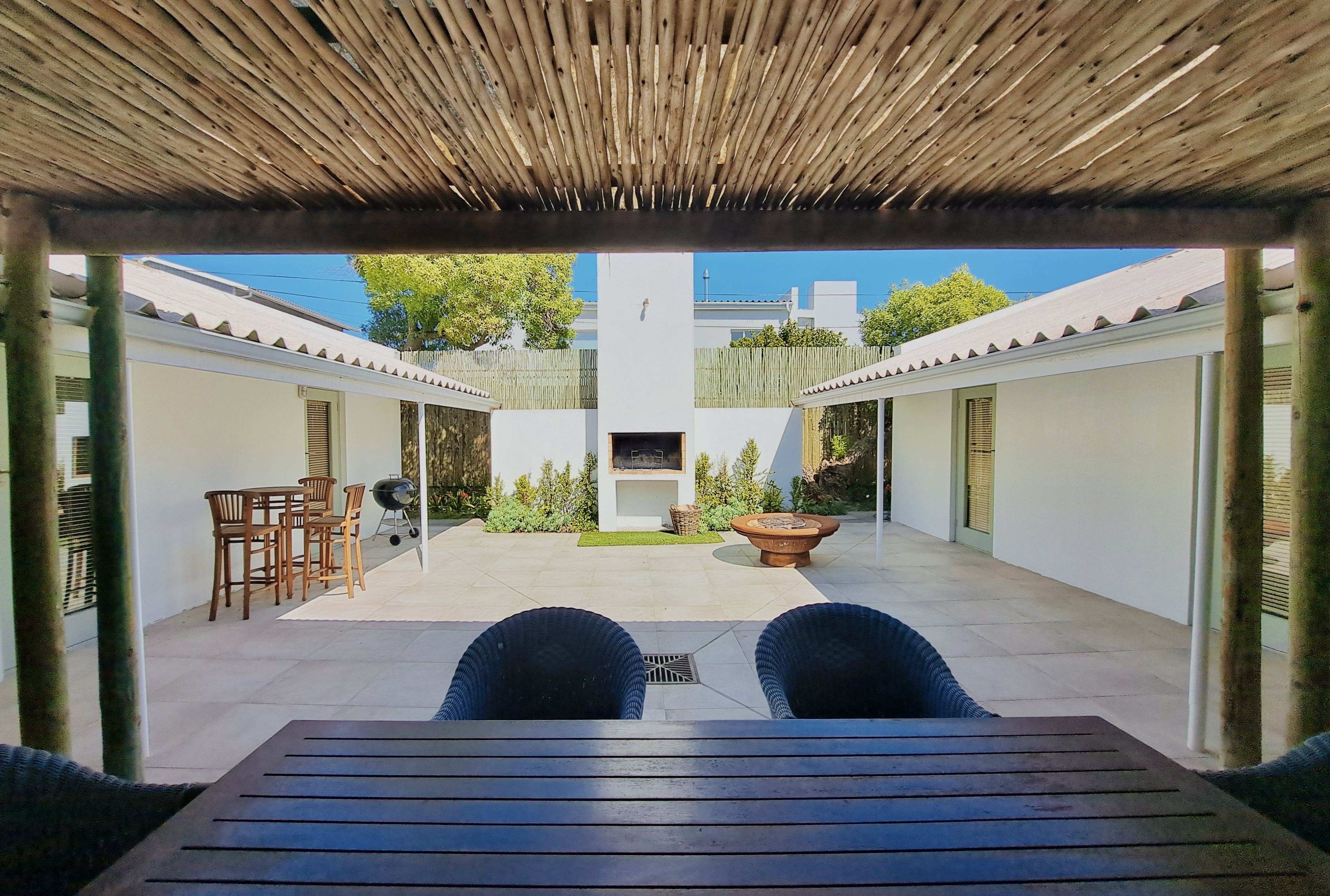 The enclosed courtyard is thoughtfully designed, with a roof that follows and complements the U-shaped architecture, creating the delightful, sheltered patio ideal for outdoor relaxation.