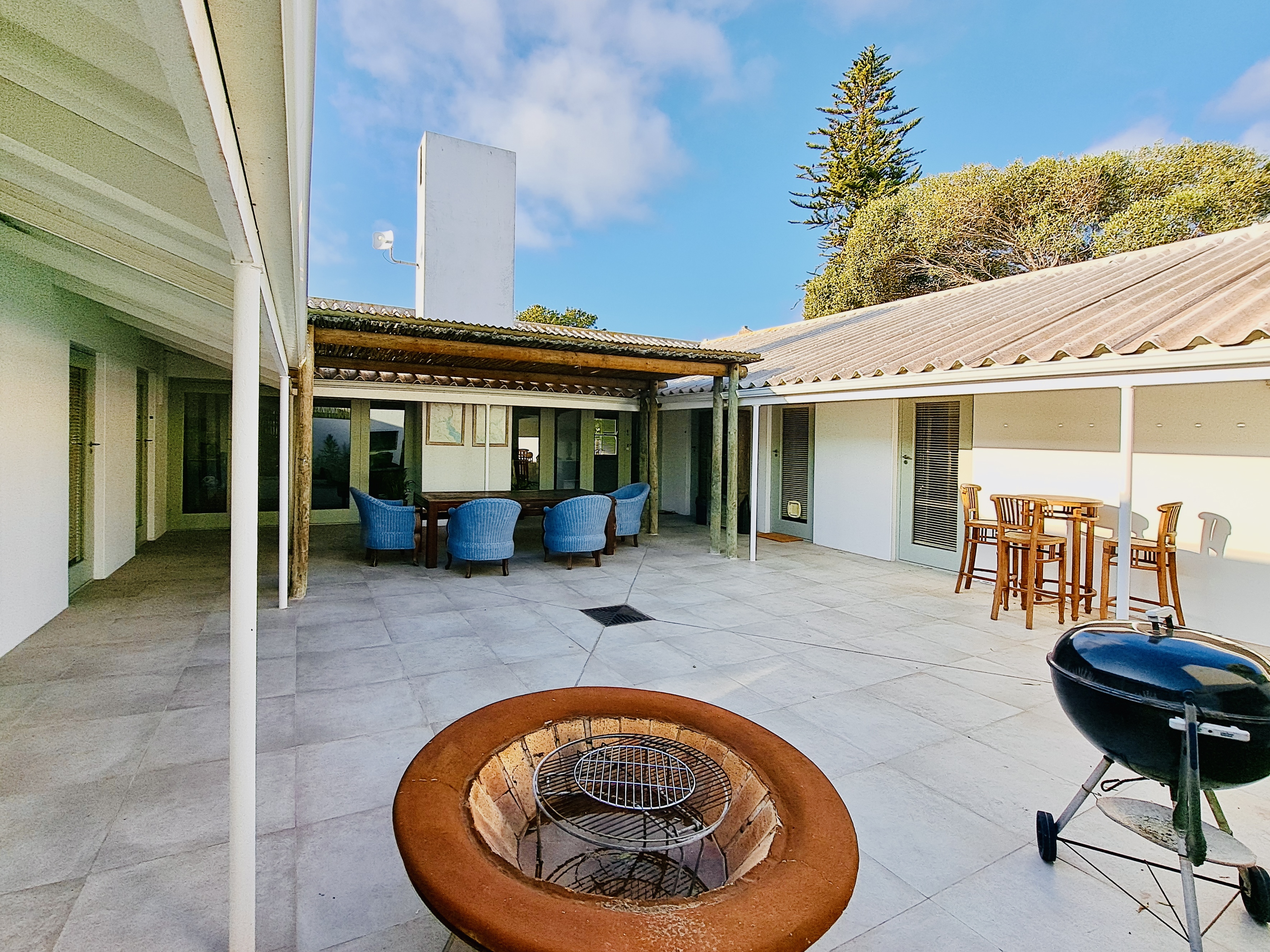 The residence boasts a distinctive U-shaped design, which creates a welcoming interior courtyard surrounded by the living area and bedrooms. Both the kitchen and living space feature stack-away doors that seamlessly open into the courtyard, allowing for easy access to this sheltered area, which is partially covered for year-round enjoyment, effectively merging indoor and outdoor living.