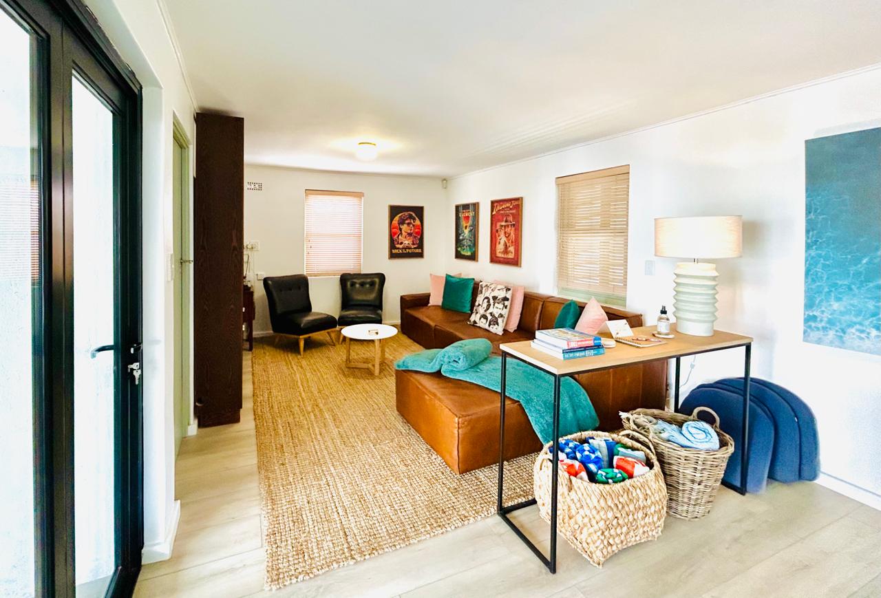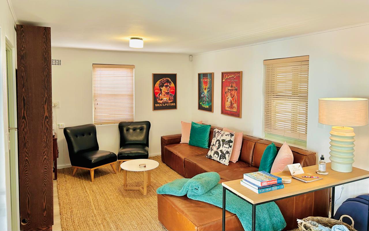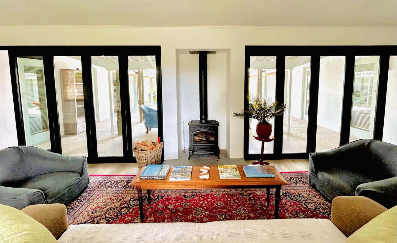 Inside, there are two open-plan lounge areas. Upon entering through a wide barn-style wooden door, you are greeted by the main lounge area, which offers views of the courtyard accessible via the stack-away sliding doors. The second lounge area, part of the open-plan design, serves as a peaceful reading nook.