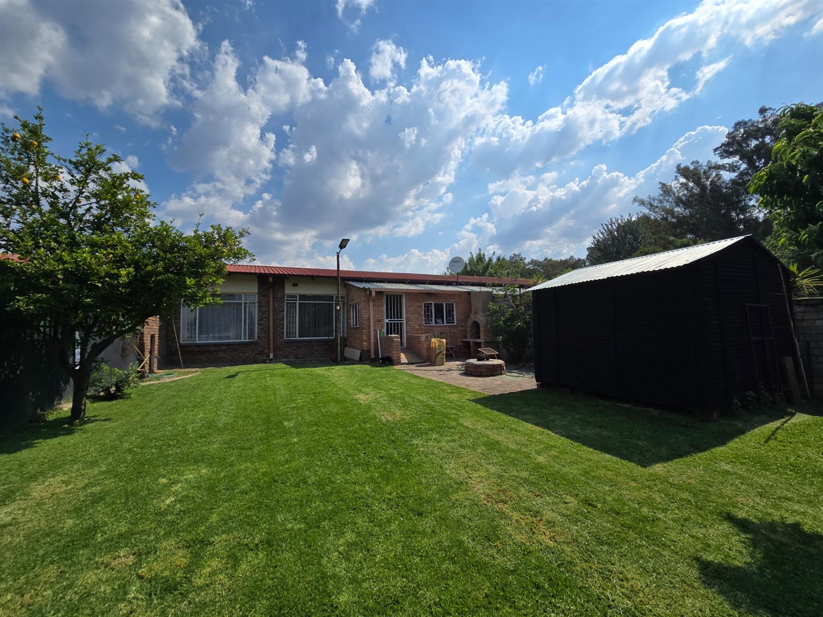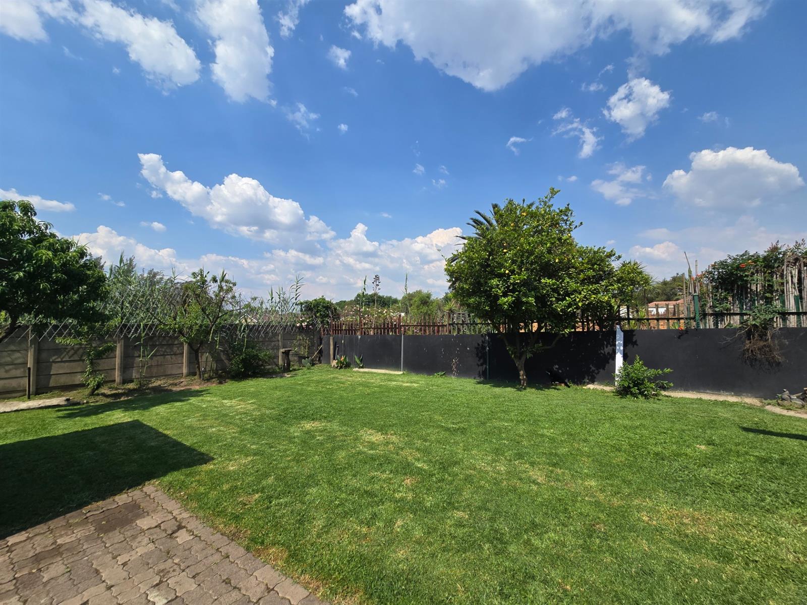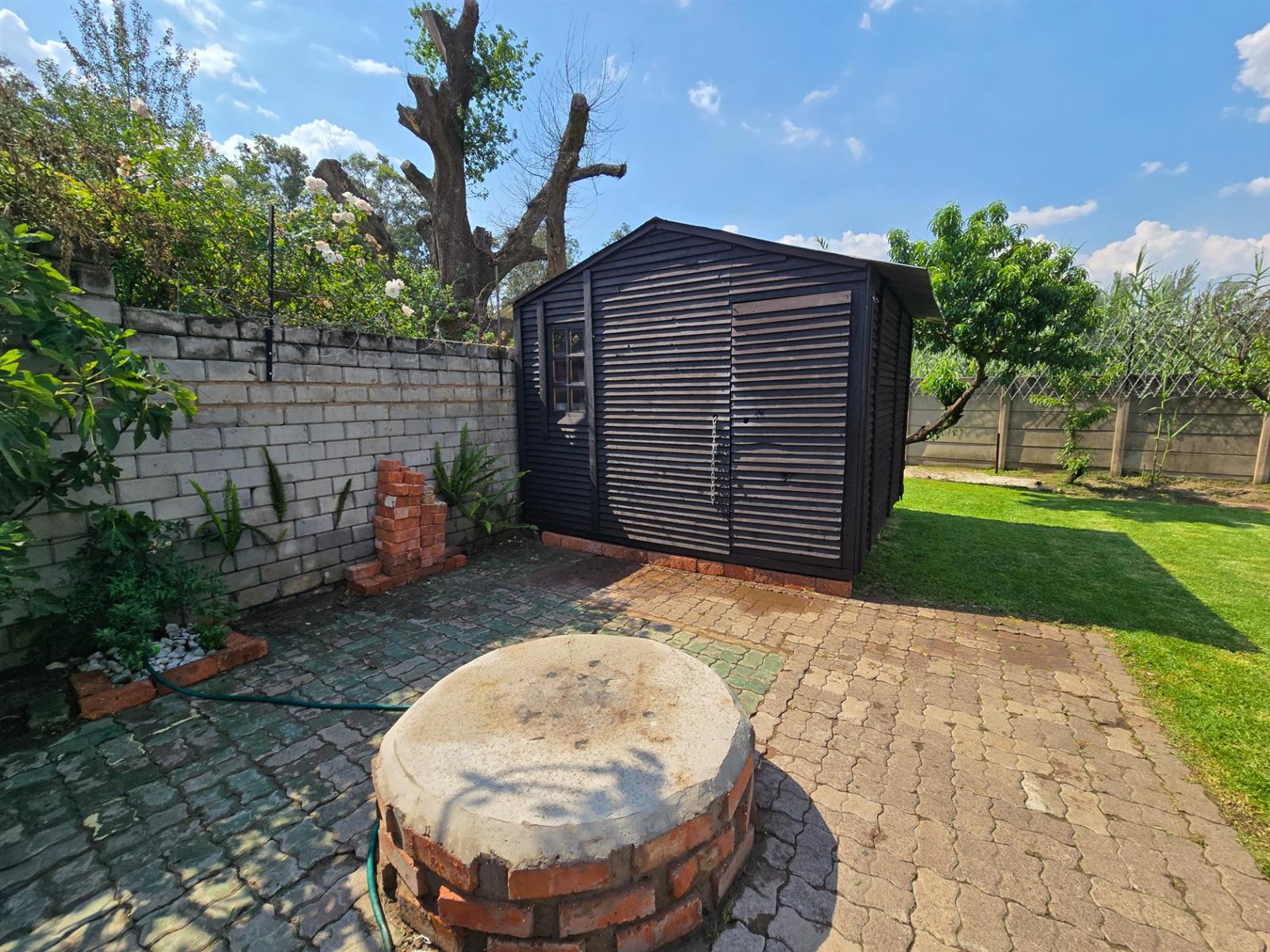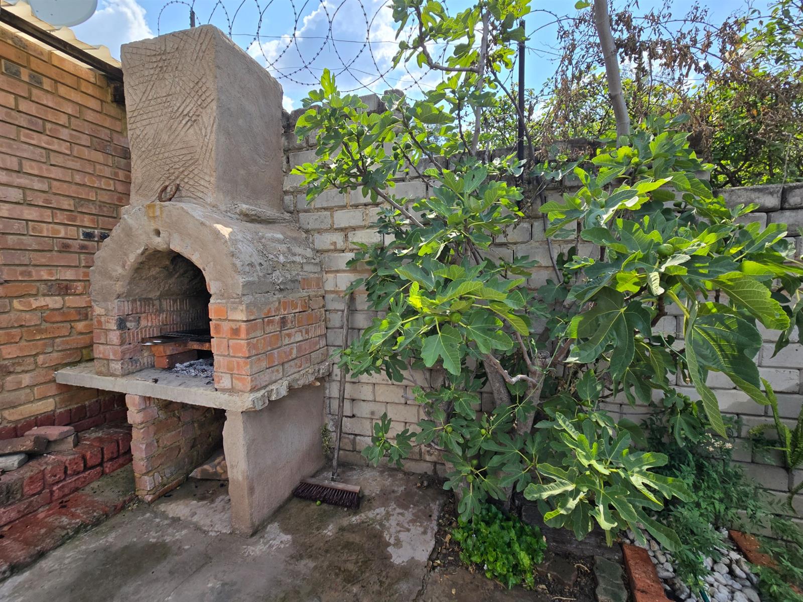 Flowing from the living area is a delightful sunroom, an ideal space to enjoy the warmth of the sun throughout the year. This room opens out to a spacious and established garden featuring beautiful lemon, peach, and fig trees, creating a serene outdoor environment with a charming, almost countryside feel. The garden is complemented by a boma and an outside braai area, perfect for relaxed entertaining and memorable evenings with friends and family.