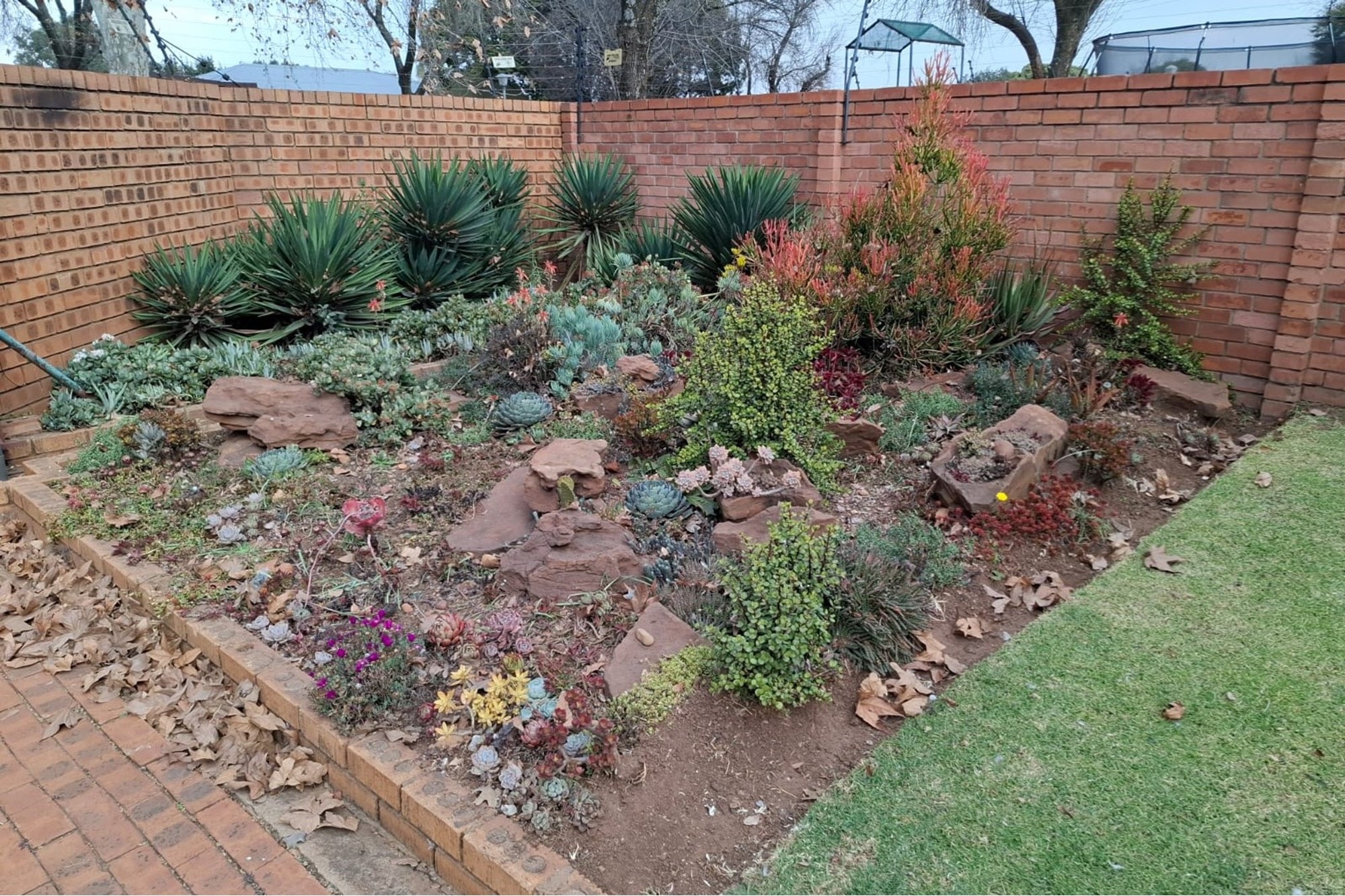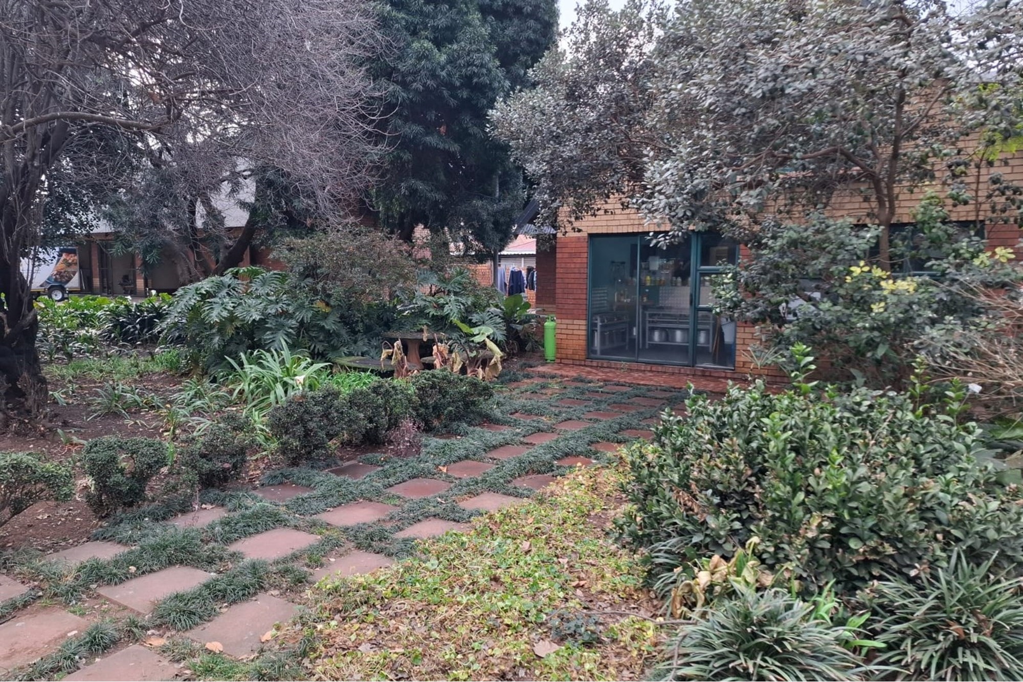 Well-kept, established garden with mature trees and lush greenery