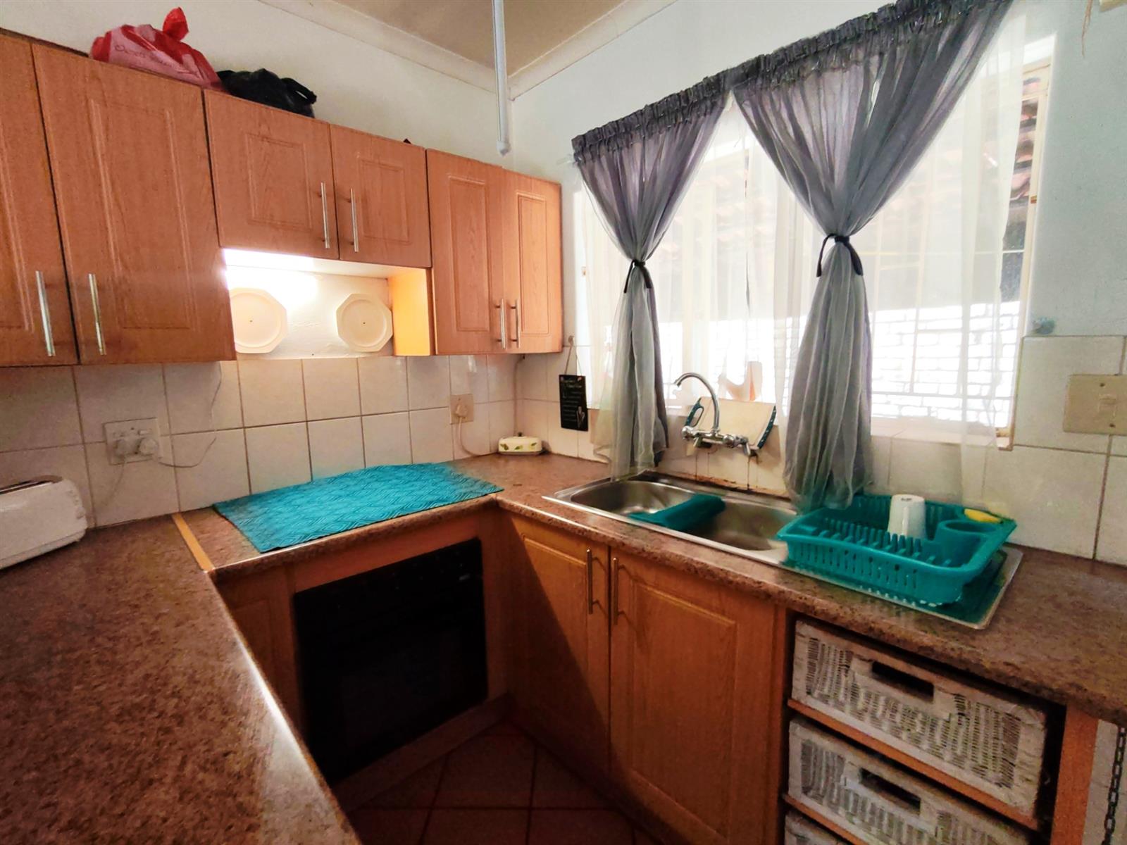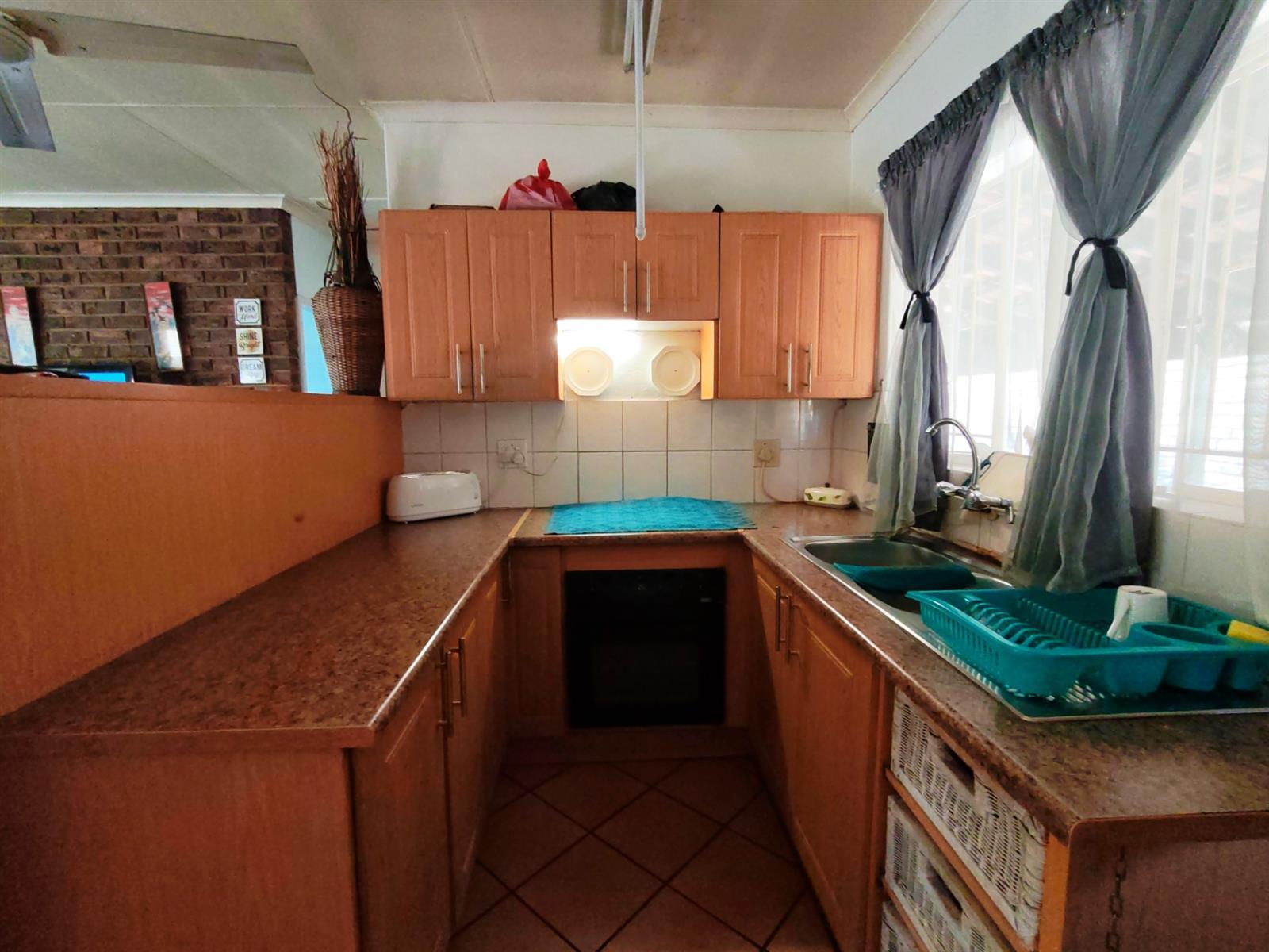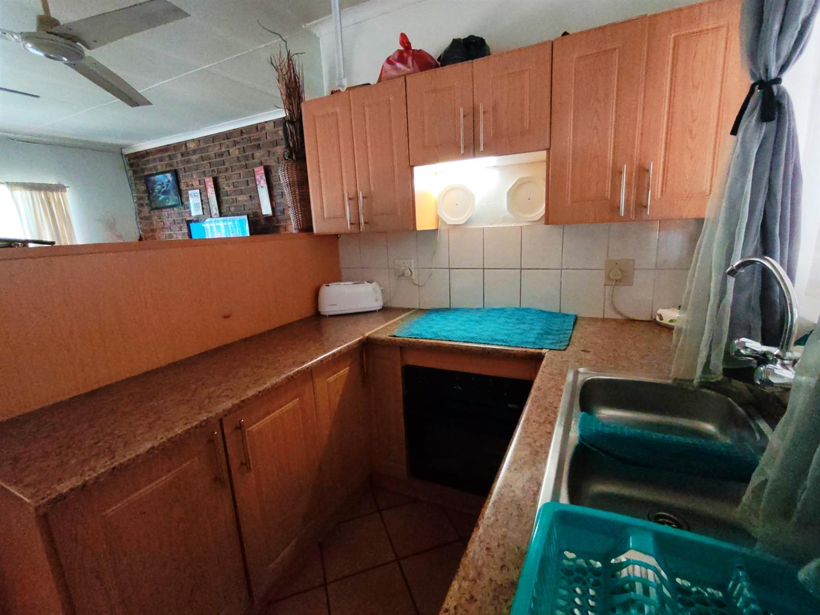 The kitchen has cupboards, laminated countertops and a breakfast nook. The undercounter oven and hob is electric. There is also a sink and basin.