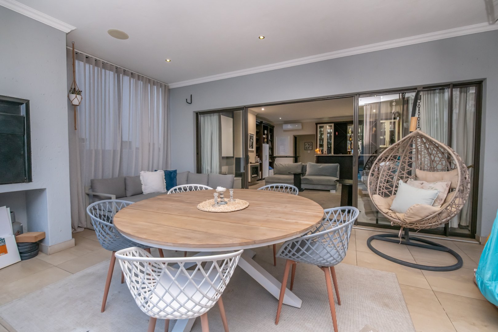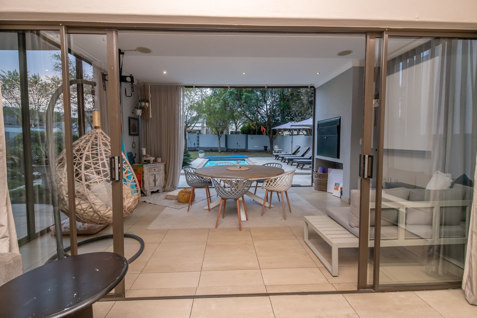 Enclosed entertainment patio with built-in braai and stacker doors opening to the pool