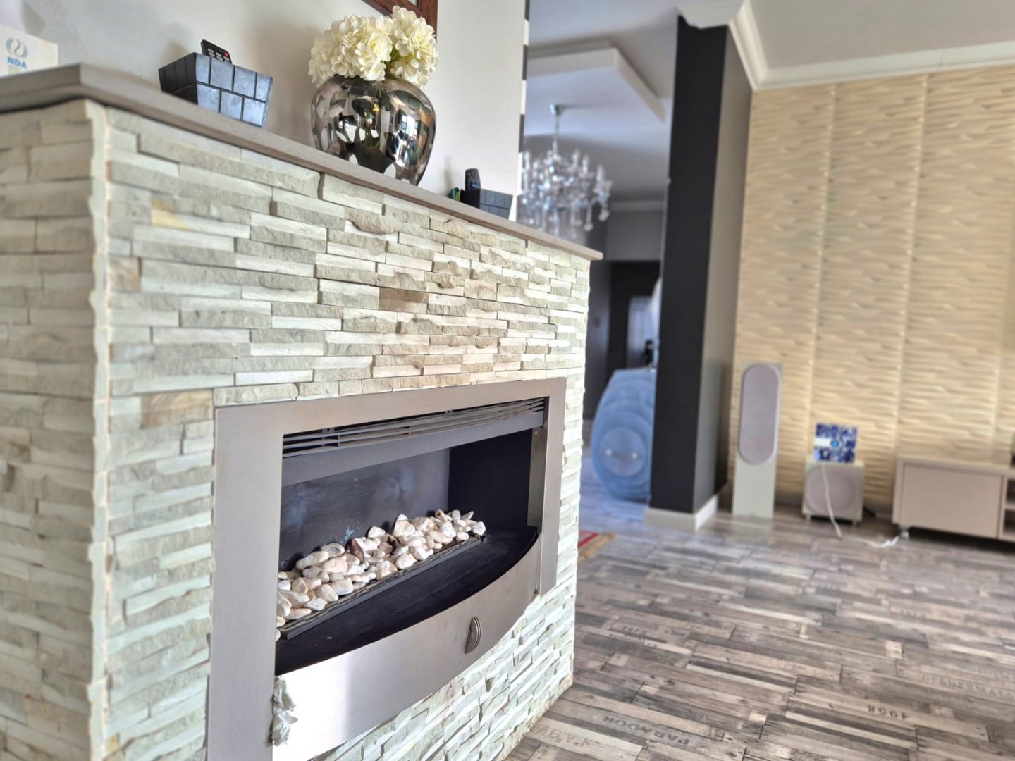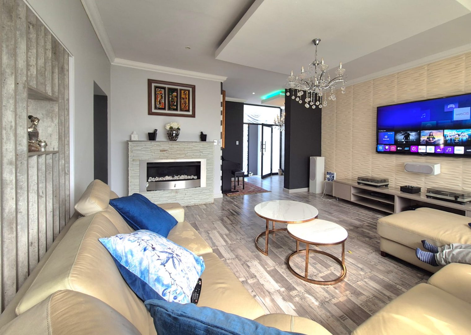 Step into a warm and inviting lounge complete with a gas fireplace, perfect for cozy evenings. The open-plan dining room flows effortlessly into a modern kitchen equipped with a scullery and a separate pantry.