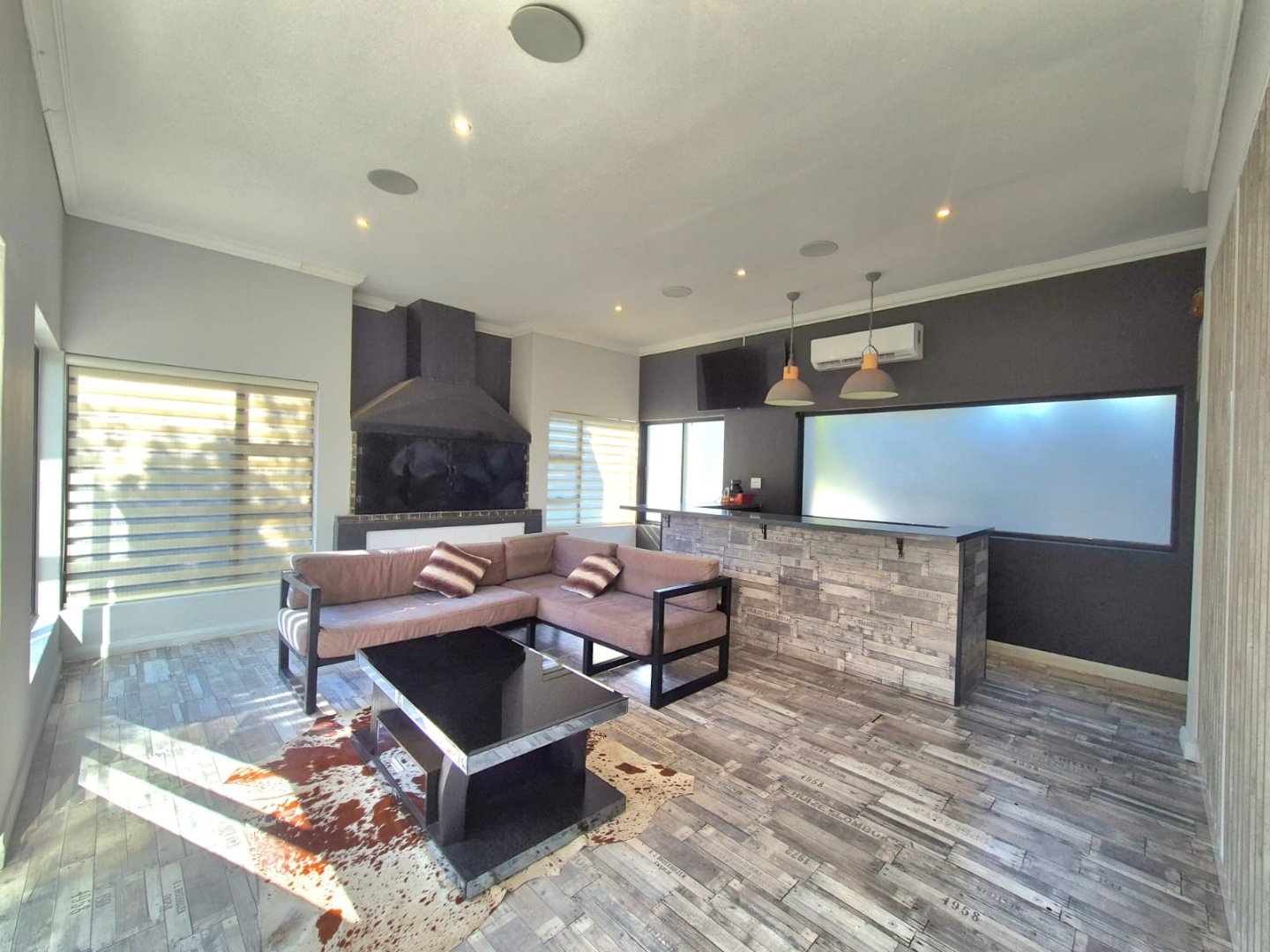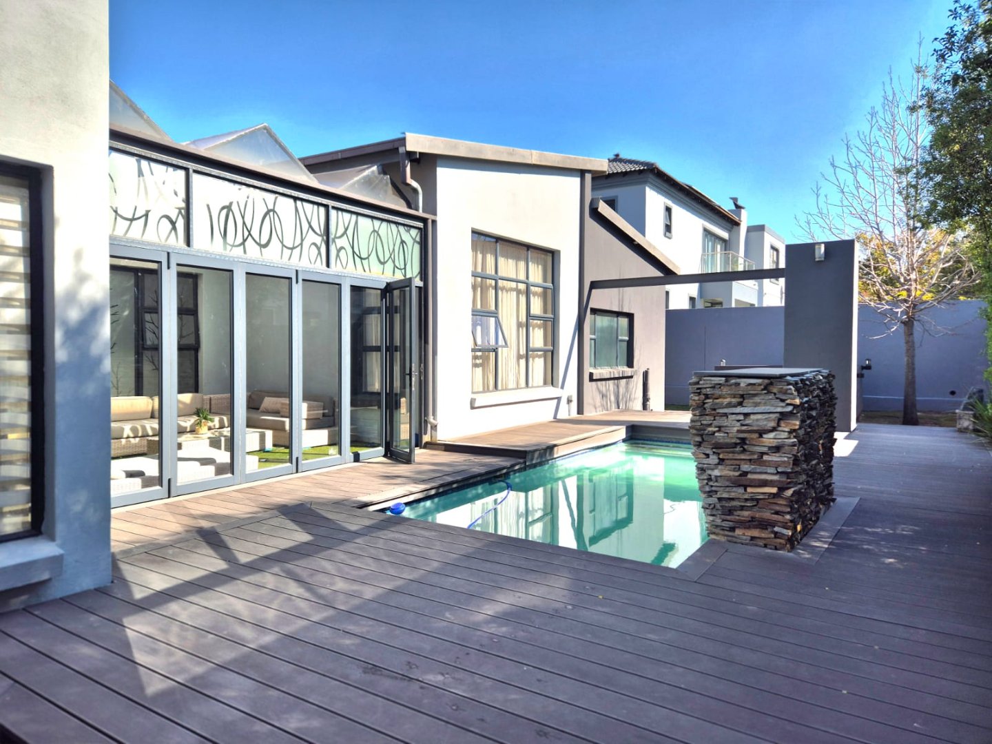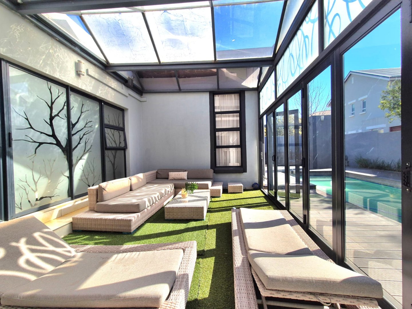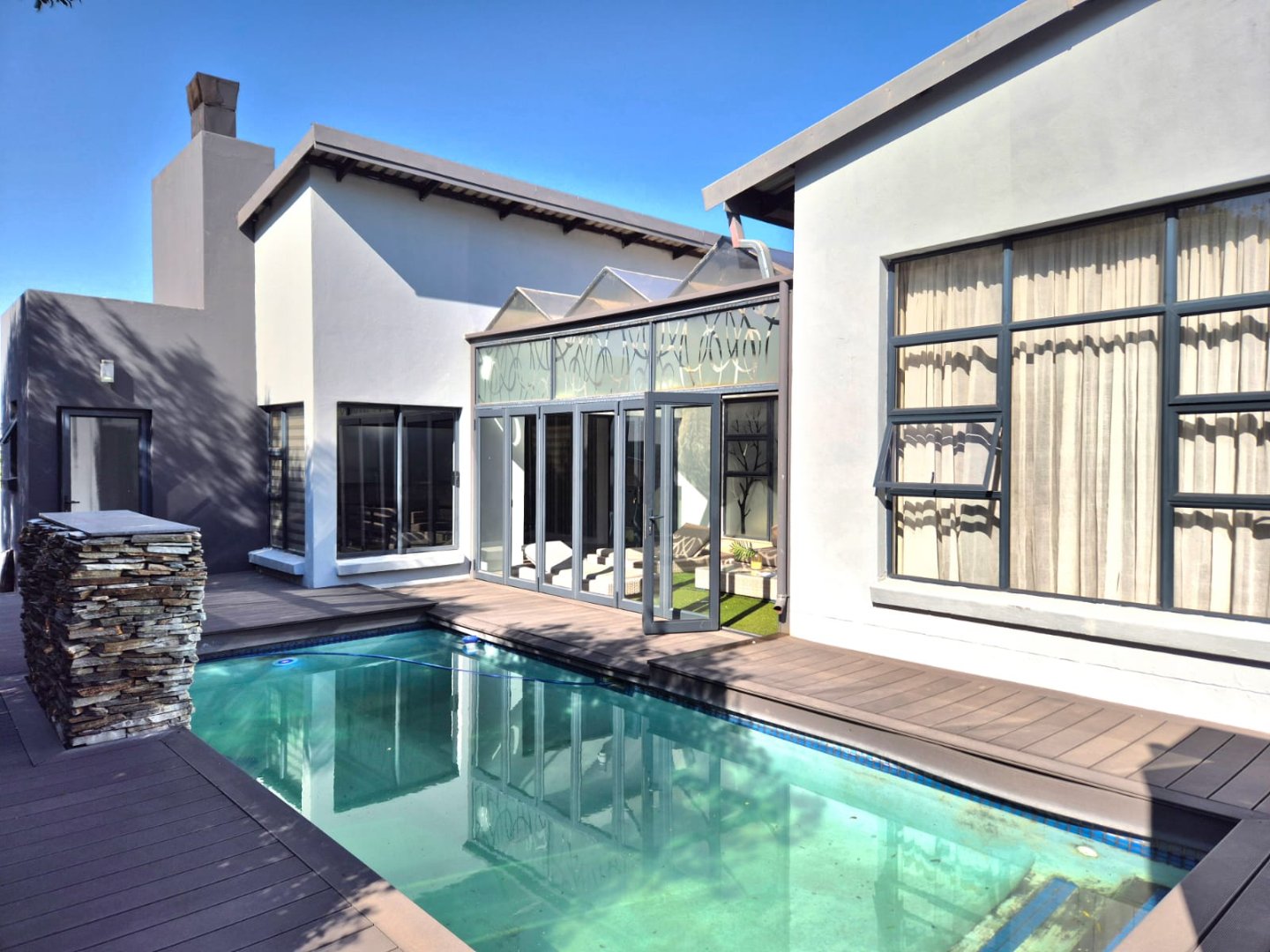 The entertainment room with a built-in braai leads into a bright sunroom that opens onto a stunning deck, where you’ll find a sparkling pool and a boma – perfect for year-round gatherings.