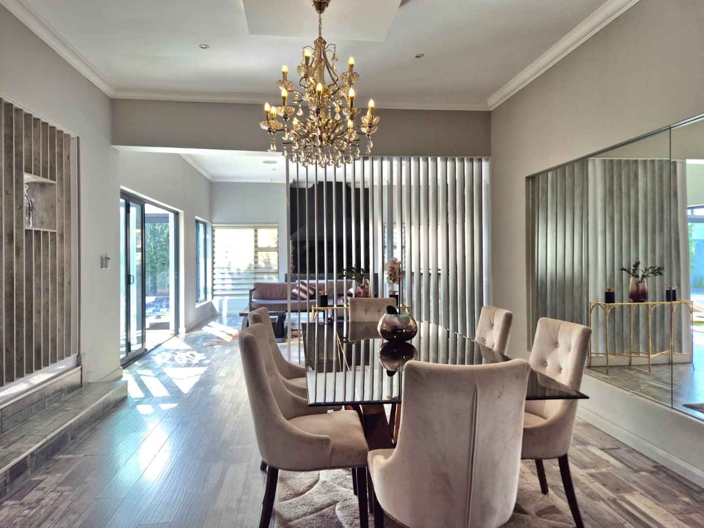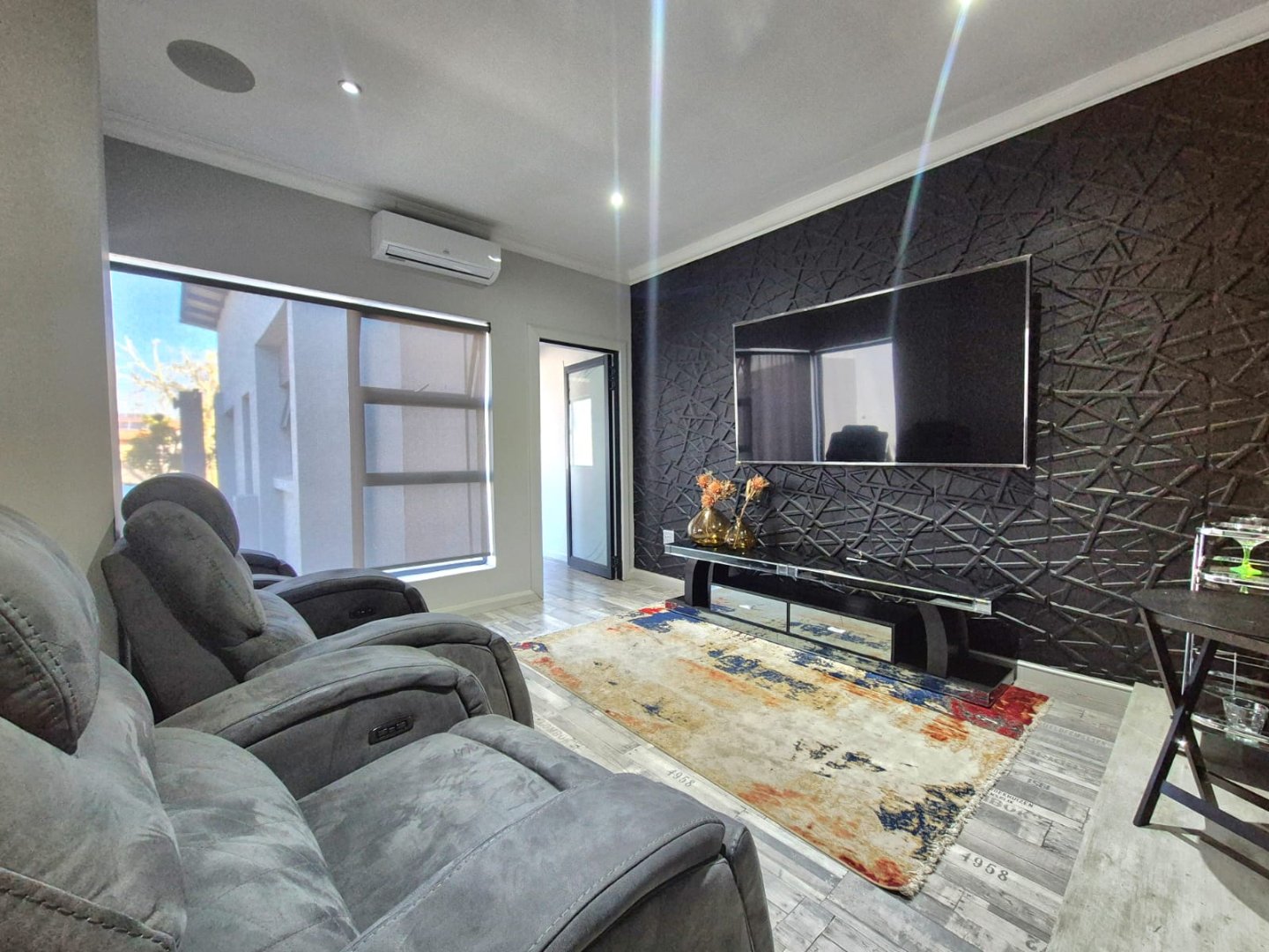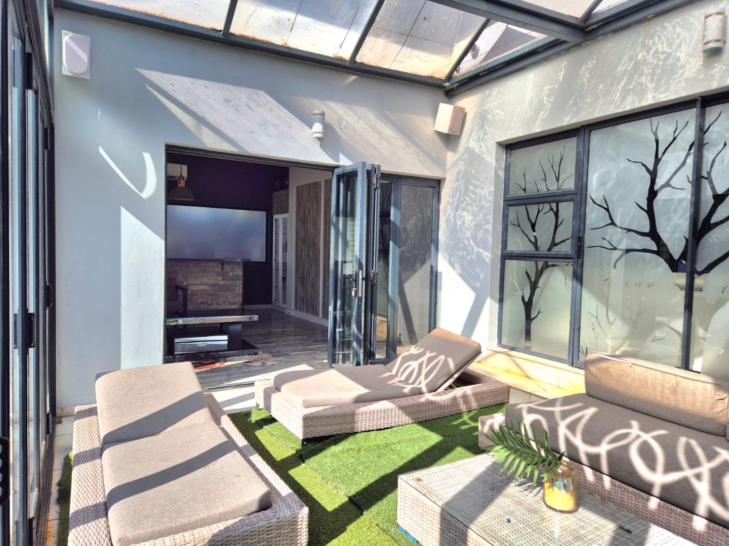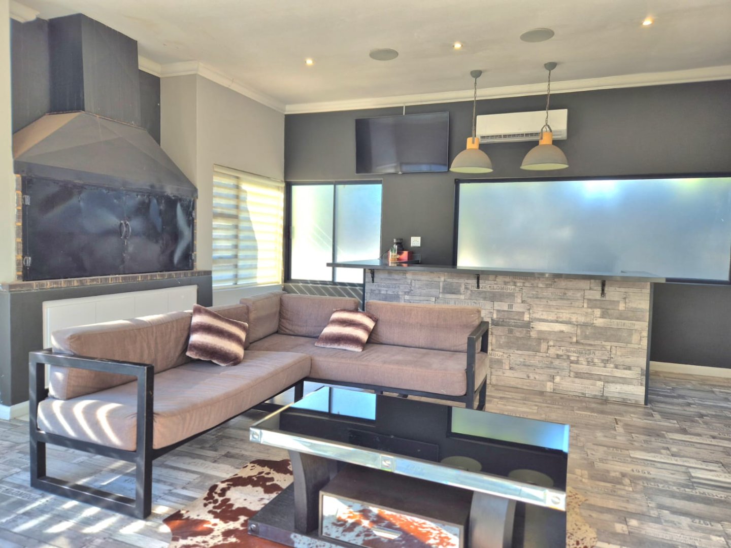 The entertainment room with a built-in braai leads into a bright sunroom that opens onto a stunning deck, where you’ll find a sparkling pool and a boma – perfect for year-round gatherings.