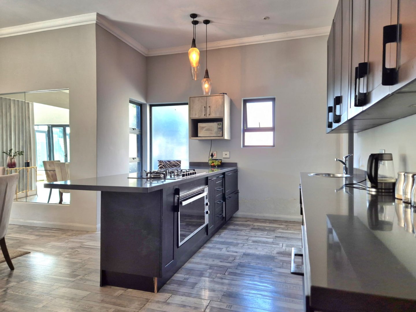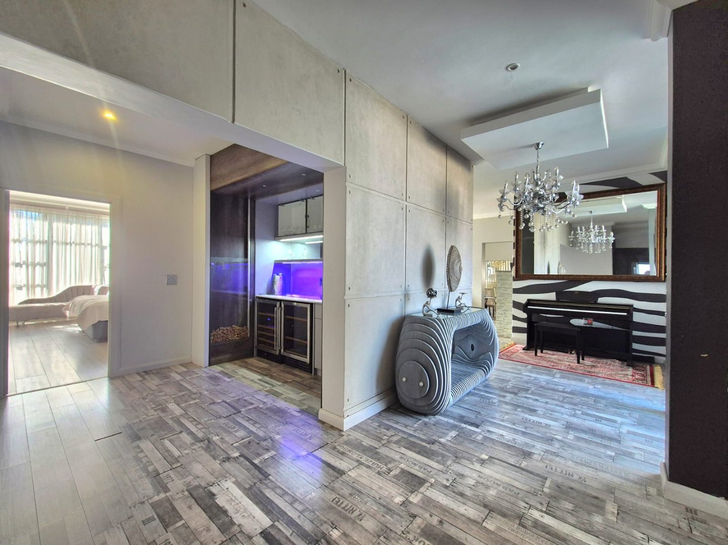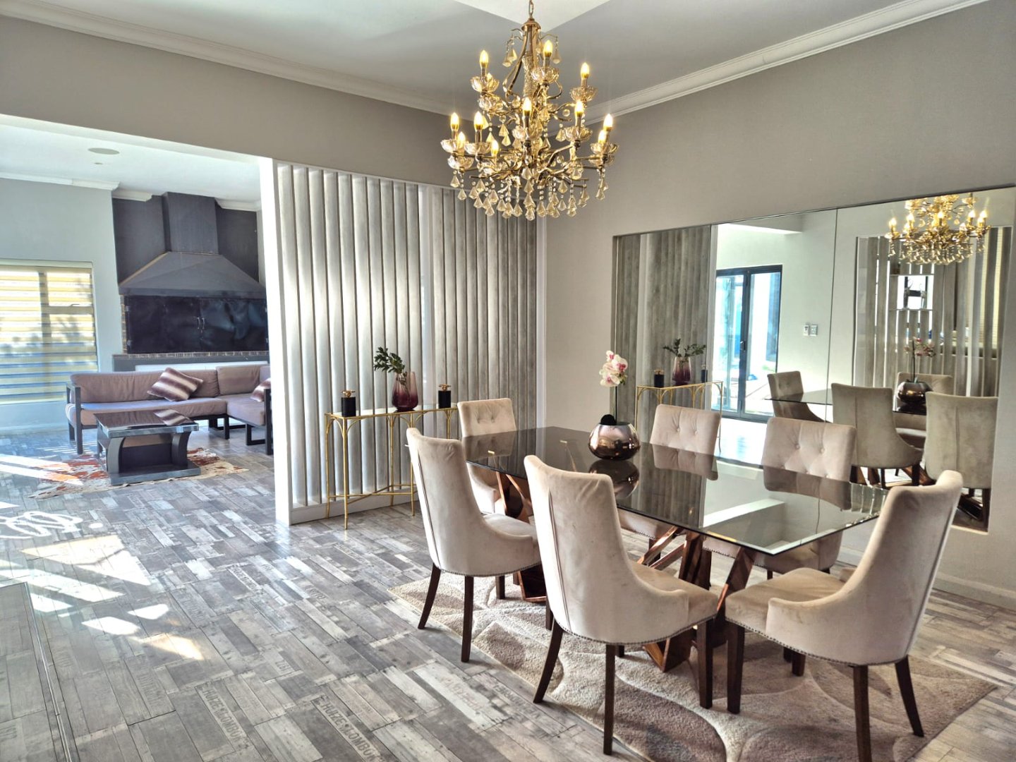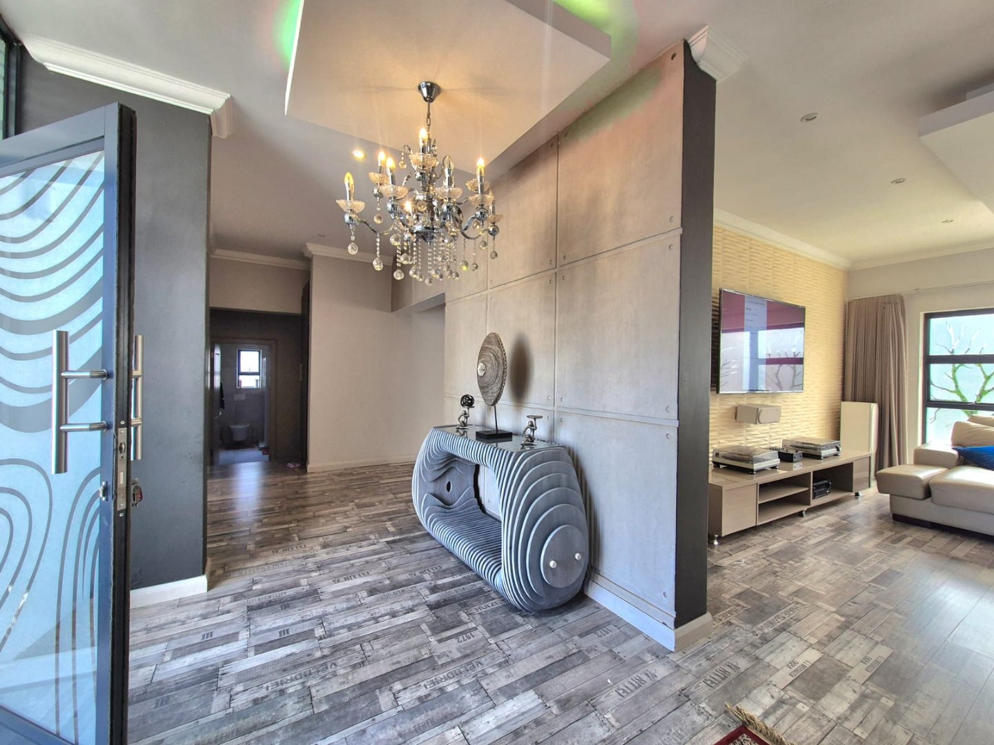 The entertainment room with a built-in braai leads into a bright sunroom that opens onto a stunning deck, where you’ll find a sparkling pool and a boma – perfect for year-round gatherings.
