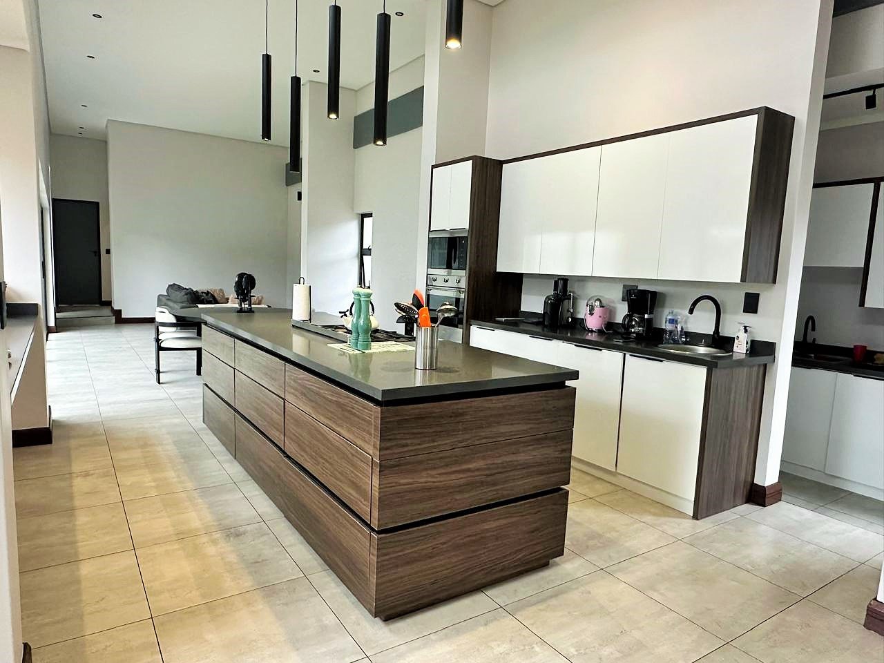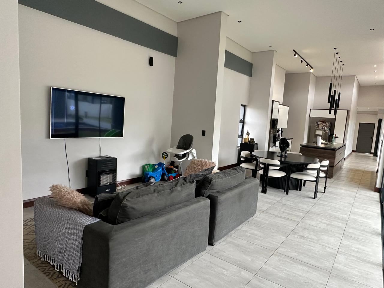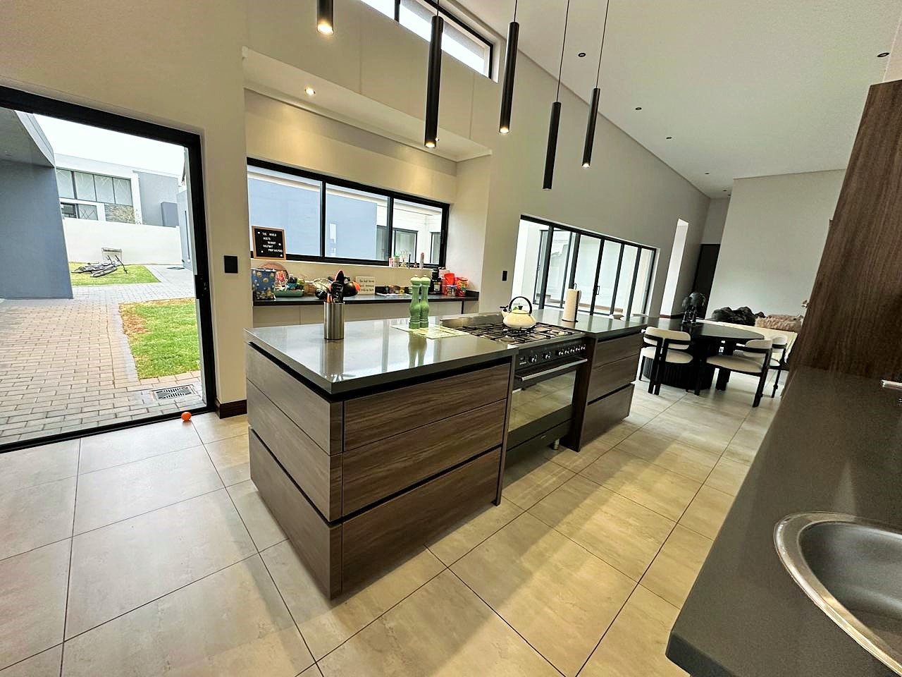 At the heart of the home lies an inviting open-plan living area that seamlessly blends the lounge, dining room, and a gourmet kitchen fitted with premium gas appliances and a separate scullery.