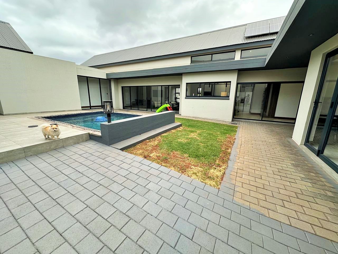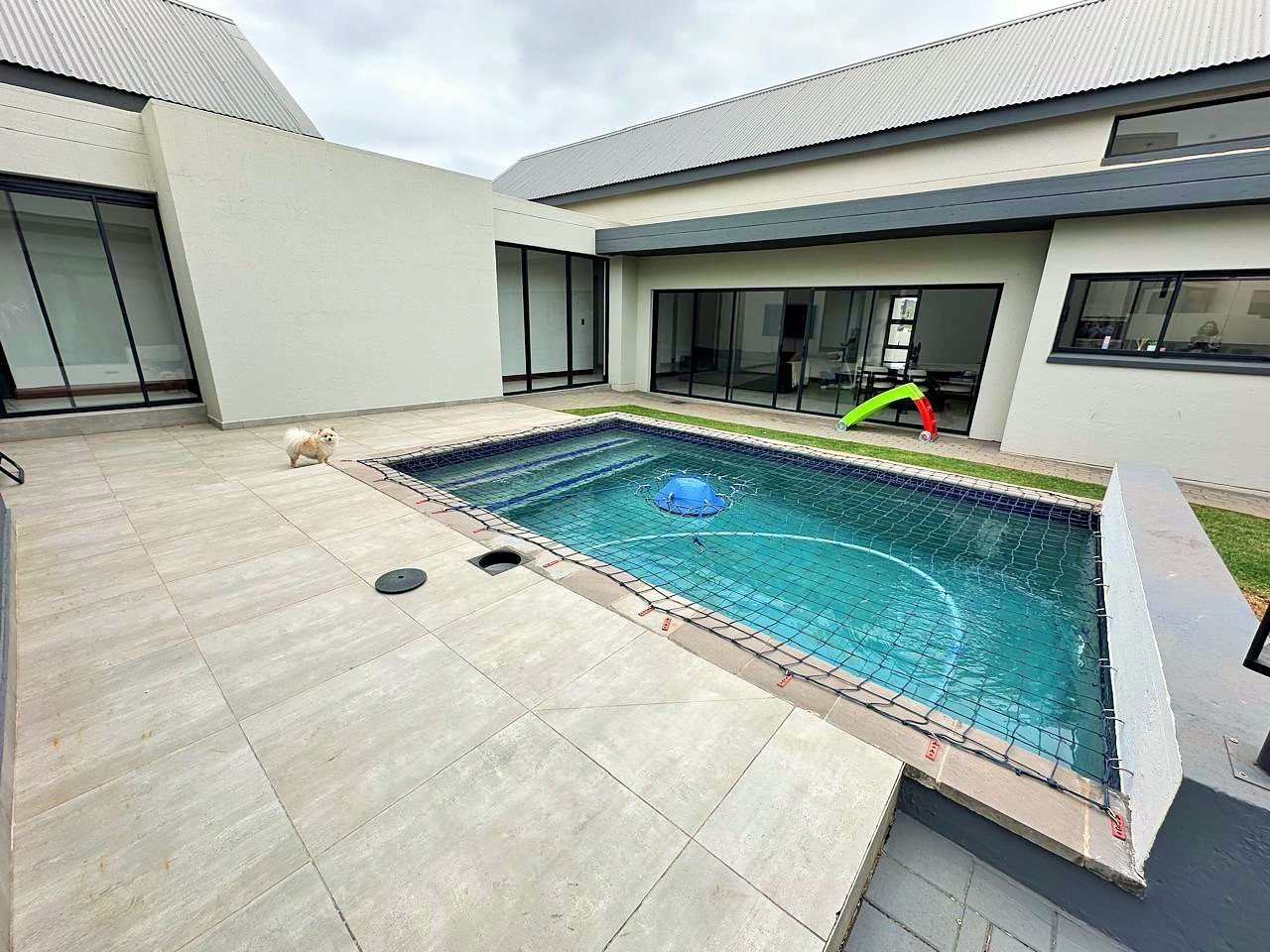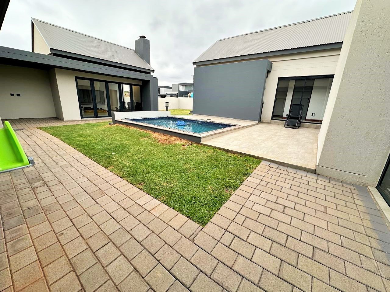 Glass doors open to a generous entertainment area overlooking a sparkling swimming pool—ideal for sunny afternoons and weekend gatherings.