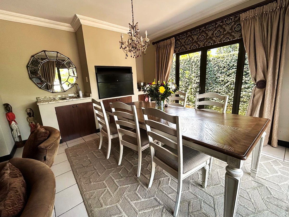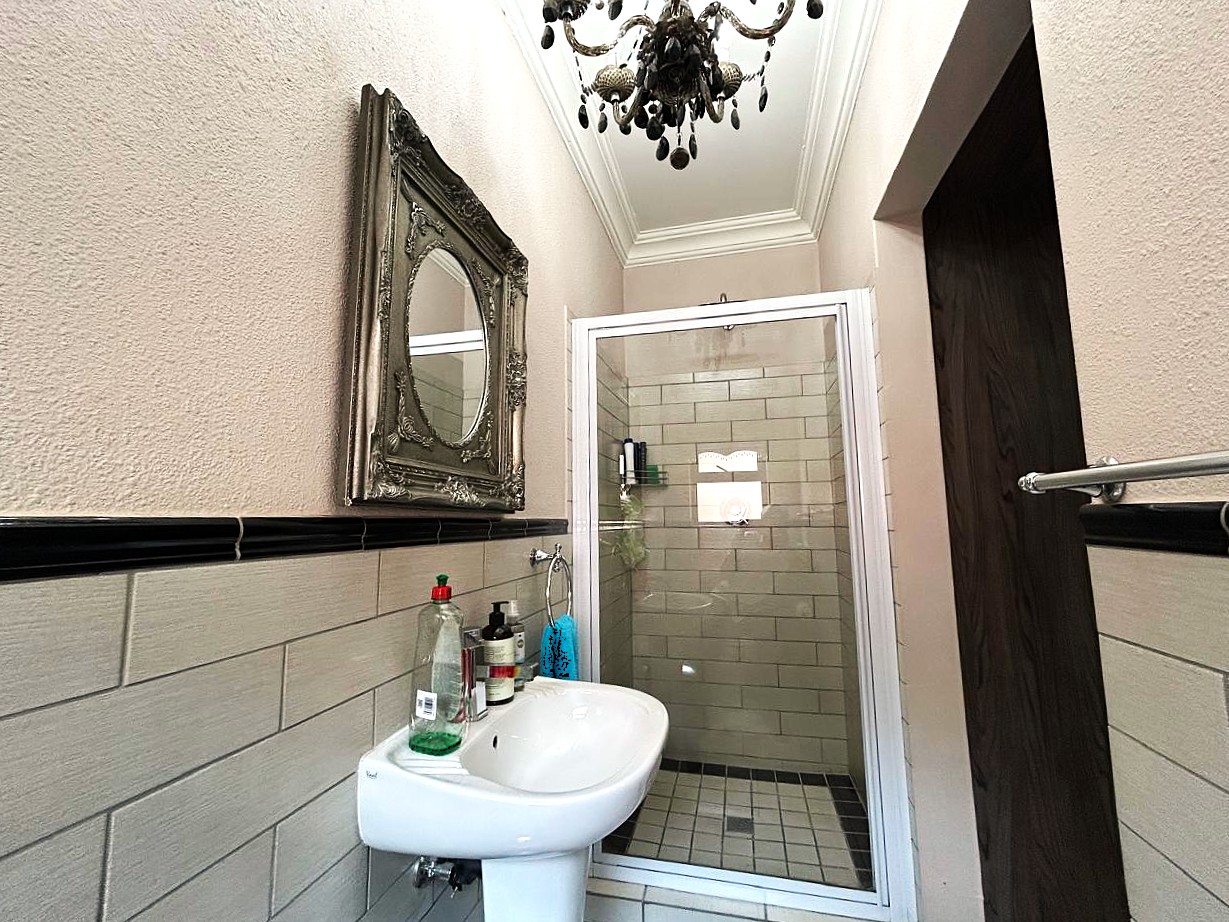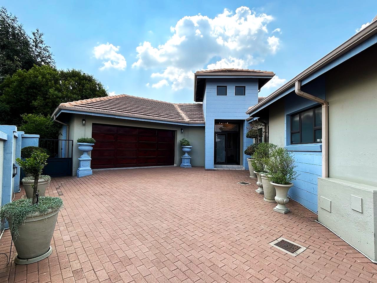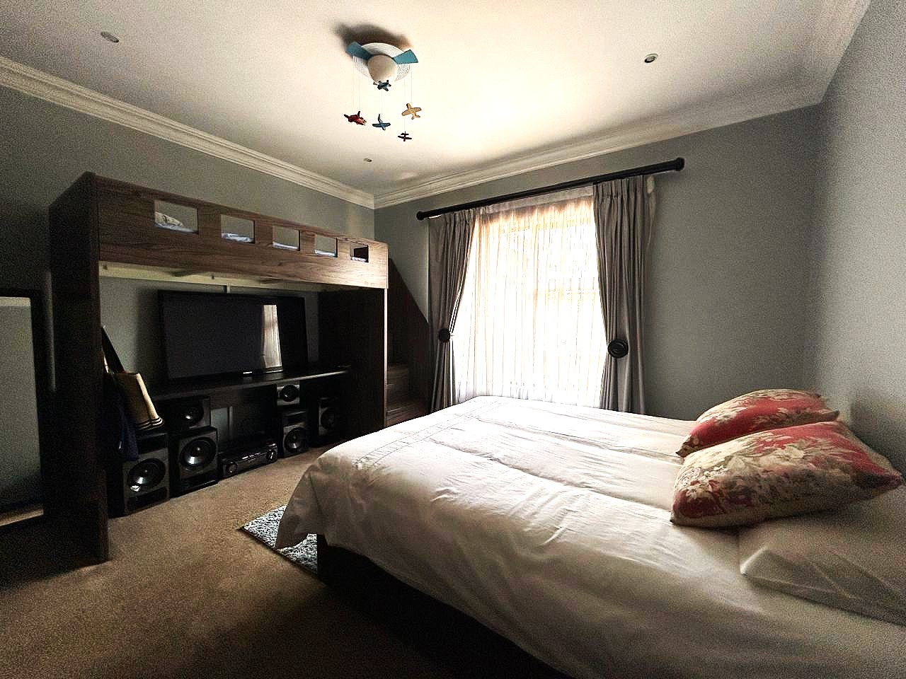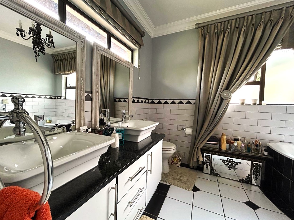 A grand double-volume foyer welcomes you into expansive, light-filled living areas that flow seamlessly throughout the home. The open-plan layout includes a spacious lounge, dining room, kitchen nook, and a stunning French-style kitchen with granite finishes, a gas stove and a separate scullery accommodating three under-counter appliances.
