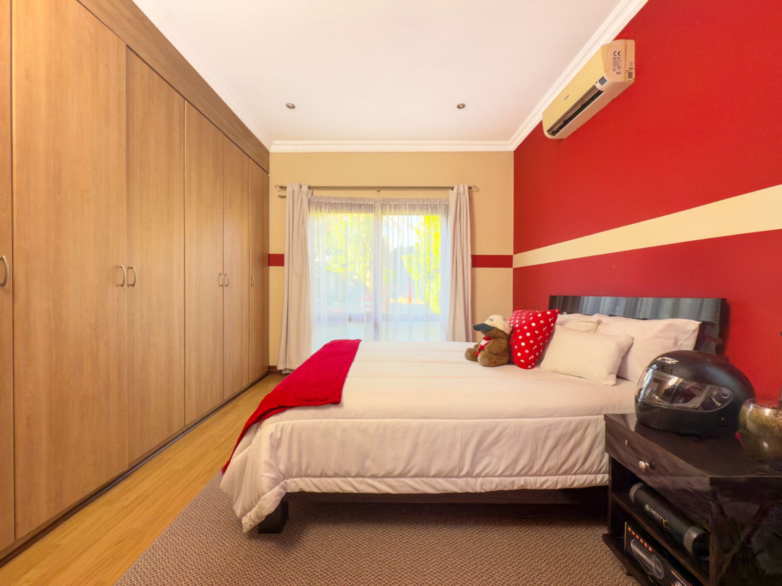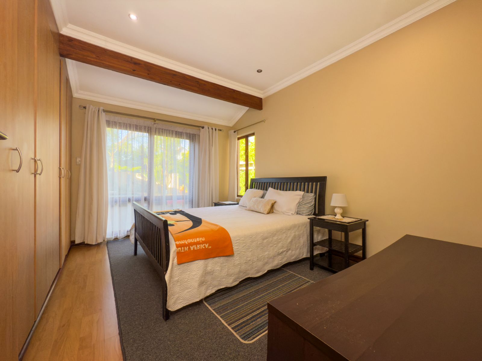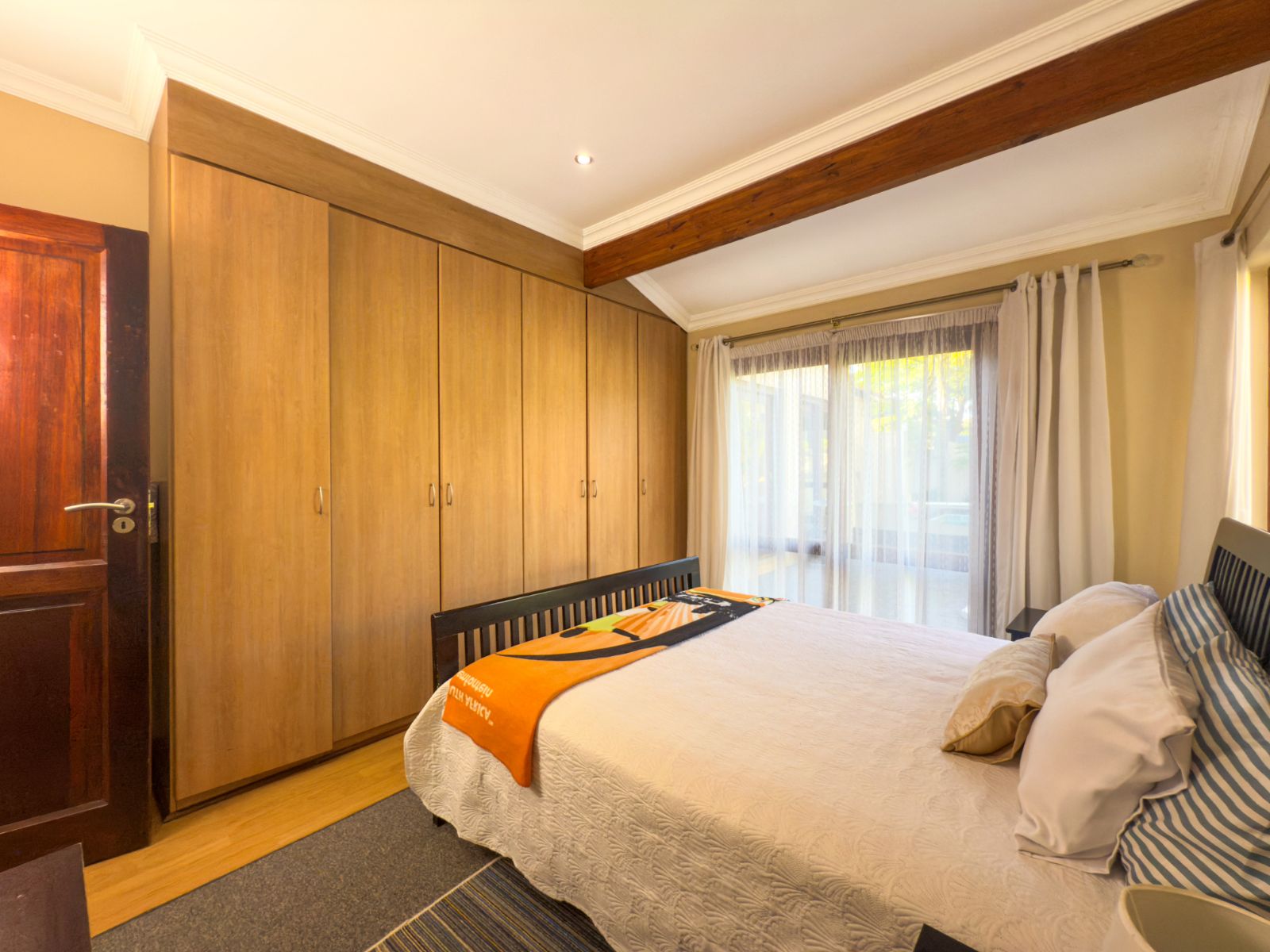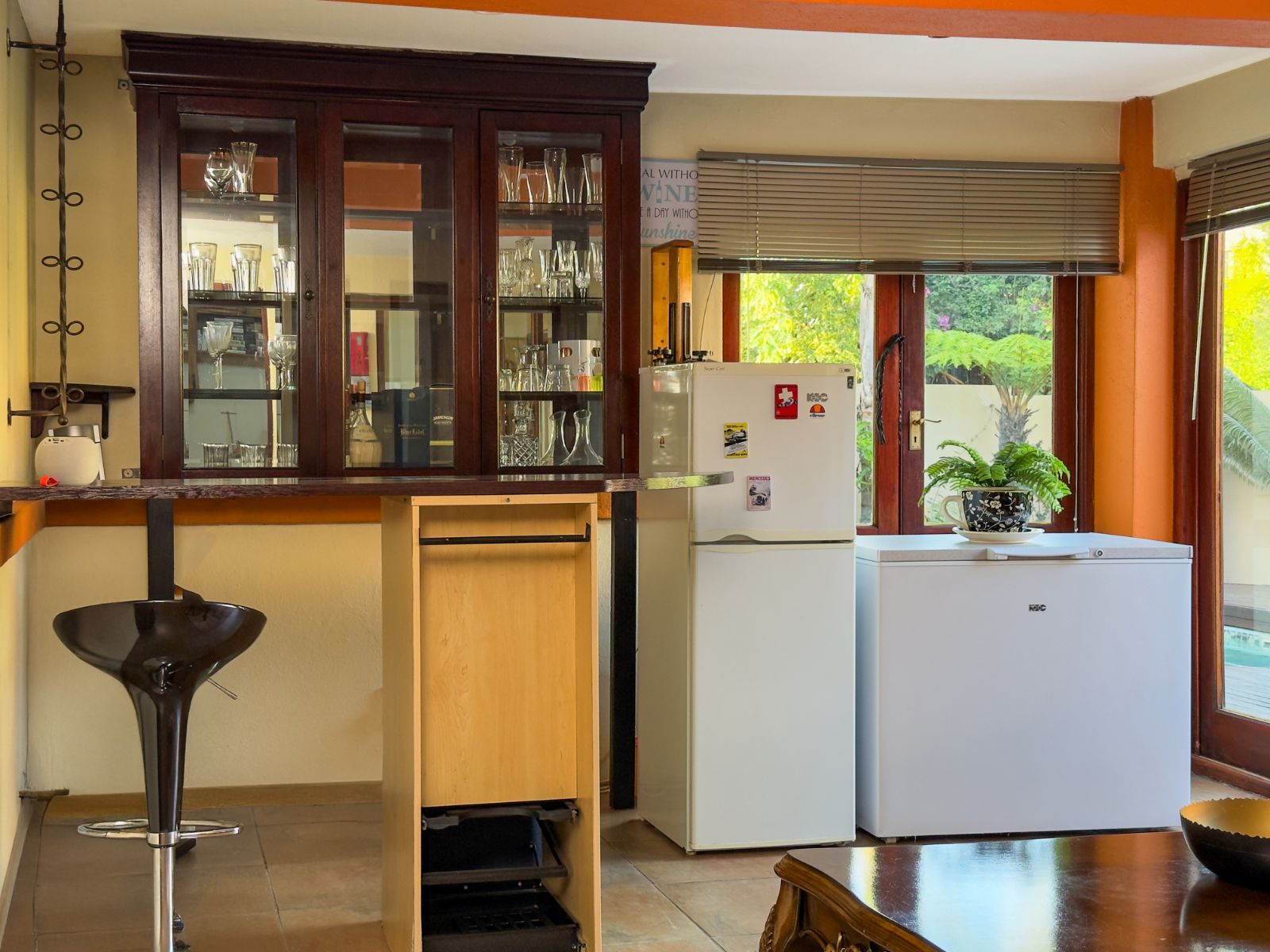 For entertaining, enjoy the formal lounge with floor-to-ceiling shelving, leading to a dedicated entertainment area with a built-in braai and bar—perfect for gatherings with friends and family. Step outside to the private pool and wooden deck for summer relaxation.