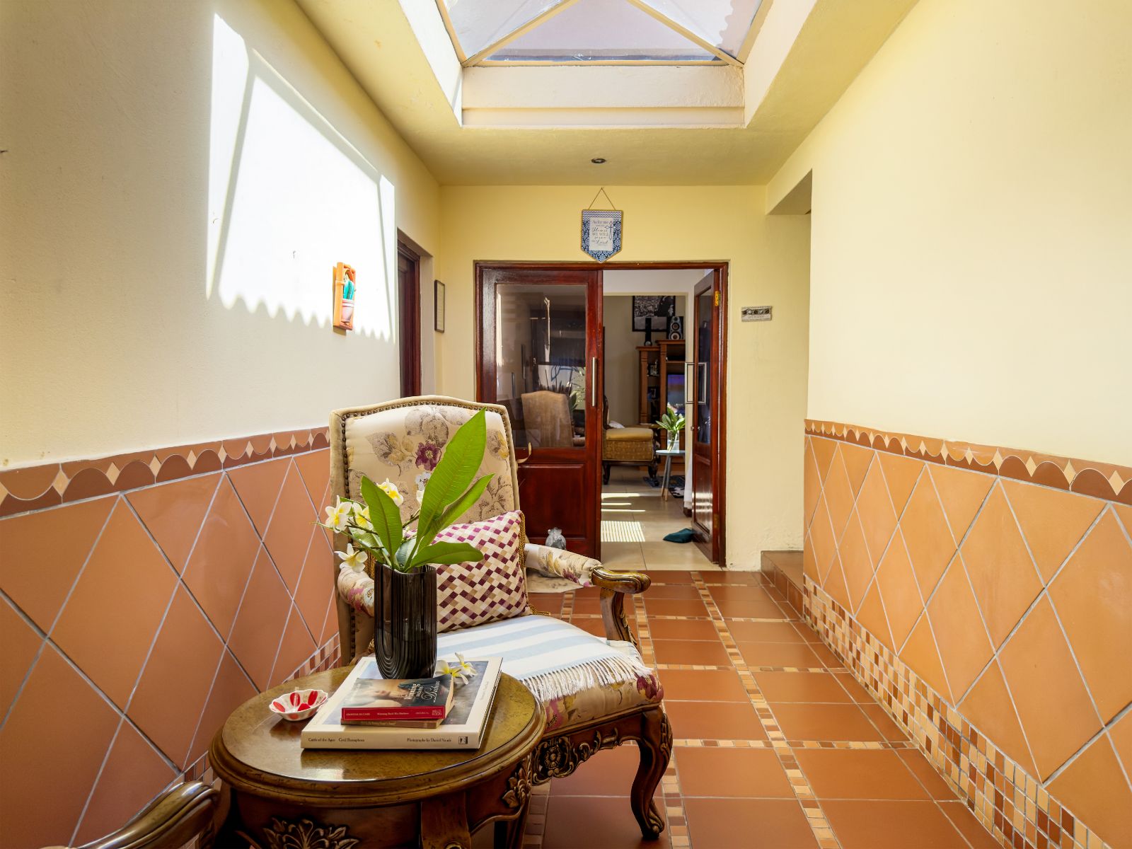 Step into a bright, open-plan reception area where natural light floods through large windows and a skylight, creating a warm and welcoming atmosphere. The cozy lounge flows seamlessly into the spacious dining area, ideal for entertaining or relaxed family meals.
