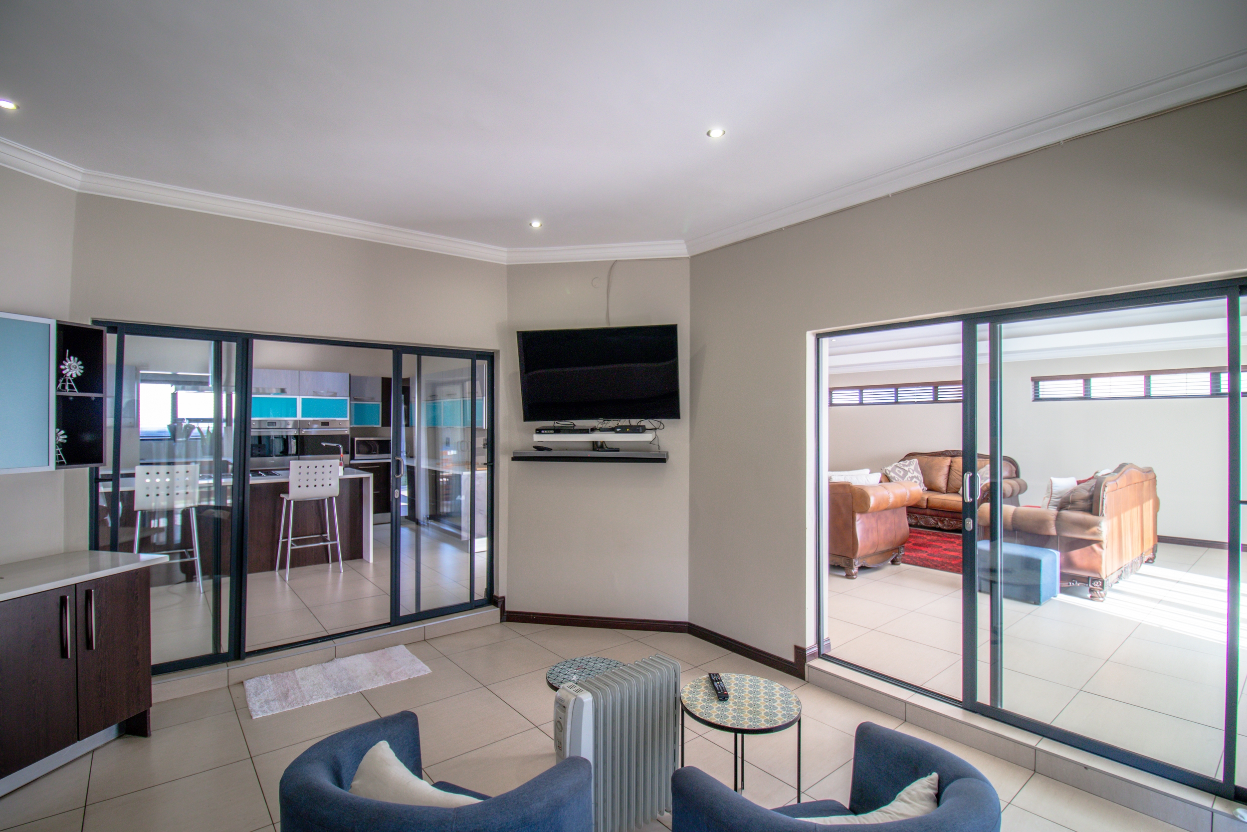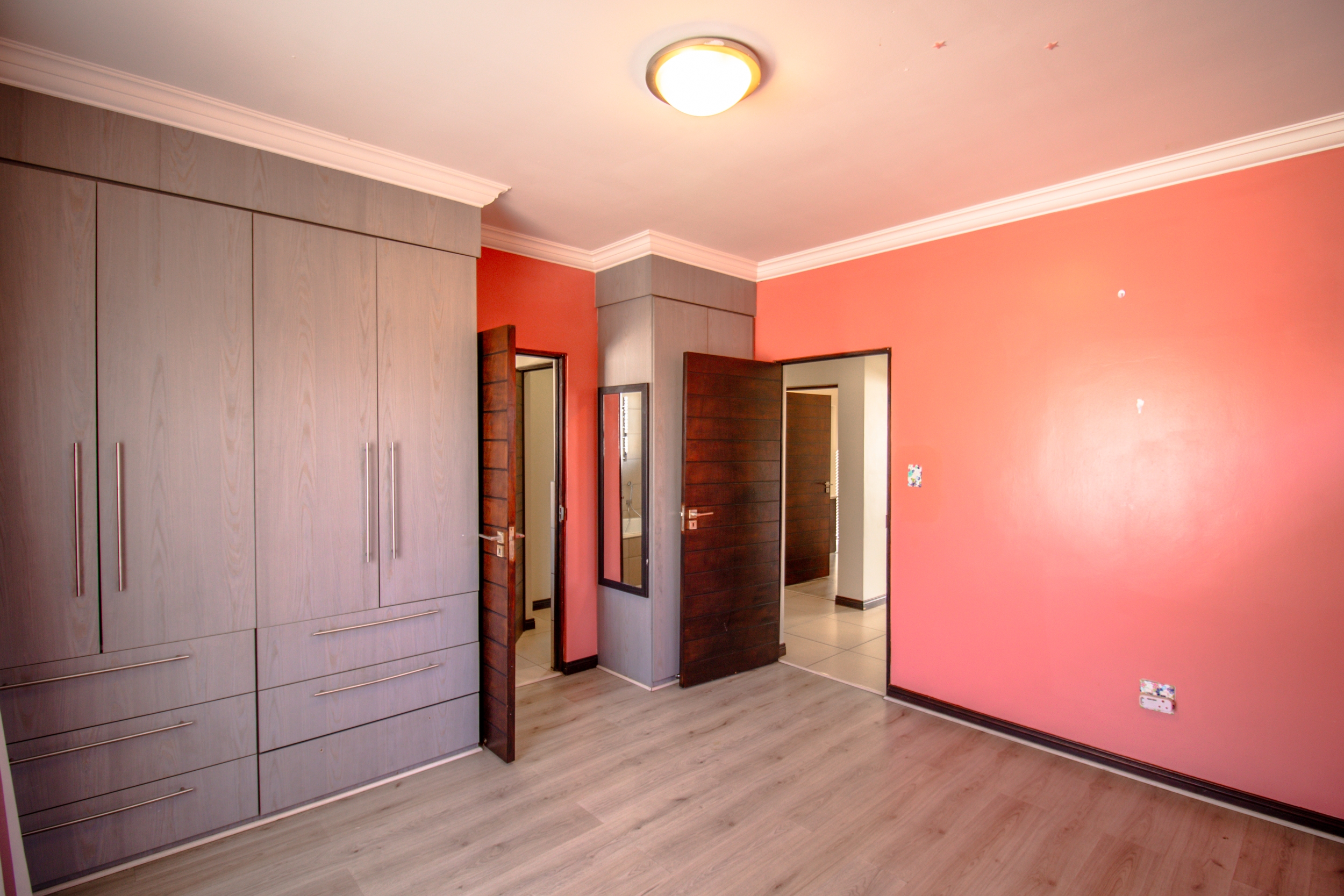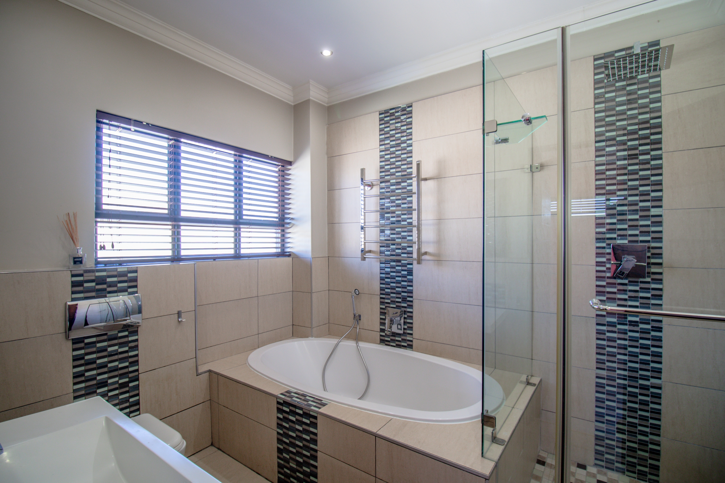 Live in luxury in this modern family home offering 4 bedrooms (3 en-suite), including a guest suite downstairs. The main bedroom features a walk-in closet and balcony. A private study is ideal for working from home. The open-plan kitchen flows to spacious lounge and dining areas with a built-in braai. Step outside to a covered patio, manicured garden, and sparkling pool—perfect for entertaining. Midstream Estate offers top-tier security with 24/7 patrols, surveillance, and strict access control, ensuring peace of mind.