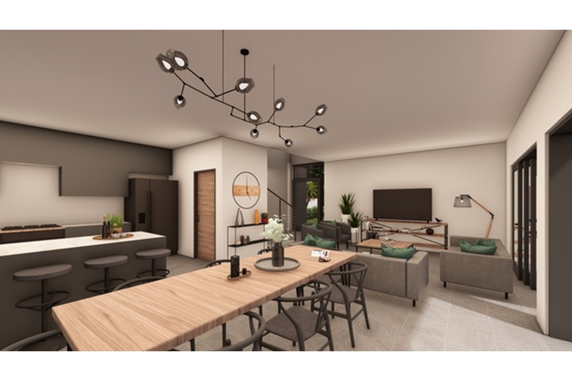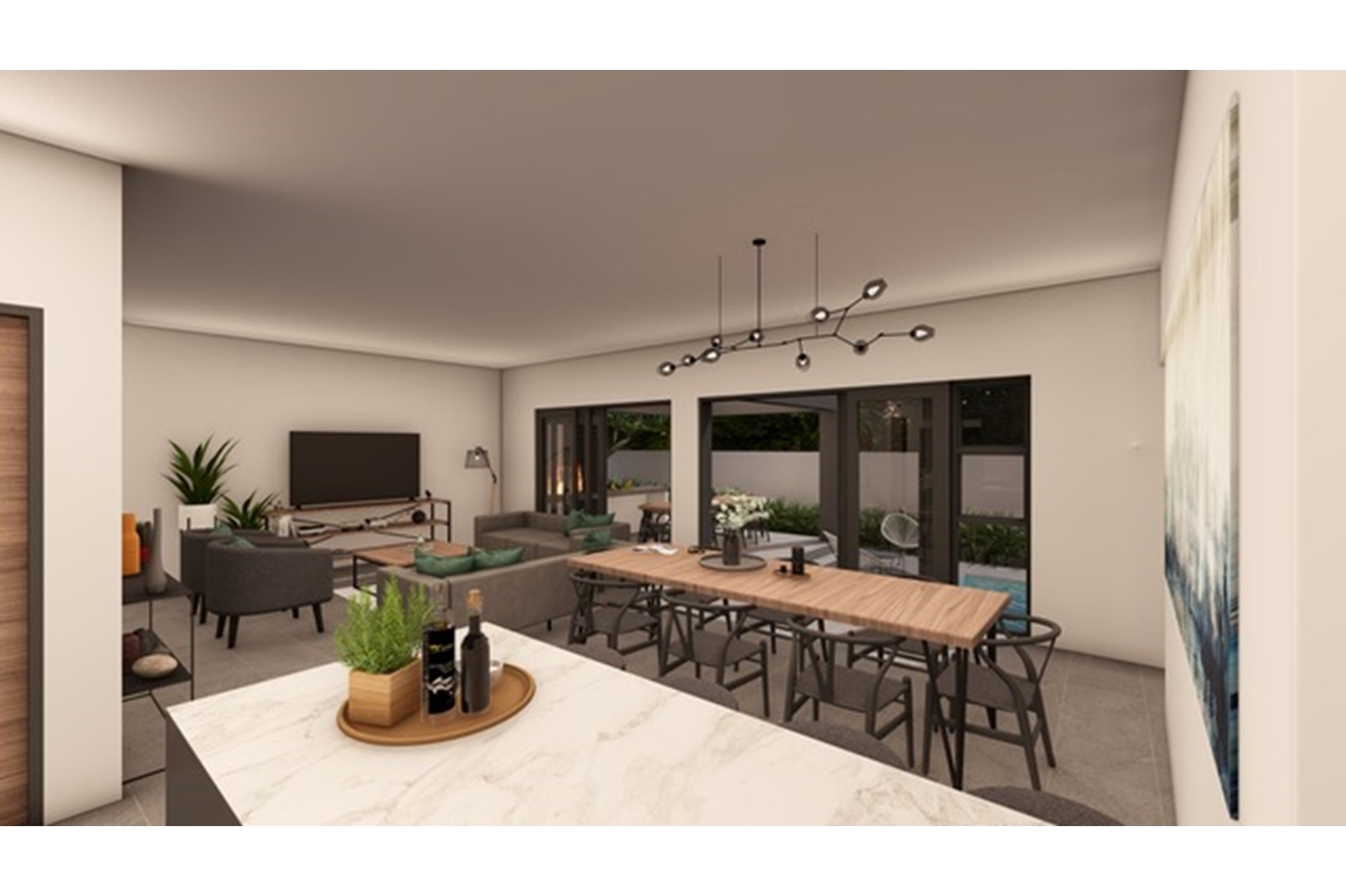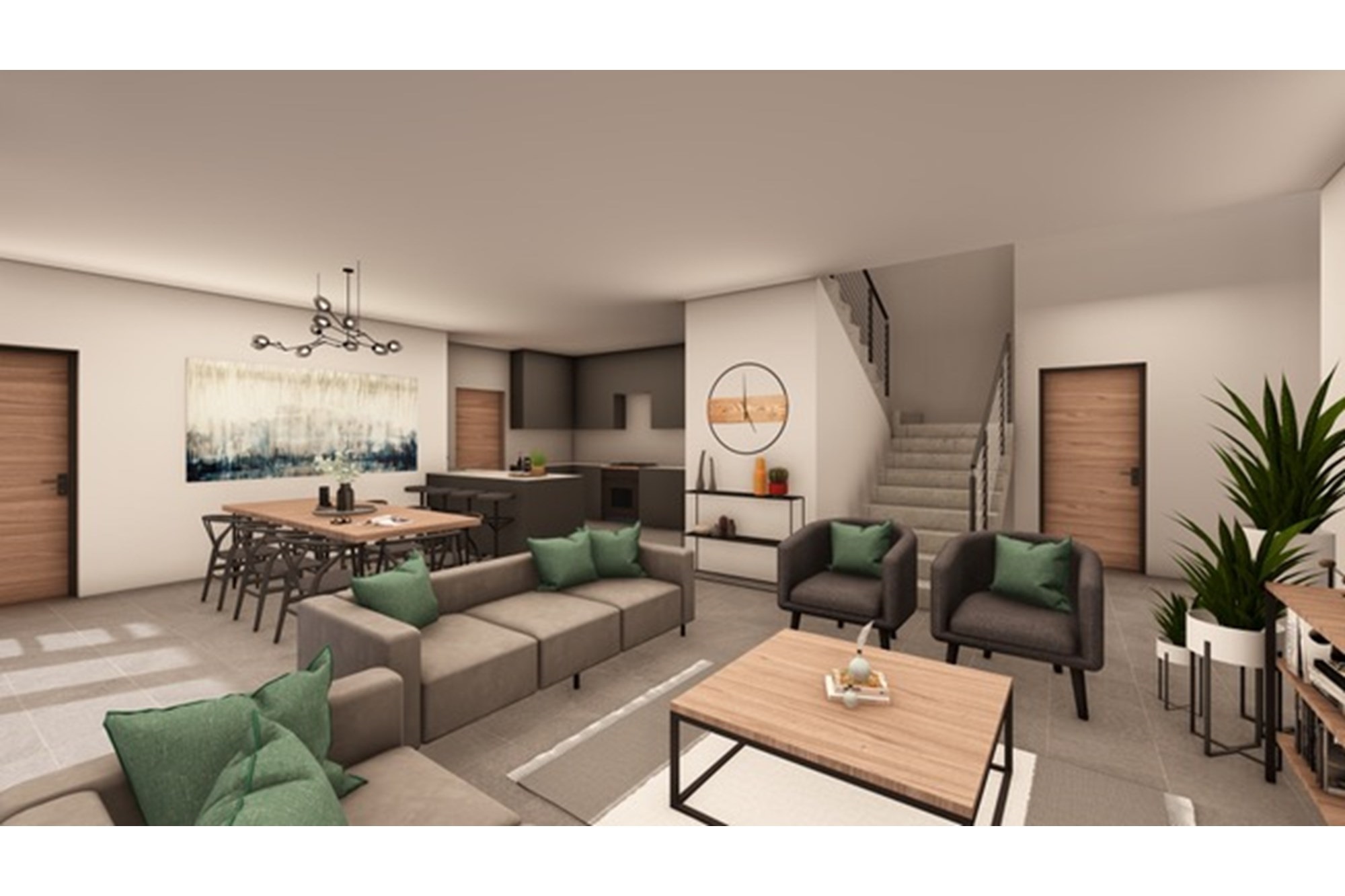 Spanning a generous 261.5 square meters of living space, this two-story house boasts three spacious bedrooms and two elegant bathrooms, accommodating your family comfortably. The clever design ensures privacy, with the bedrooms perfectly located to provide a serene retreat. The heart of this home is the open-plan living area, where natural light floods the space, creating a warm and inviting atmosphere for family gatherings and entertaining friends.