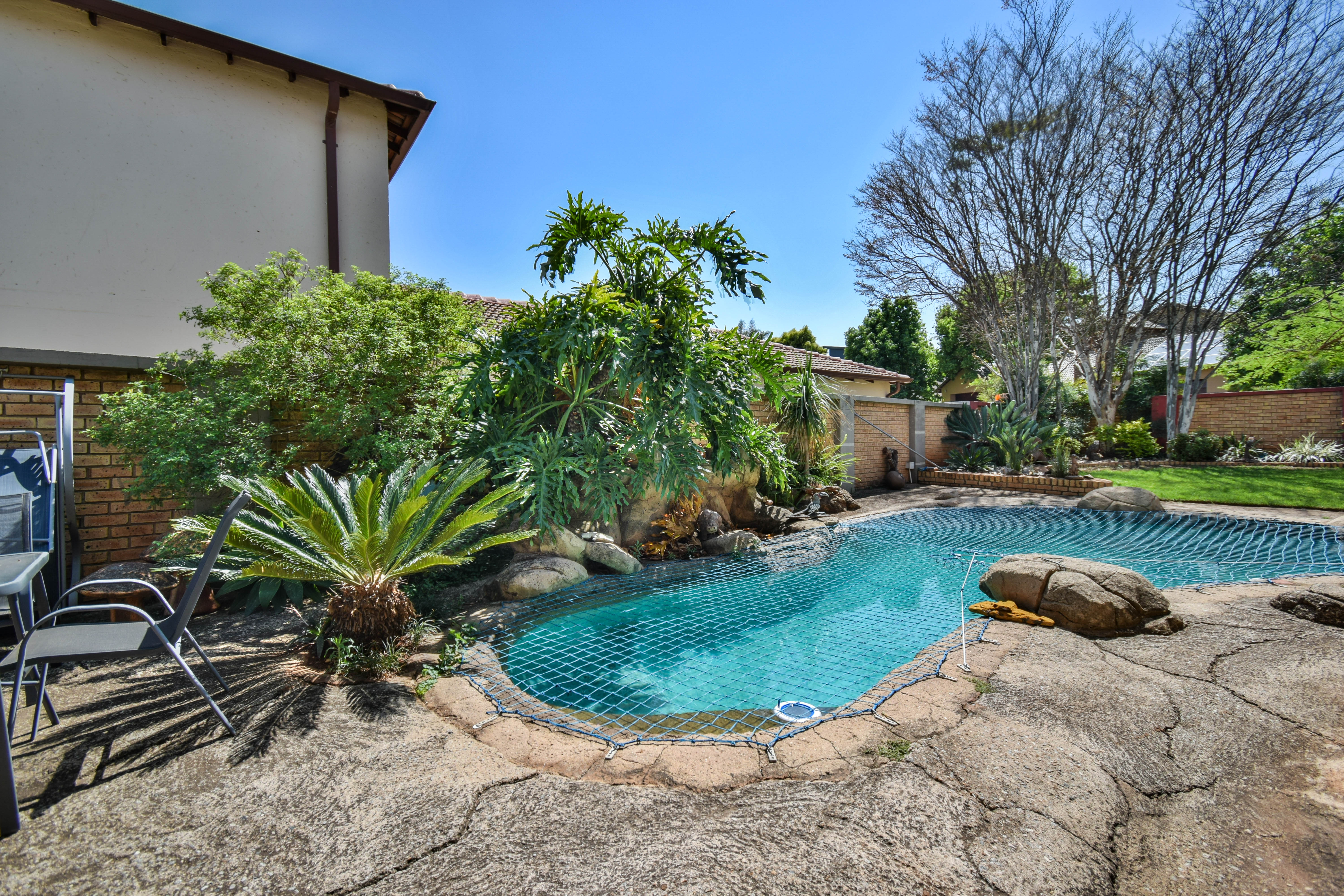 The entertainment area opens up to a well-kept garden and a sparkling pool, secured with a safety net, offering a private outdoor retreat for both kids and adults. Outside, there is ample visitor parking along with three spacious garages, ensuring convenience and space for the whole family.