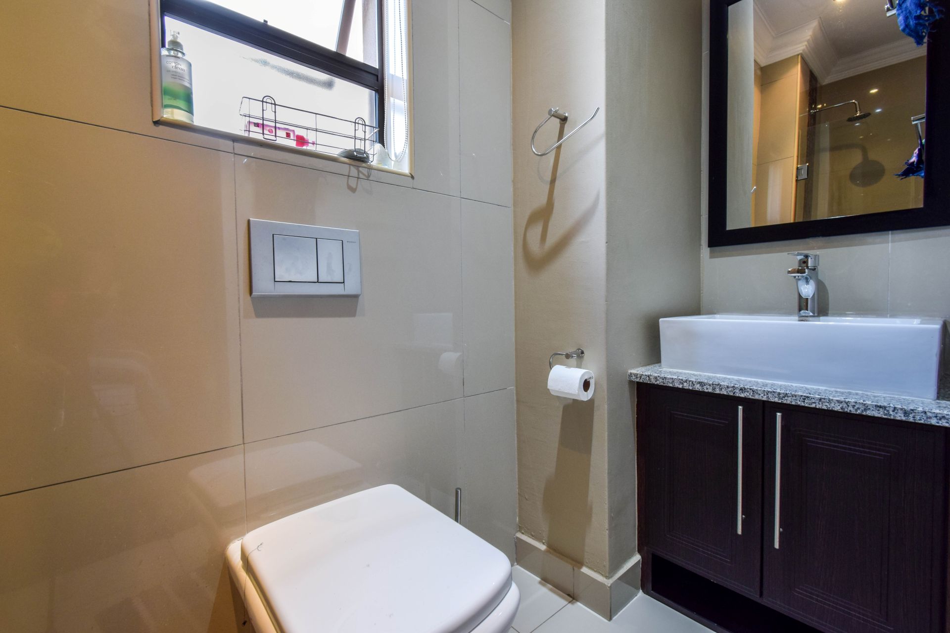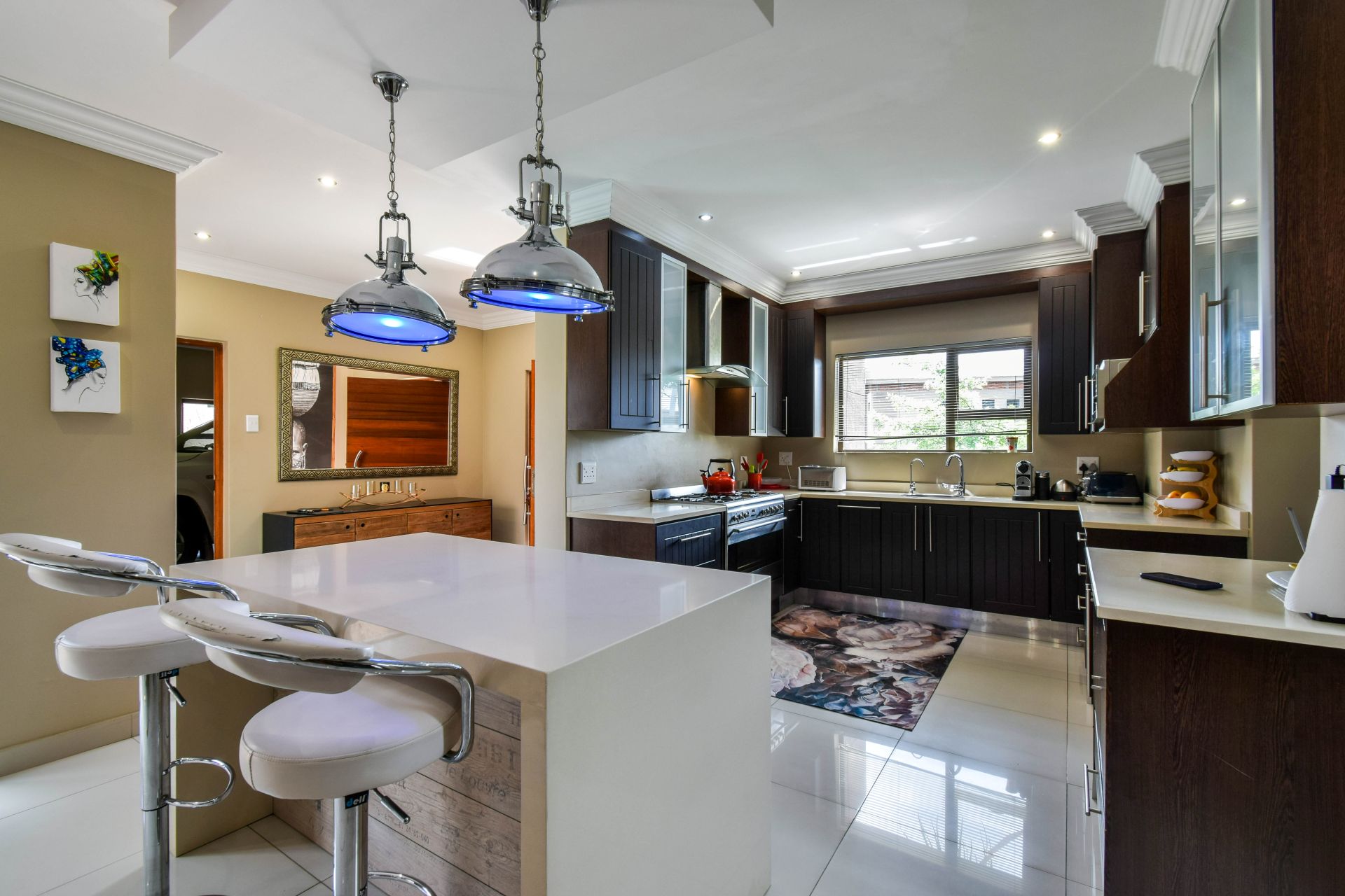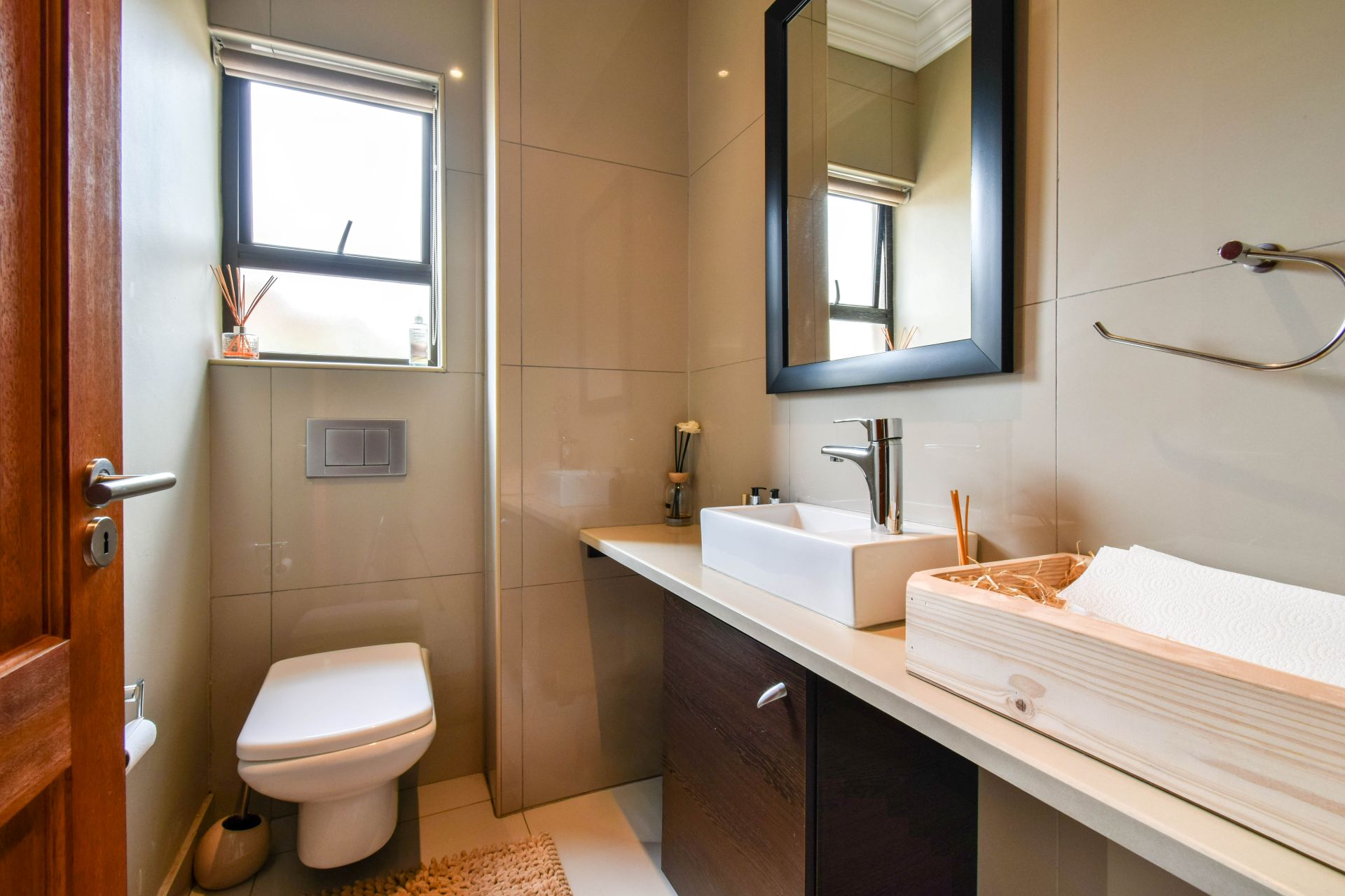 The open-plan downstairs living area includes a stylish kitchen with a gas stove, gas oven, and separate scullery, seamlessly connecting to the dining and lounge spaces. A guest bedroom with its own bathroom offers privacy and convenience, while a separate powder room adds practicality for visitors.