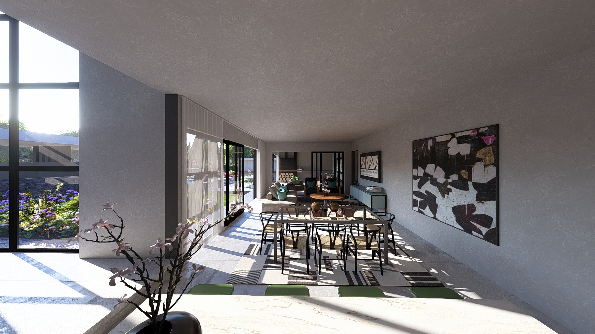 The home opens into an expansive open-plan living area comprising the dining room, lounge, and a chef-style kitchen with a stylish center island. Behind the kitchen is a private scullery, leading out to the kitchen yard and a full staff room with en-suite bathroom—perfect for live-in help or extended family.