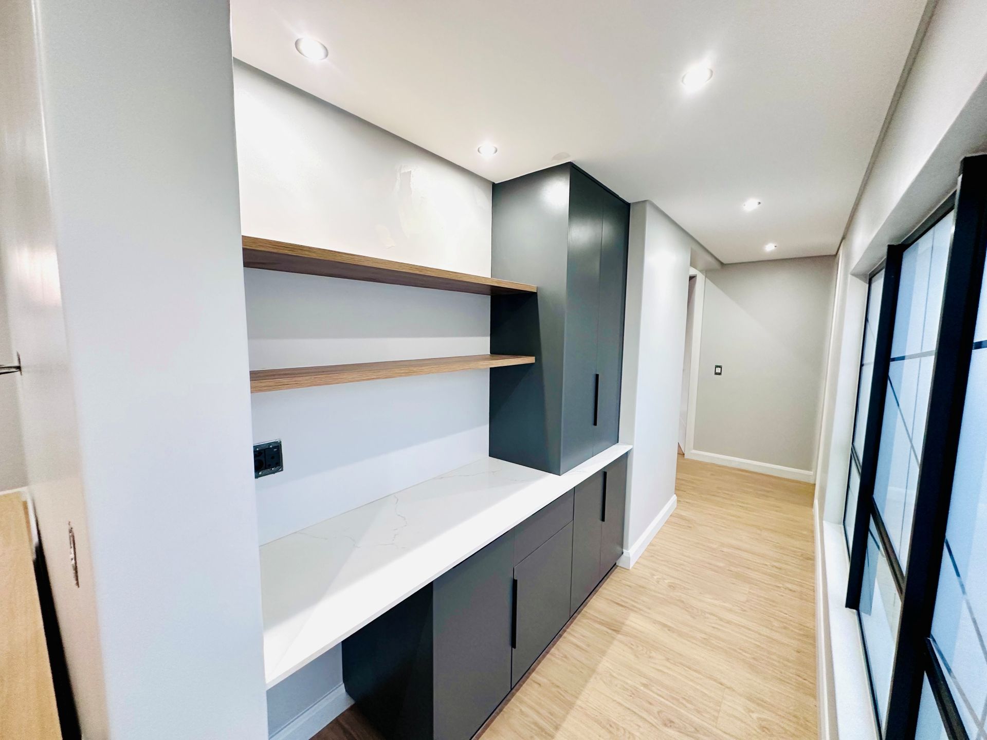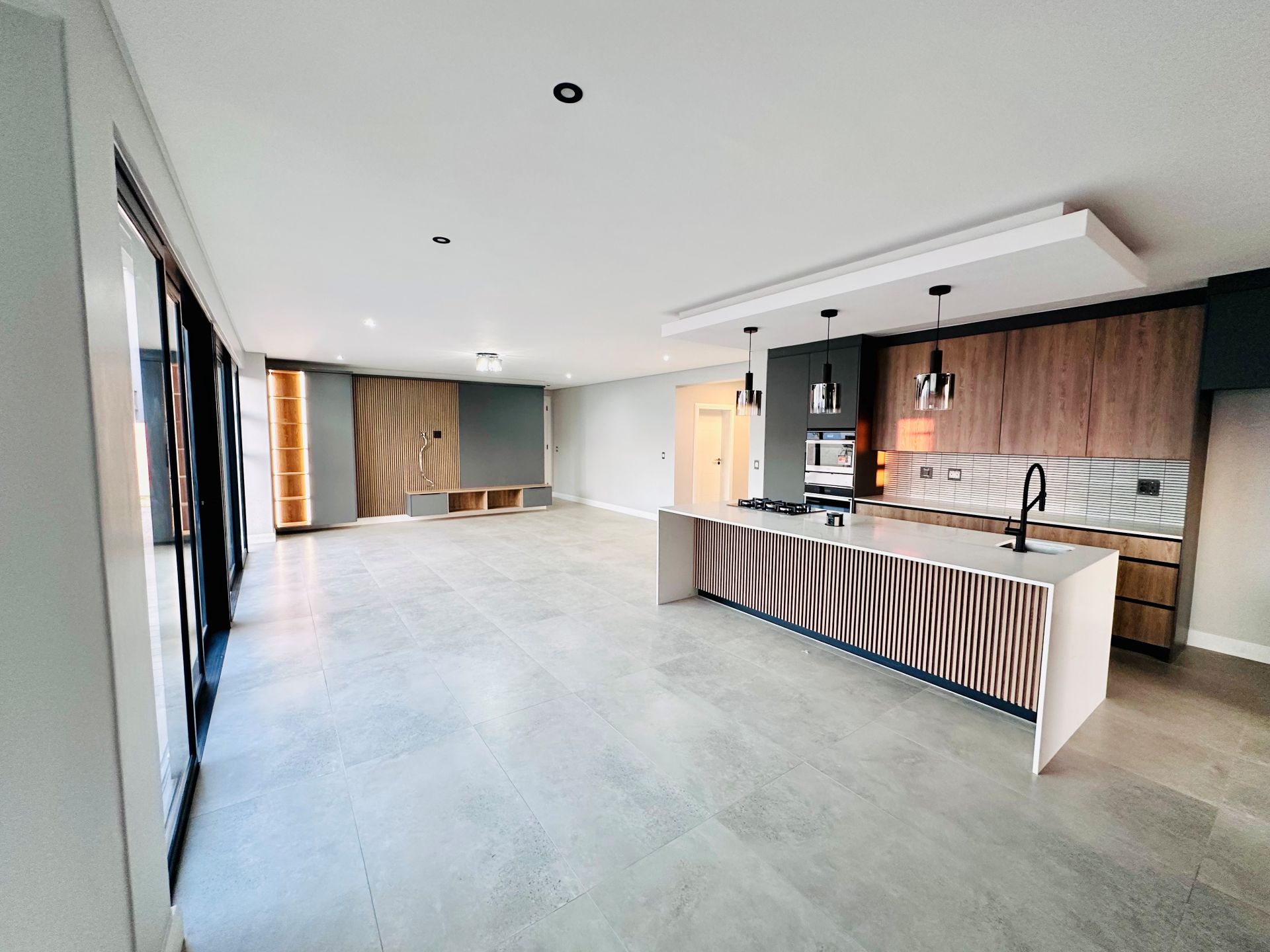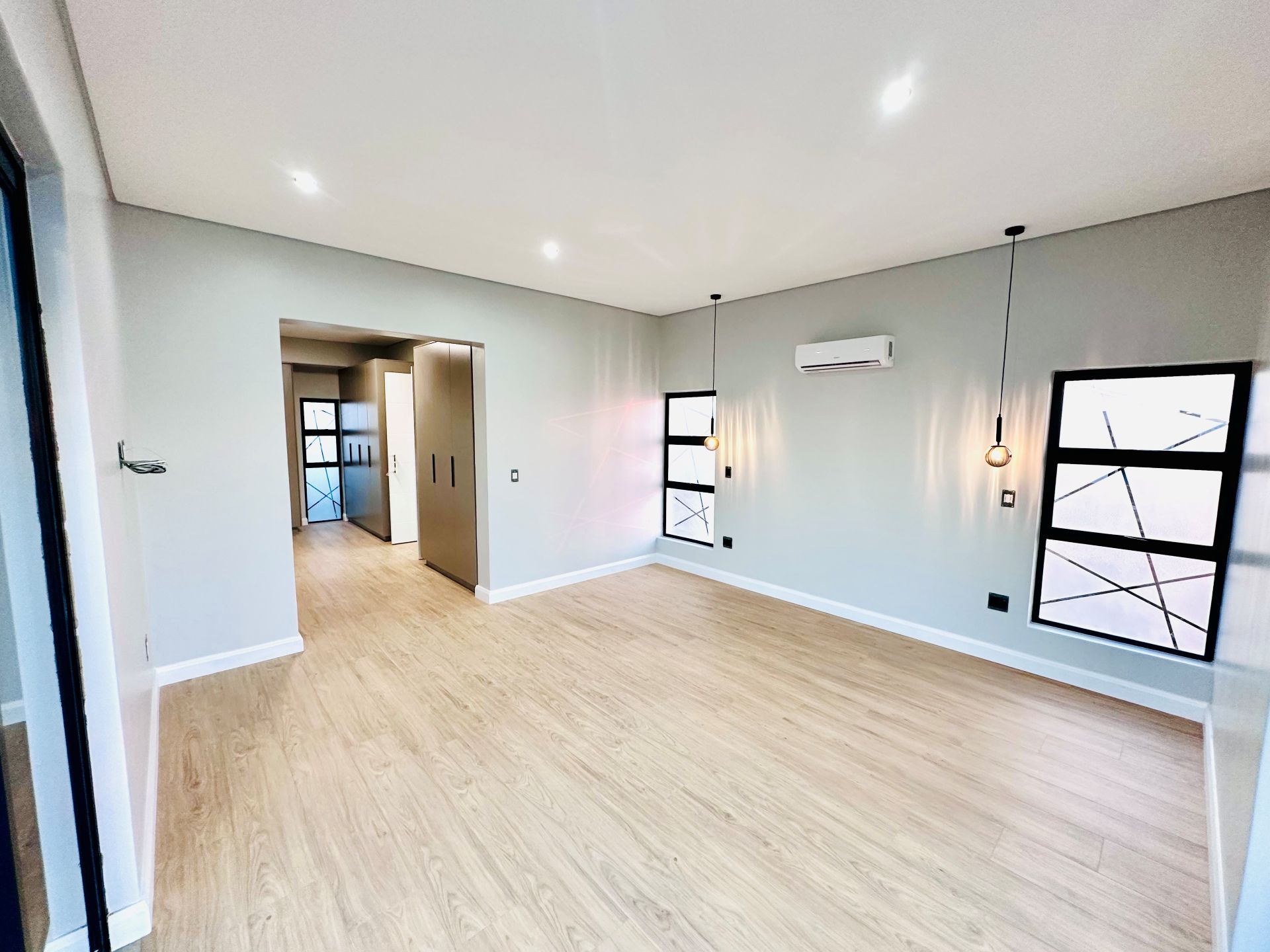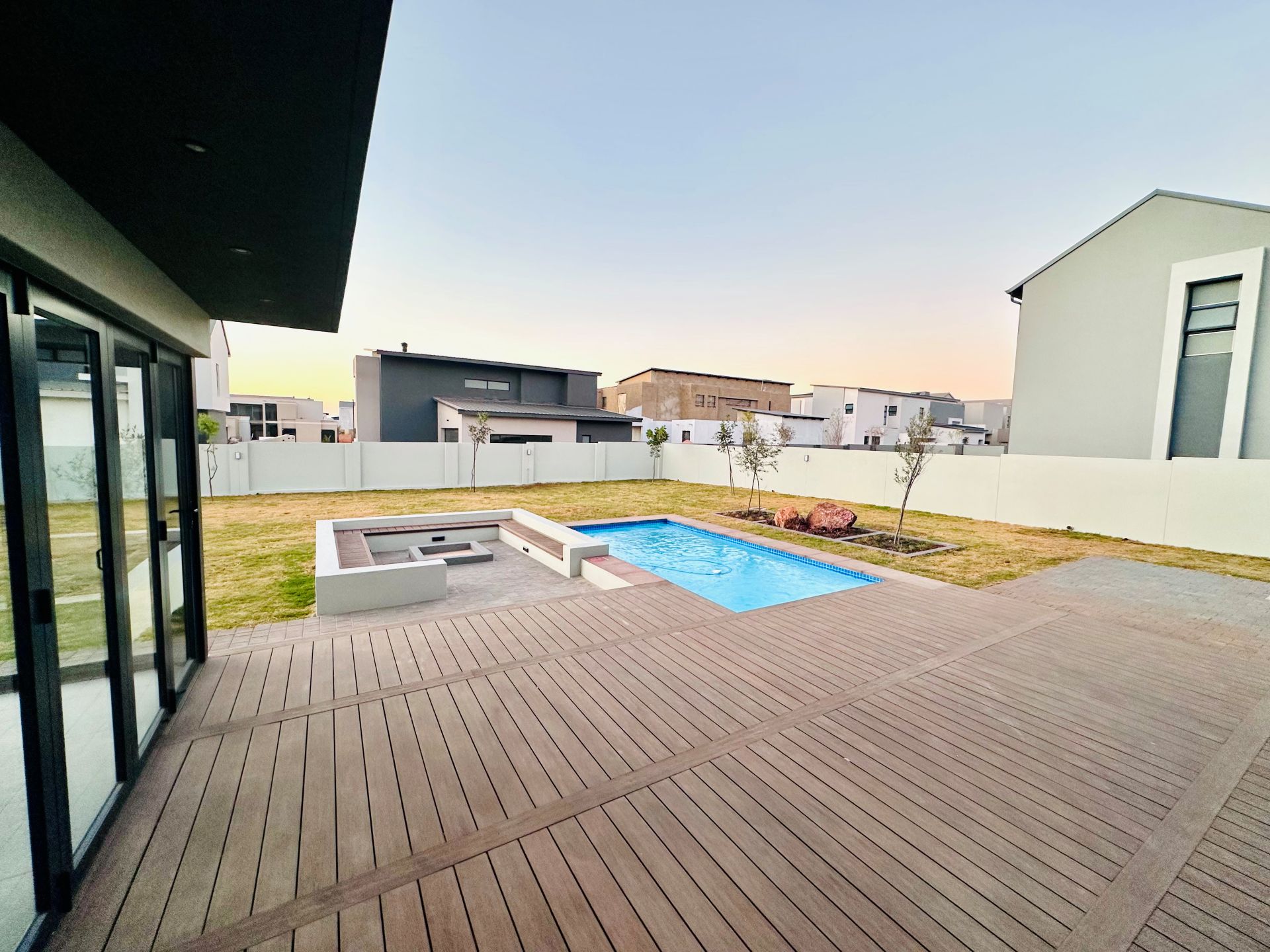 The heart of the home lies in its impressive entertainment wing: a stylish entertainment room complete with a built-in bar, built-in braai, and counter space with a prep bowl. From here, sliding doors open to a large deck that overlooks a beautifully landscaped garden, a sparkling swimming pool, and a cozy boma area with built-in seating—creating the ideal space for year-round gatherings with family and friends.