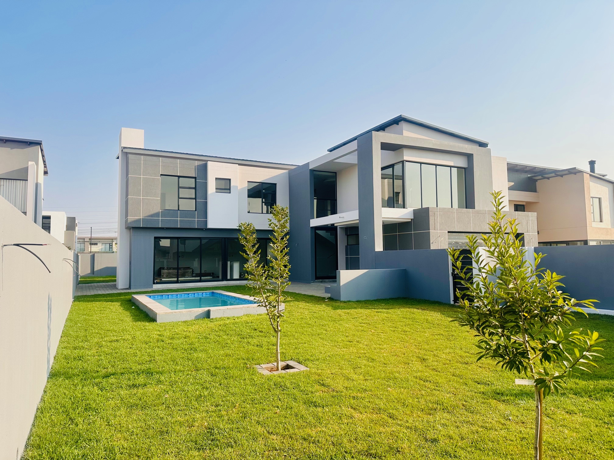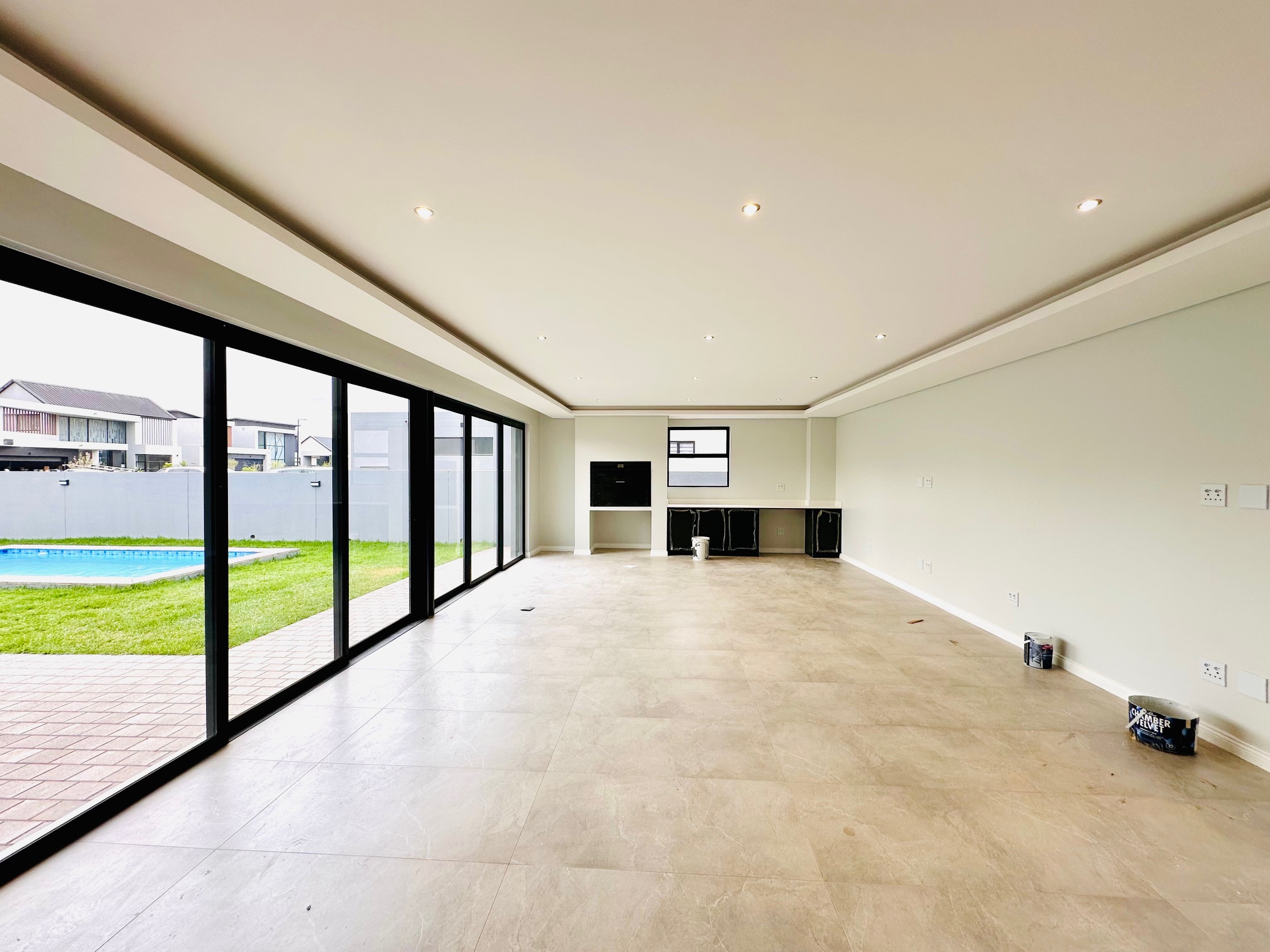 The lounge opens up to a covered patio complete with a built-in braai and sleek countertops - the ideal spot for hosting gatherings. The patio flows out to a well-maintained garden and sparkling swimming pool, offering the perfect outdoor lifestyle.