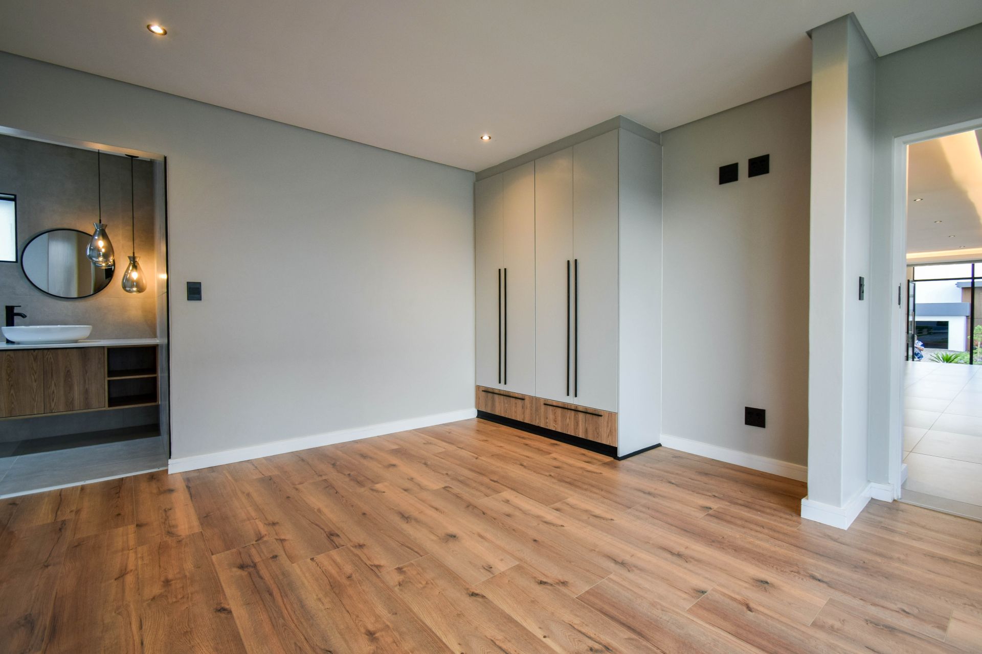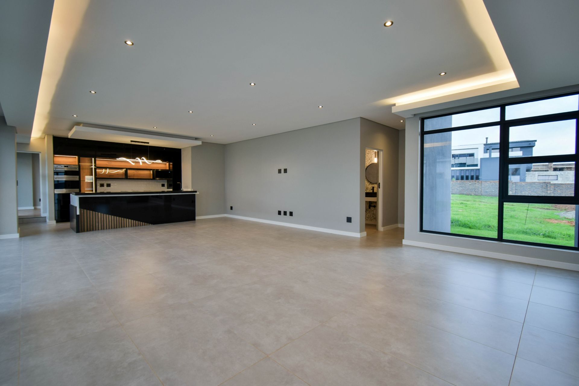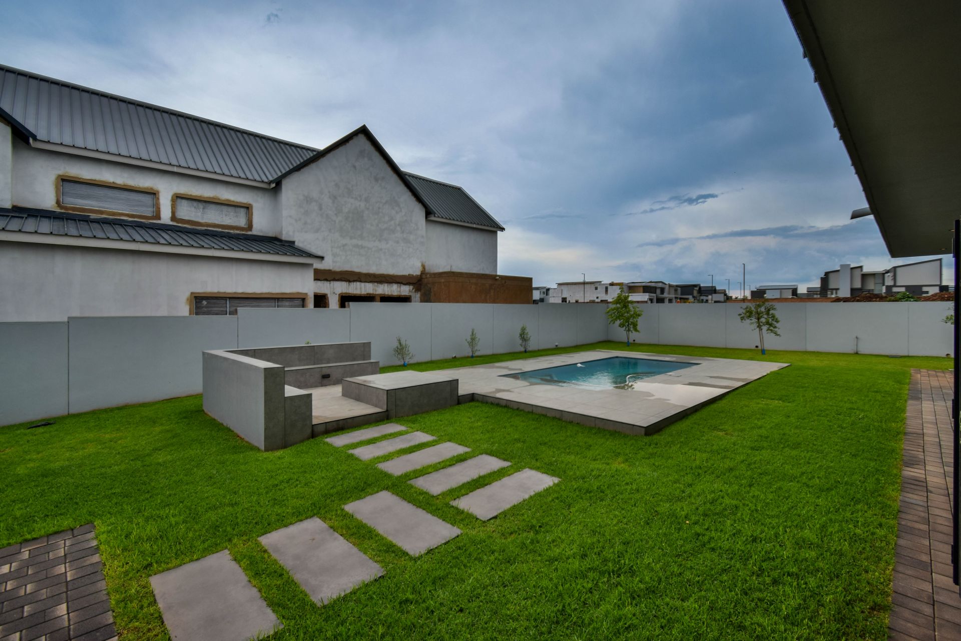 From the patio, you are welcomed into the private garden, swimming pool, and a well-designed boma with built-in seating. A guest bathroom is conveniently located near the dining area. The lower level also features a guest suite—or fifth bedroom—with its own en-suite bathroom, making it ideal as a home office, gym, or private accommodation for visitors. The triple garage offers direct access to the home, while the staff room with an en-suite bathroom is located discreetly behind the garage and accessible from the kitchen yard.