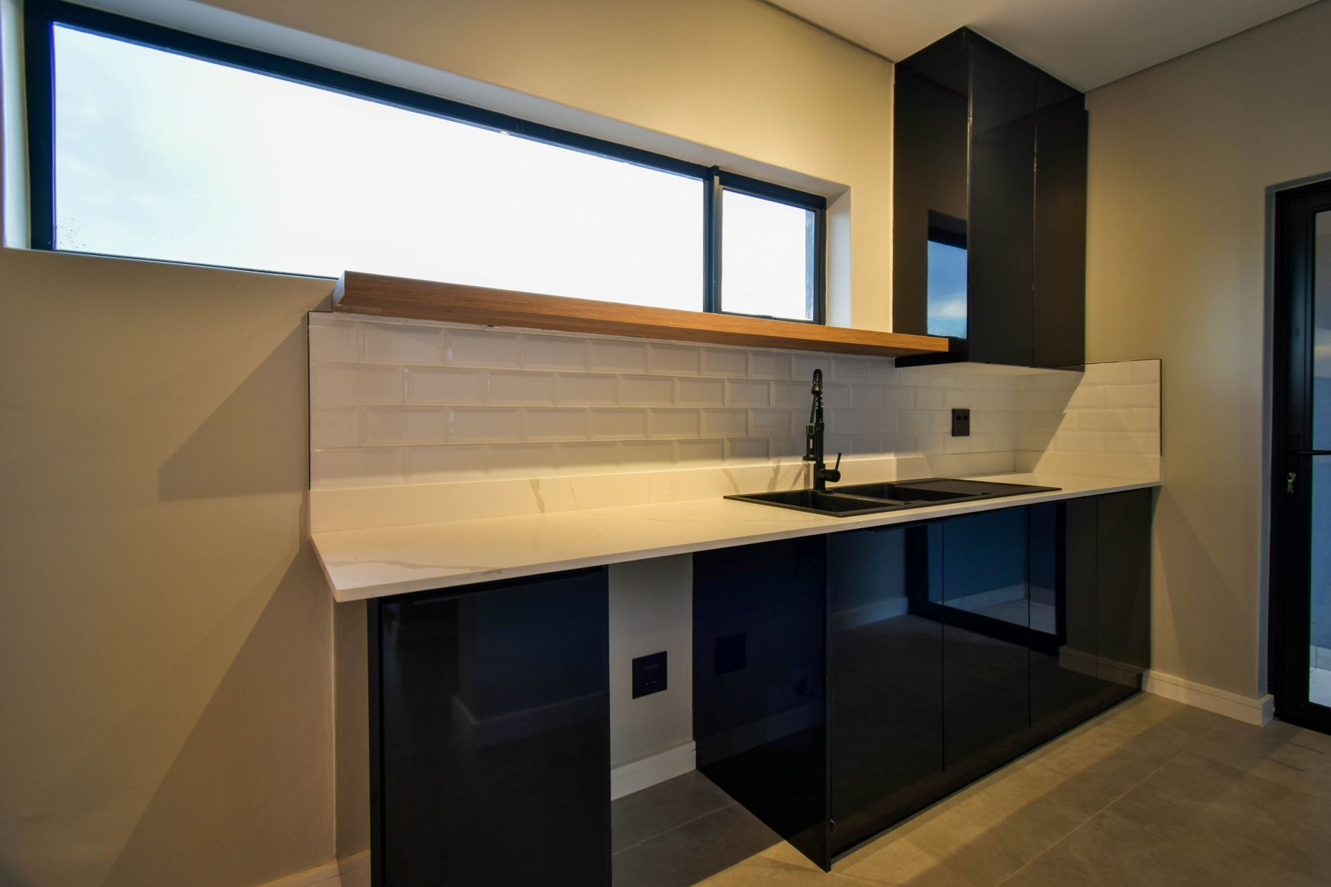 The modern kitchen is a standout feature, offering ample storage, a walk-in pantry, and a separate scullery. A central island with a prep bowl doubles as a convenient breakfast nook, while the open-plan layout flows naturally into the dining room and lounge. Large sliding doors open onto the covered patio, complete with a built-in braai, countertops, and an additional prep bowl, creating the ideal space for hosting gatherings throughout the year.