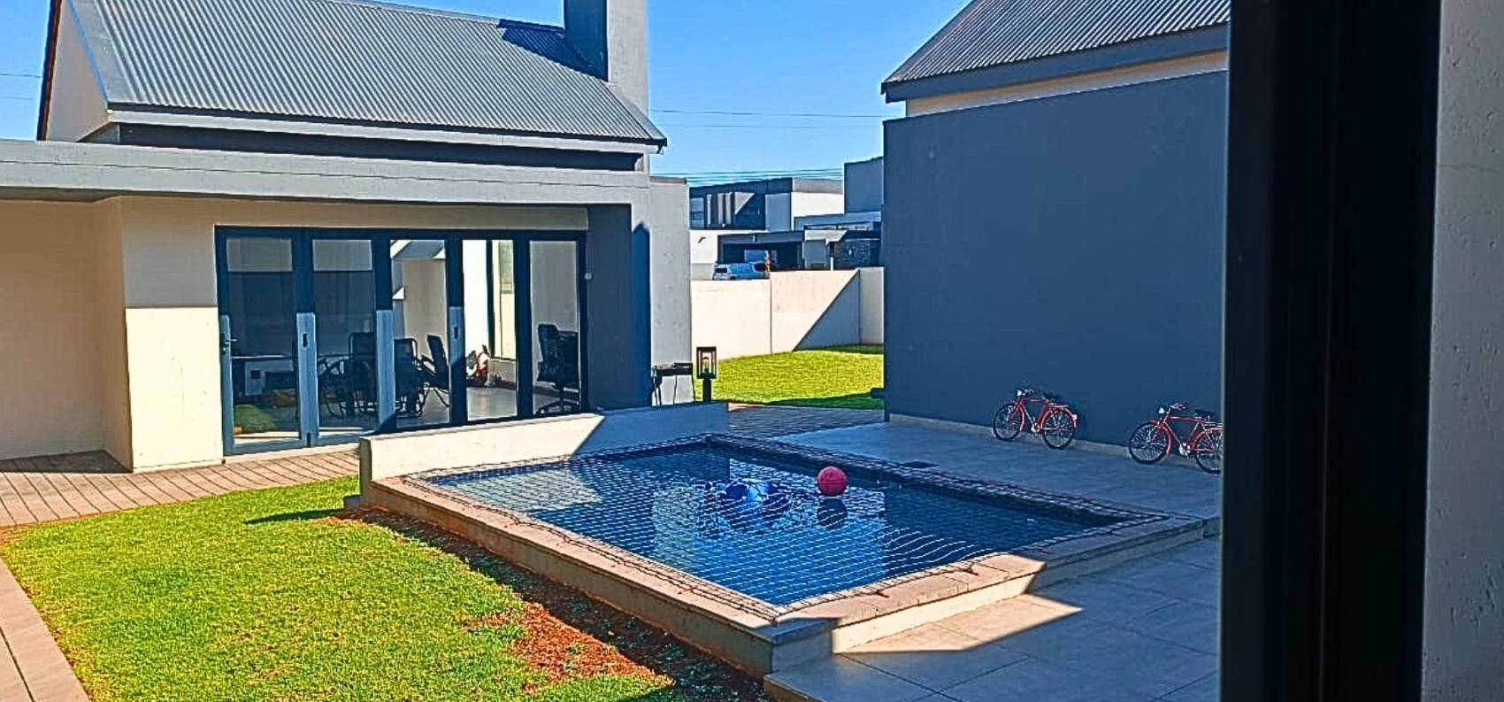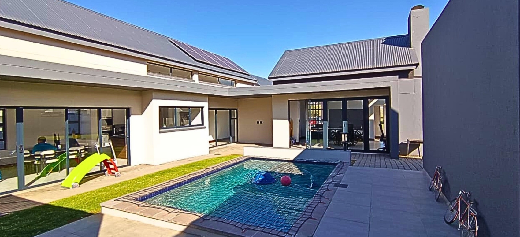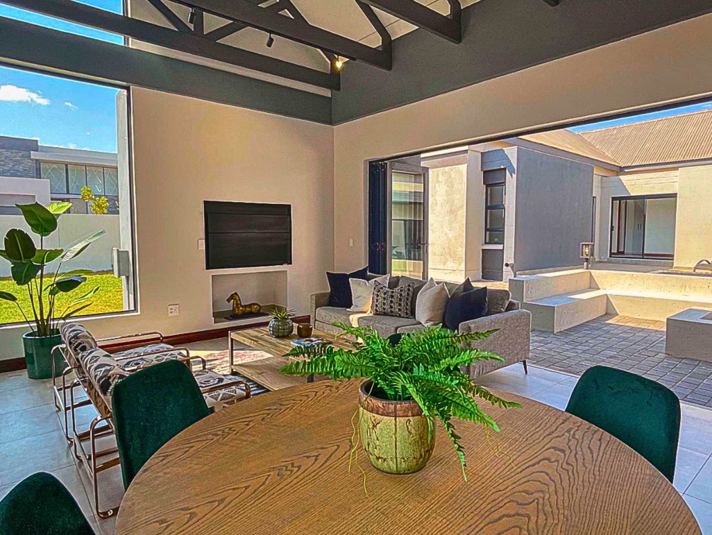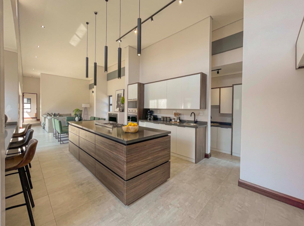 The open-plan layout seamlessly connects the kitchen, dining area, and lounge, creating an inviting space ideal for family living and entertaining. The modern kitchen features a separate scullery and offers a clear view of the garden and sparkling swimming pool — perfect for keeping an eye on the kids or hosting guests.