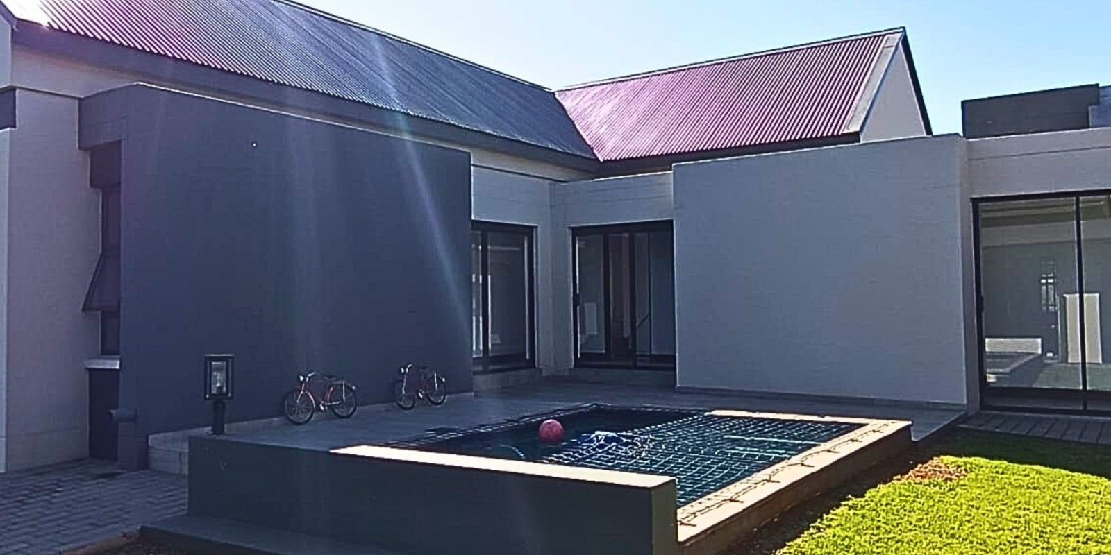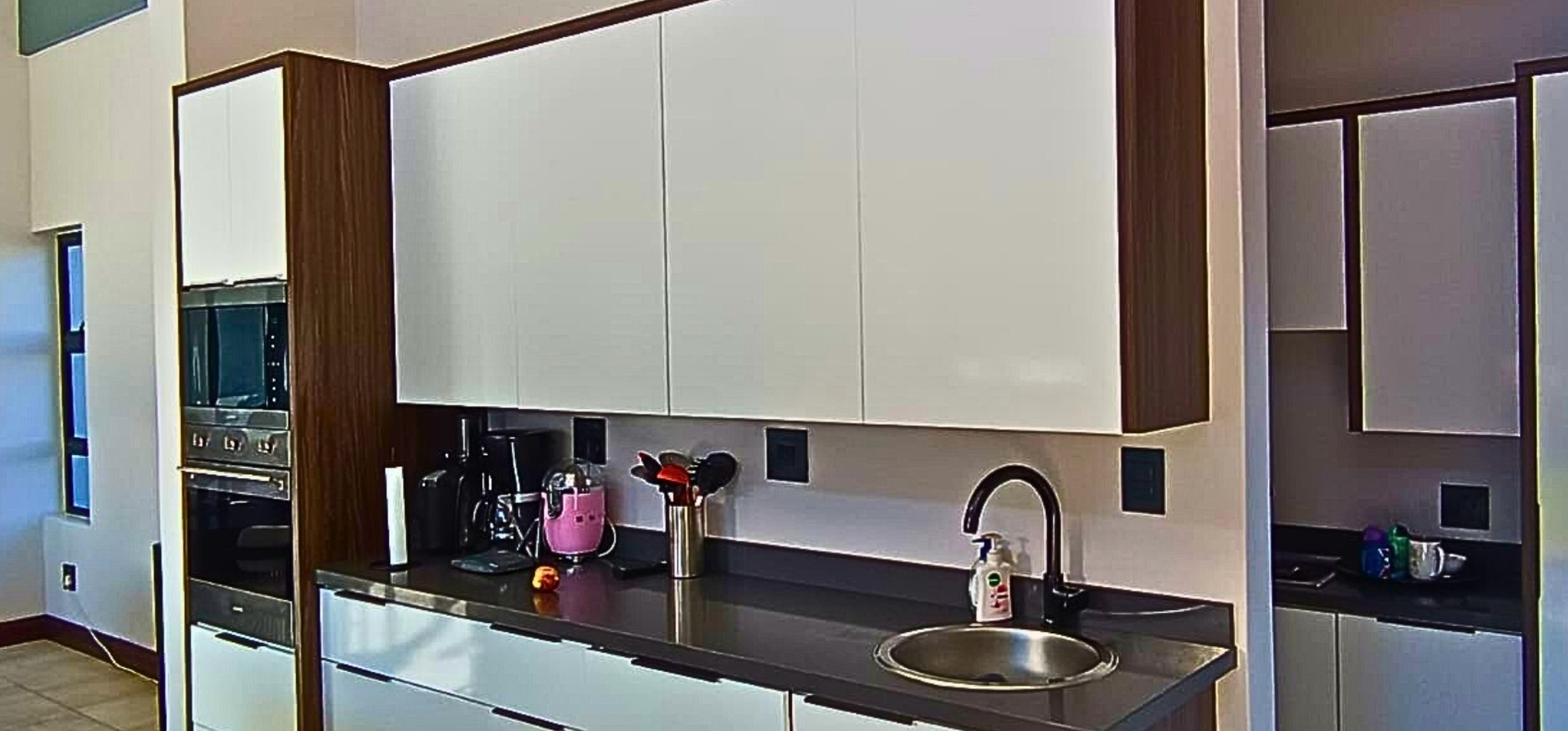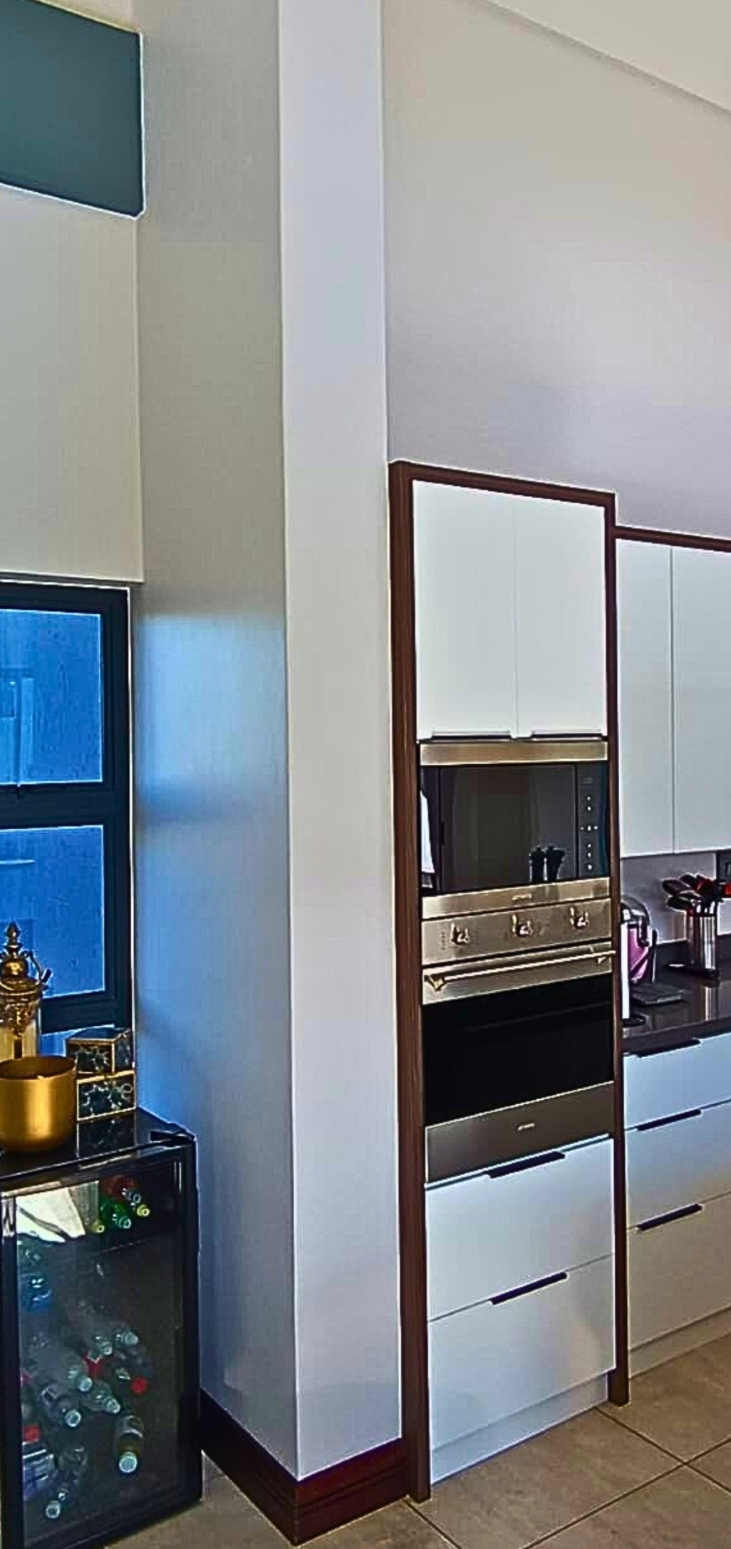 The open-plan layout seamlessly connects the kitchen, dining area, and lounge, creating an inviting space ideal for family living and entertaining. The modern kitchen features a separate scullery and offers a clear view of the garden and sparkling swimming pool — perfect for keeping an eye on the kids or hosting guests.