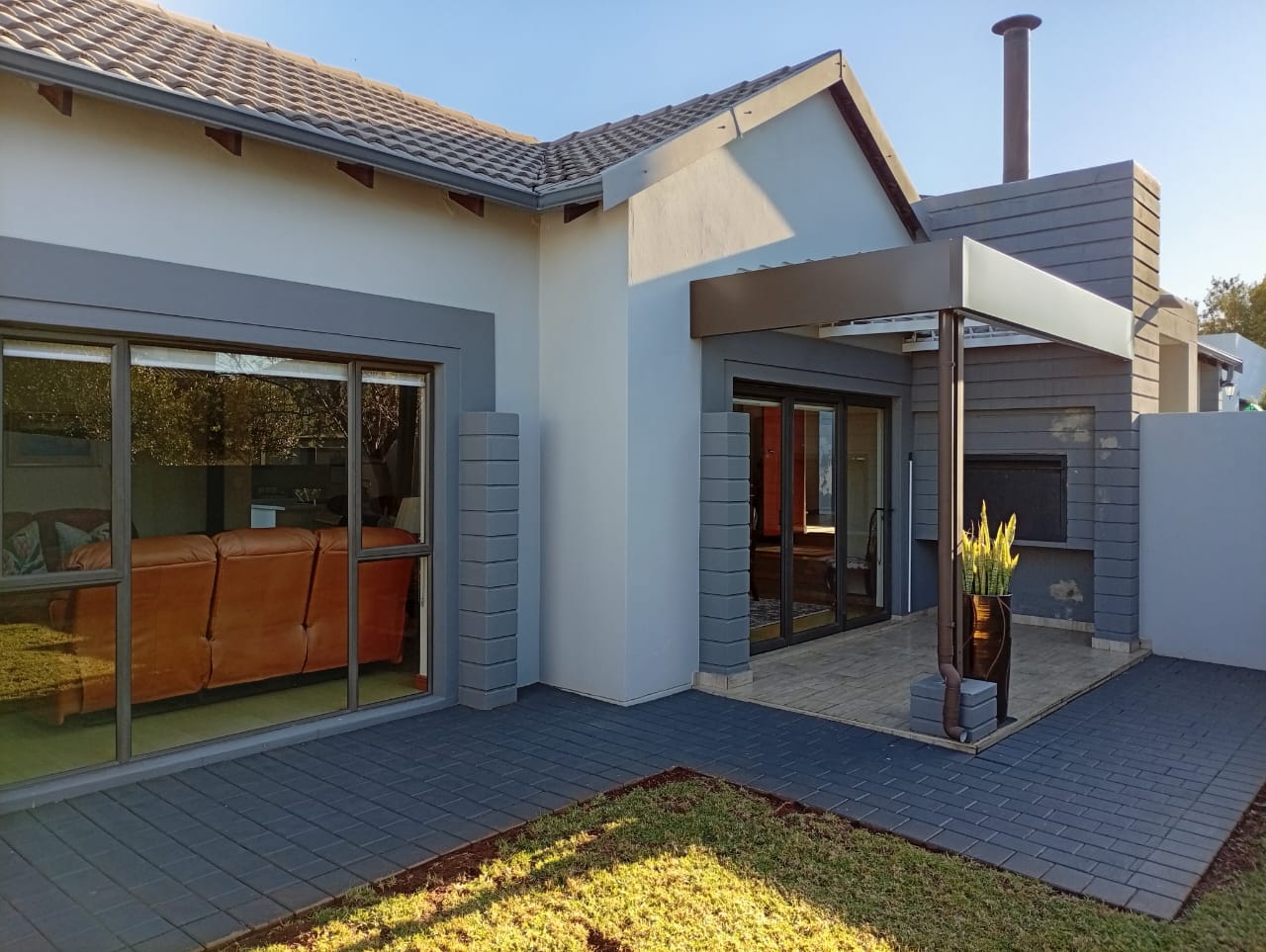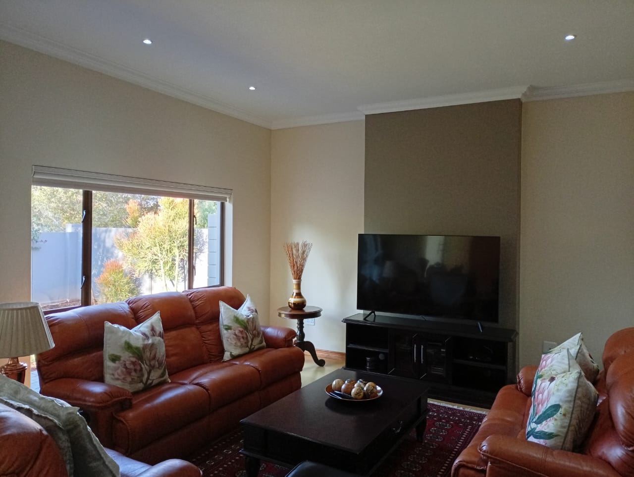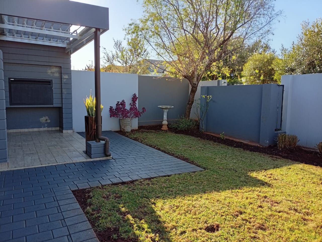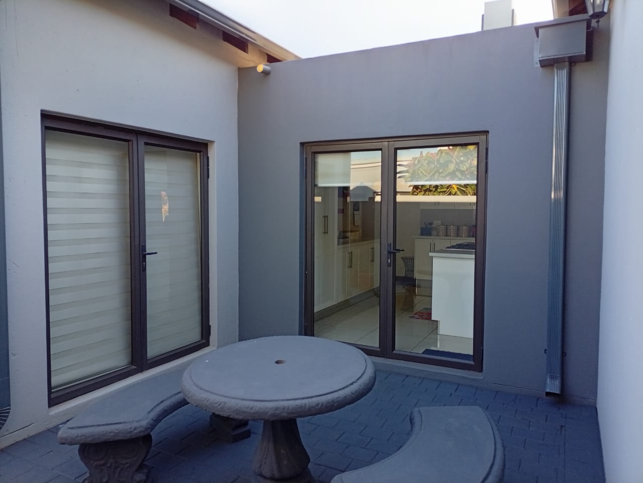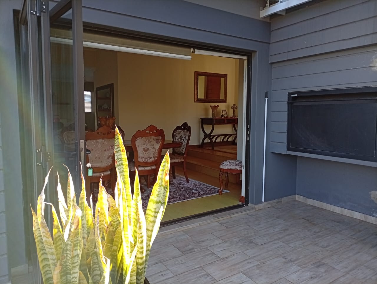 Just outside the kitchen, a cozy outdoor seating area invites you to enjoy family meals under the open sky. The living areas flow seamlessly to a covered patio with a built-in braai, overlooking a lovely, well-maintained garden—ideal for relaxing or entertaining guests.