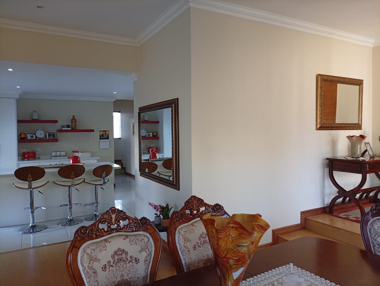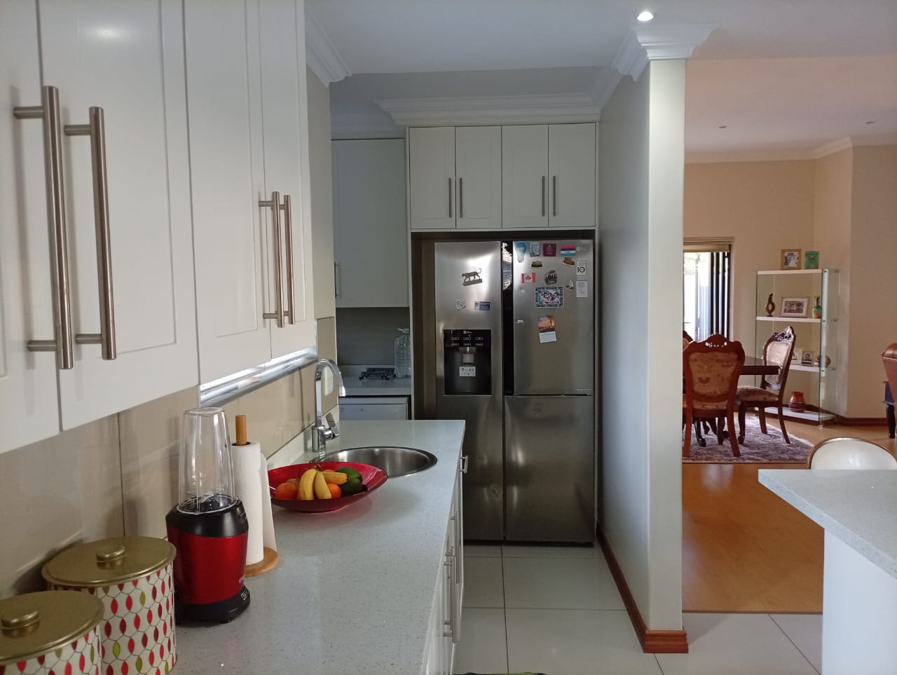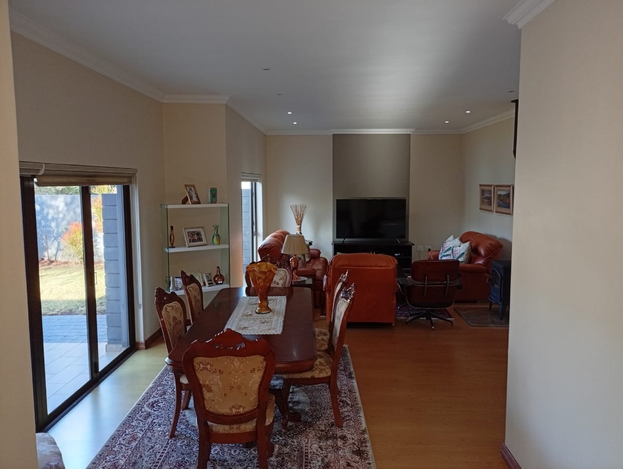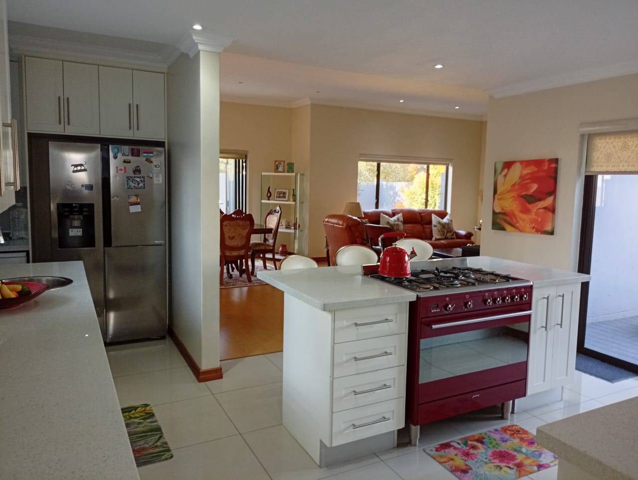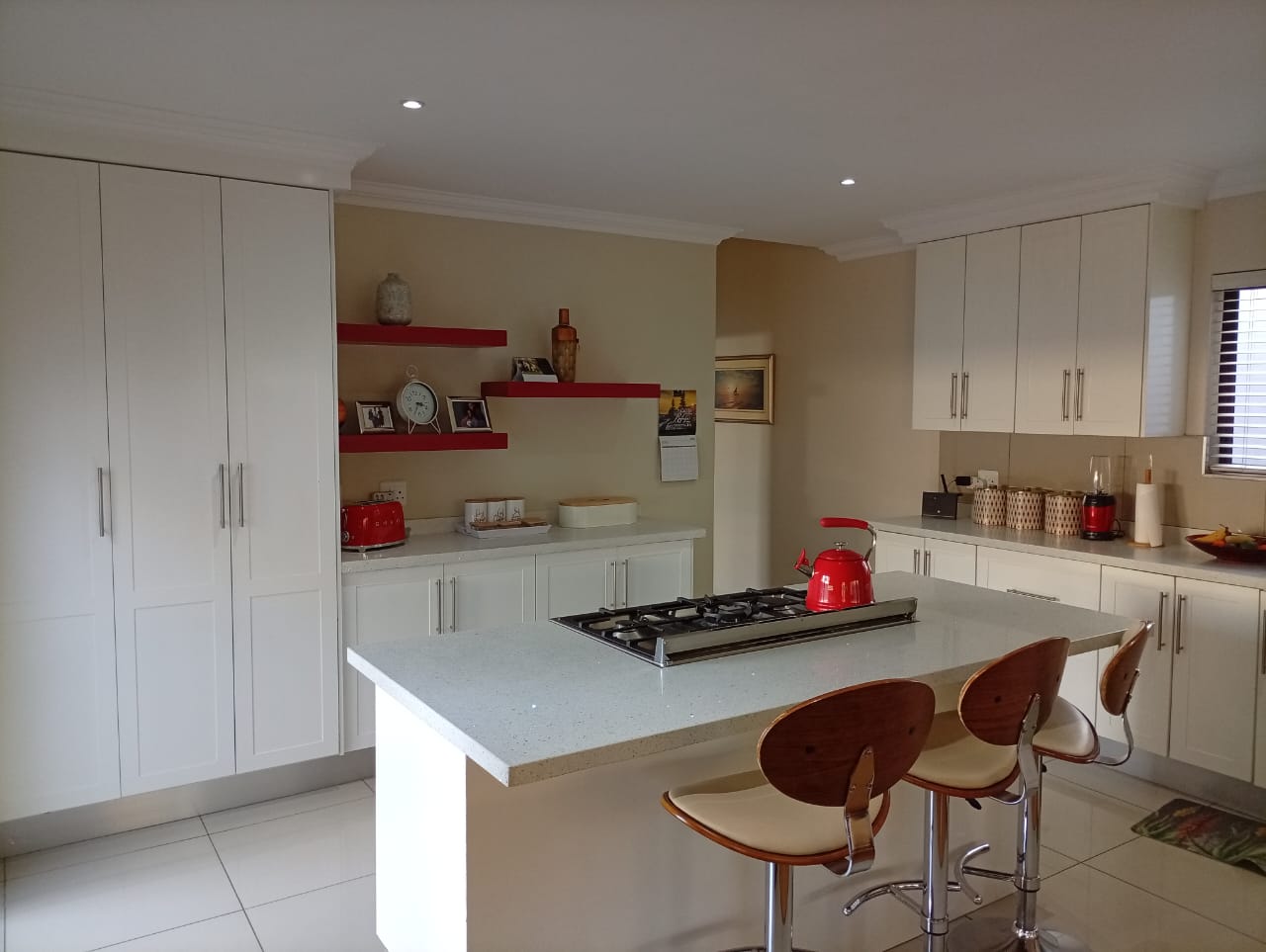 Just outside the kitchen, a cozy outdoor seating area invites you to enjoy family meals under the open sky. The living areas flow seamlessly to a covered patio with a built-in braai, overlooking a lovely, well-maintained garden—ideal for relaxing or entertaining guests.