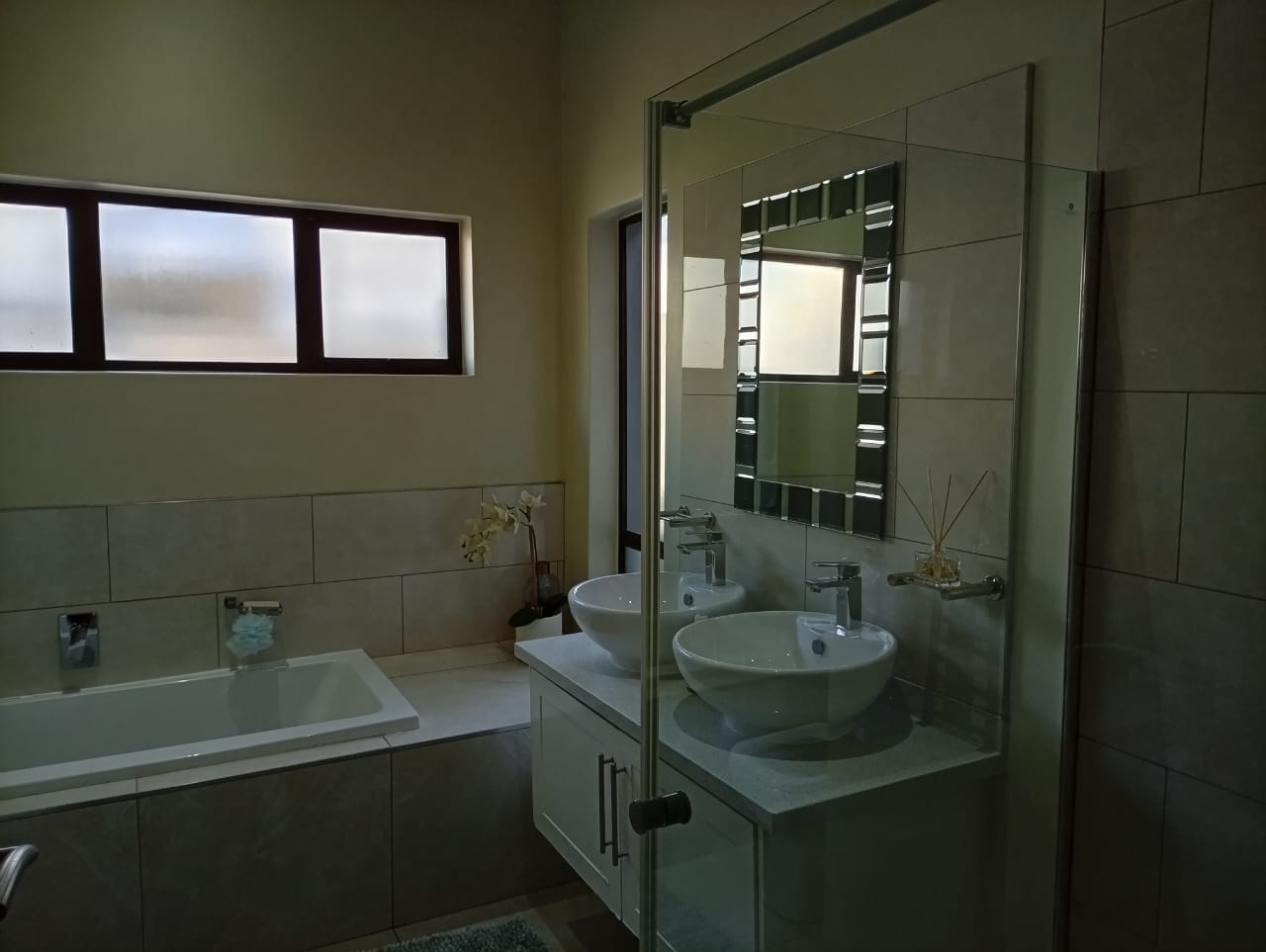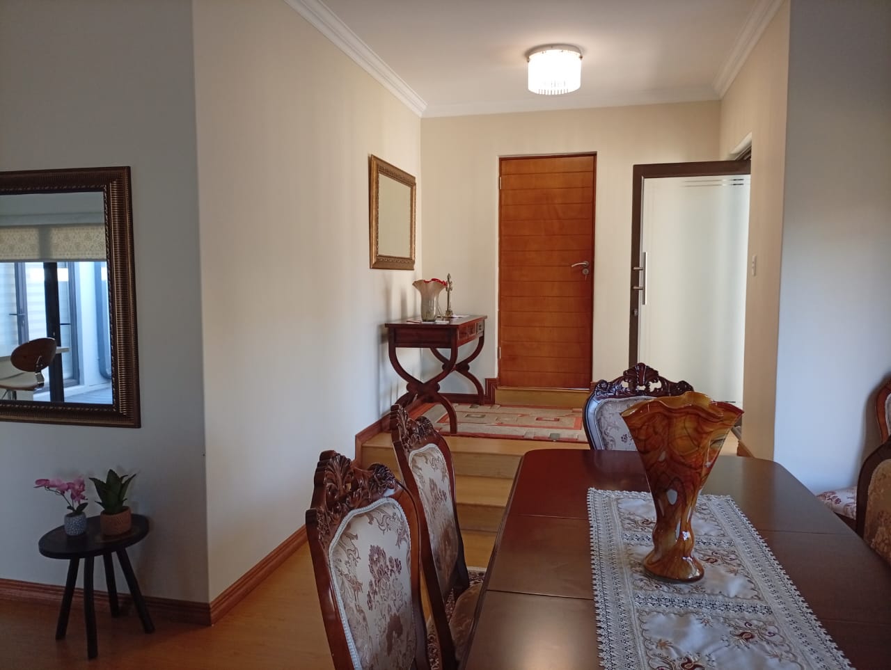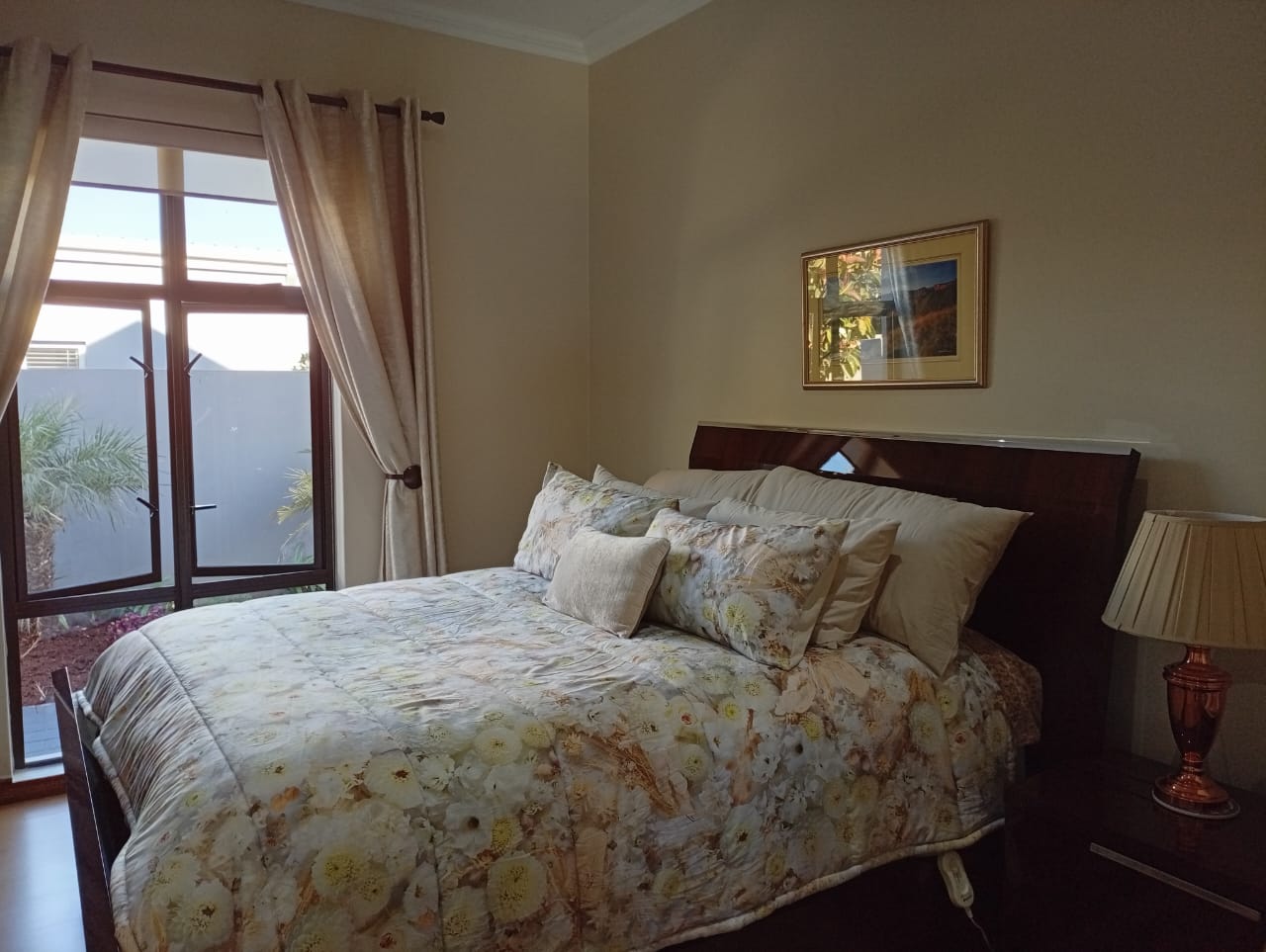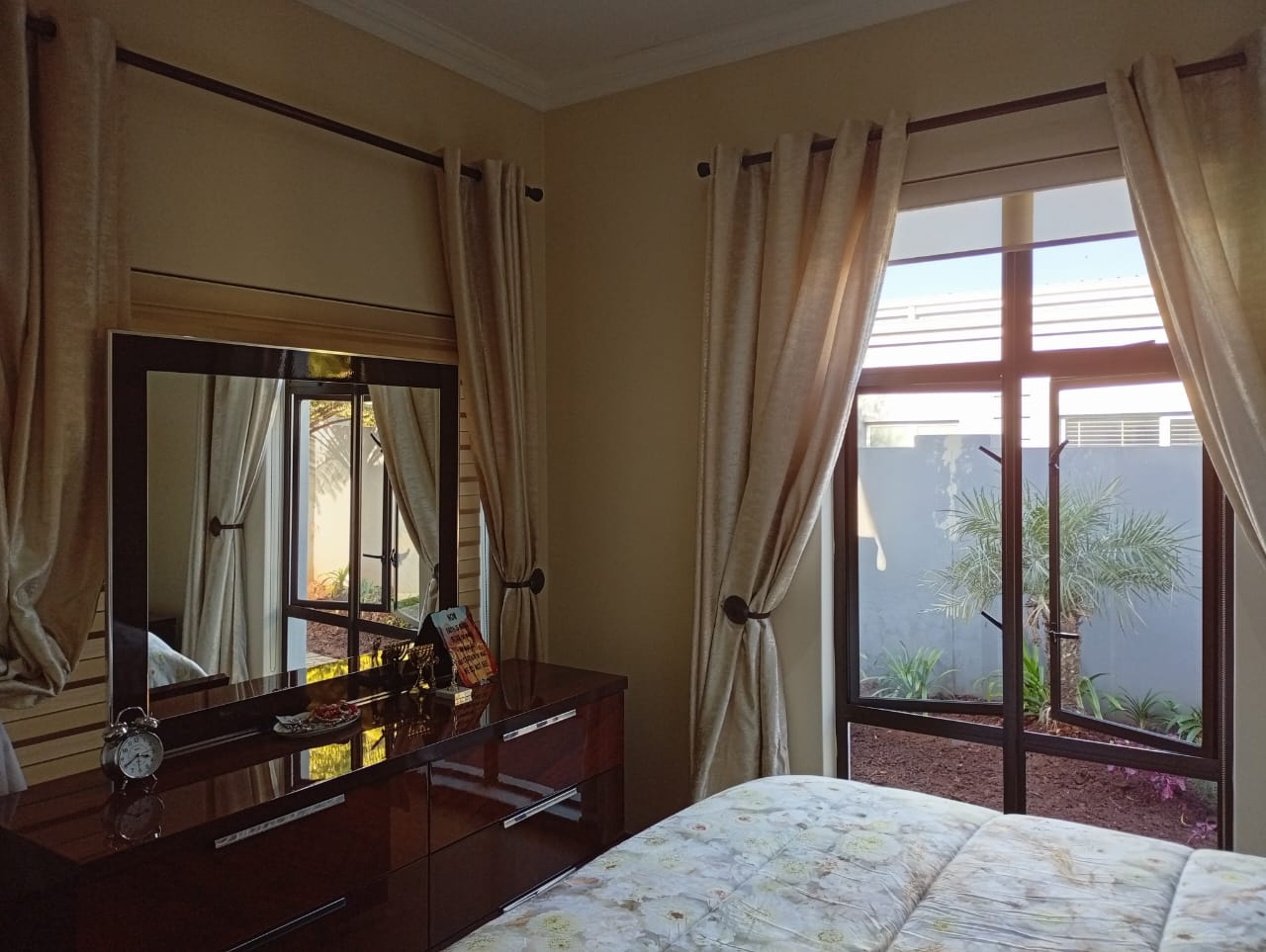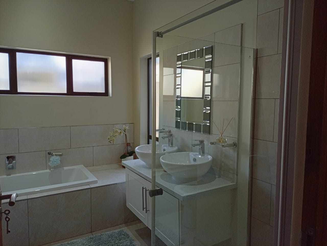 Just outside the kitchen, a cozy outdoor seating area invites you to enjoy family meals under the open sky. The living areas flow seamlessly to a covered patio with a built-in braai, overlooking a lovely, well-maintained garden—ideal for relaxing or entertaining guests.