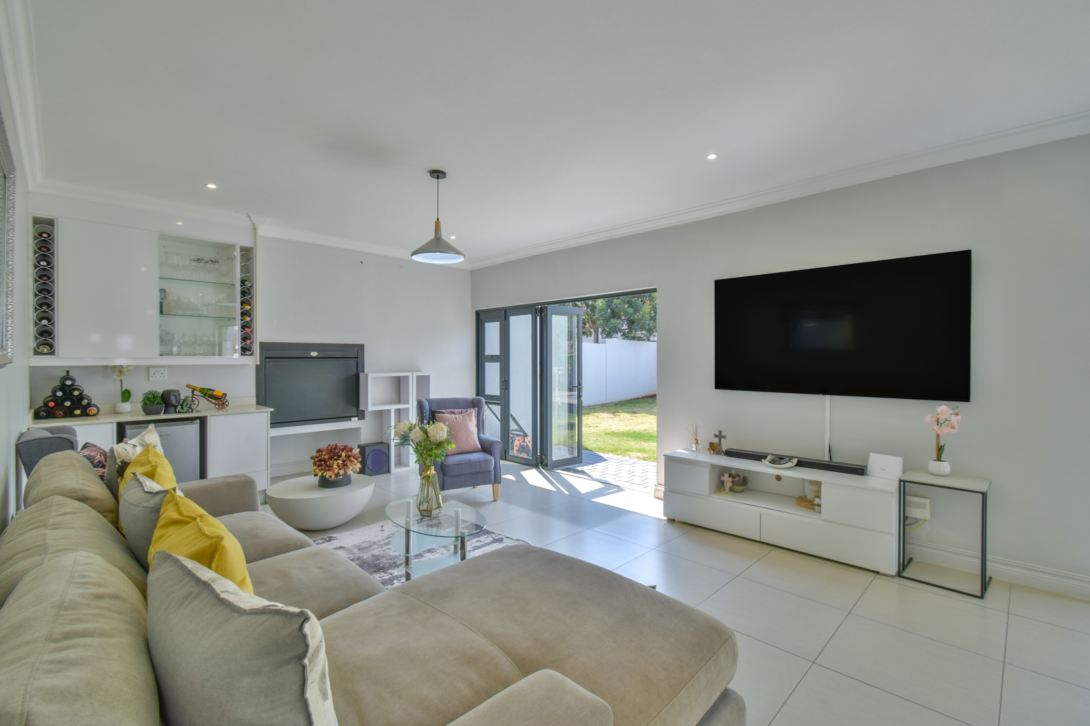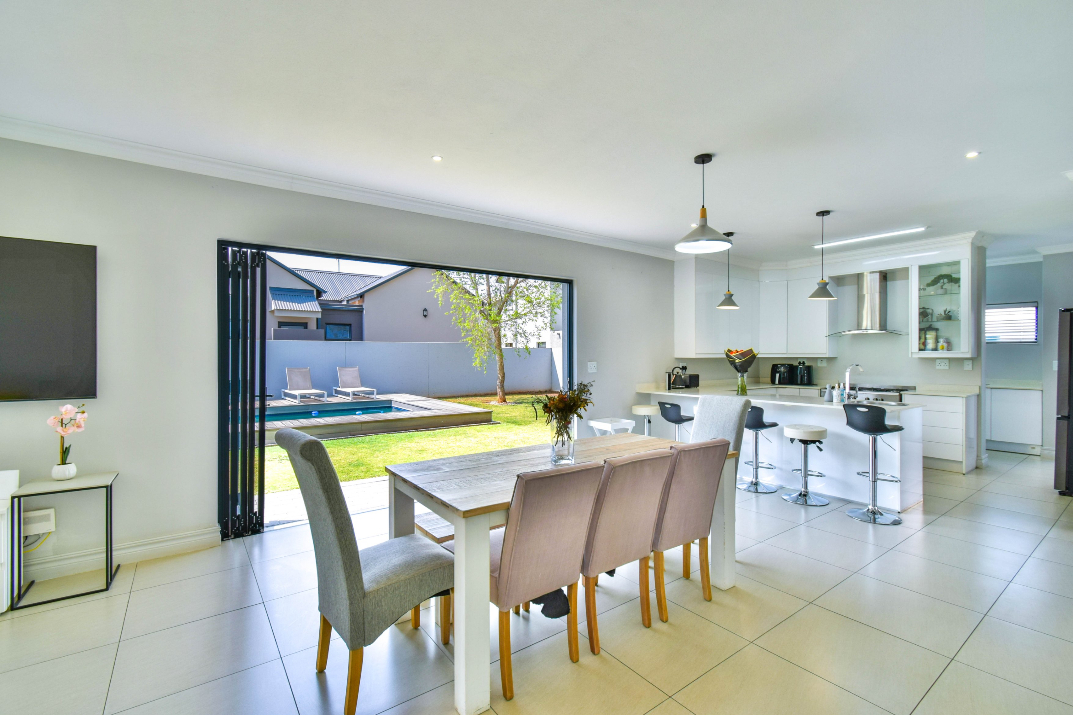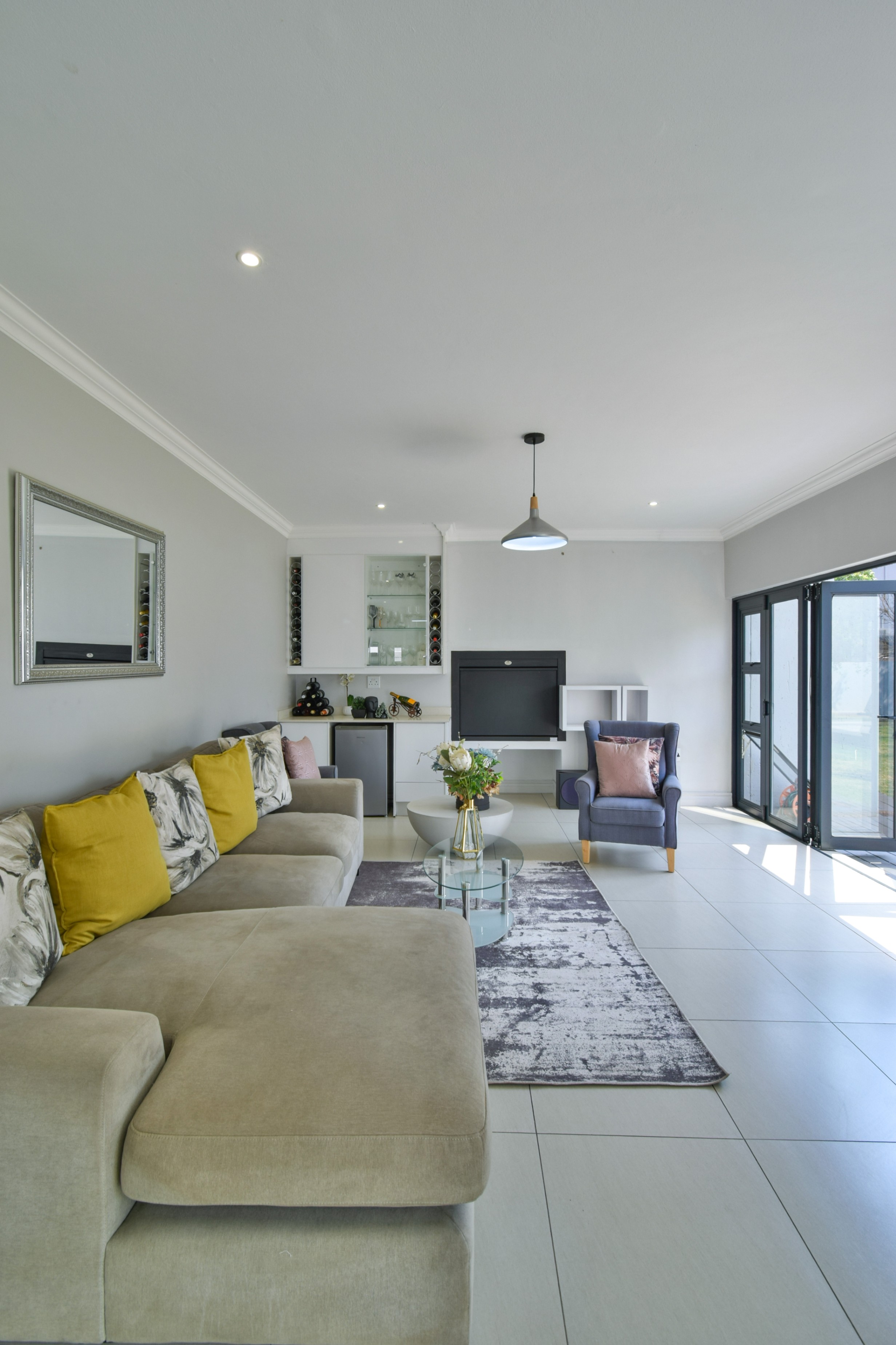 The lounge and dining area are perfect for entertaining, complete with a built-in braai, and both open through stacking doors onto a beautifully maintained garden and sparkling swimming pool - creating a seamless indoor-outdoor lifestyle.