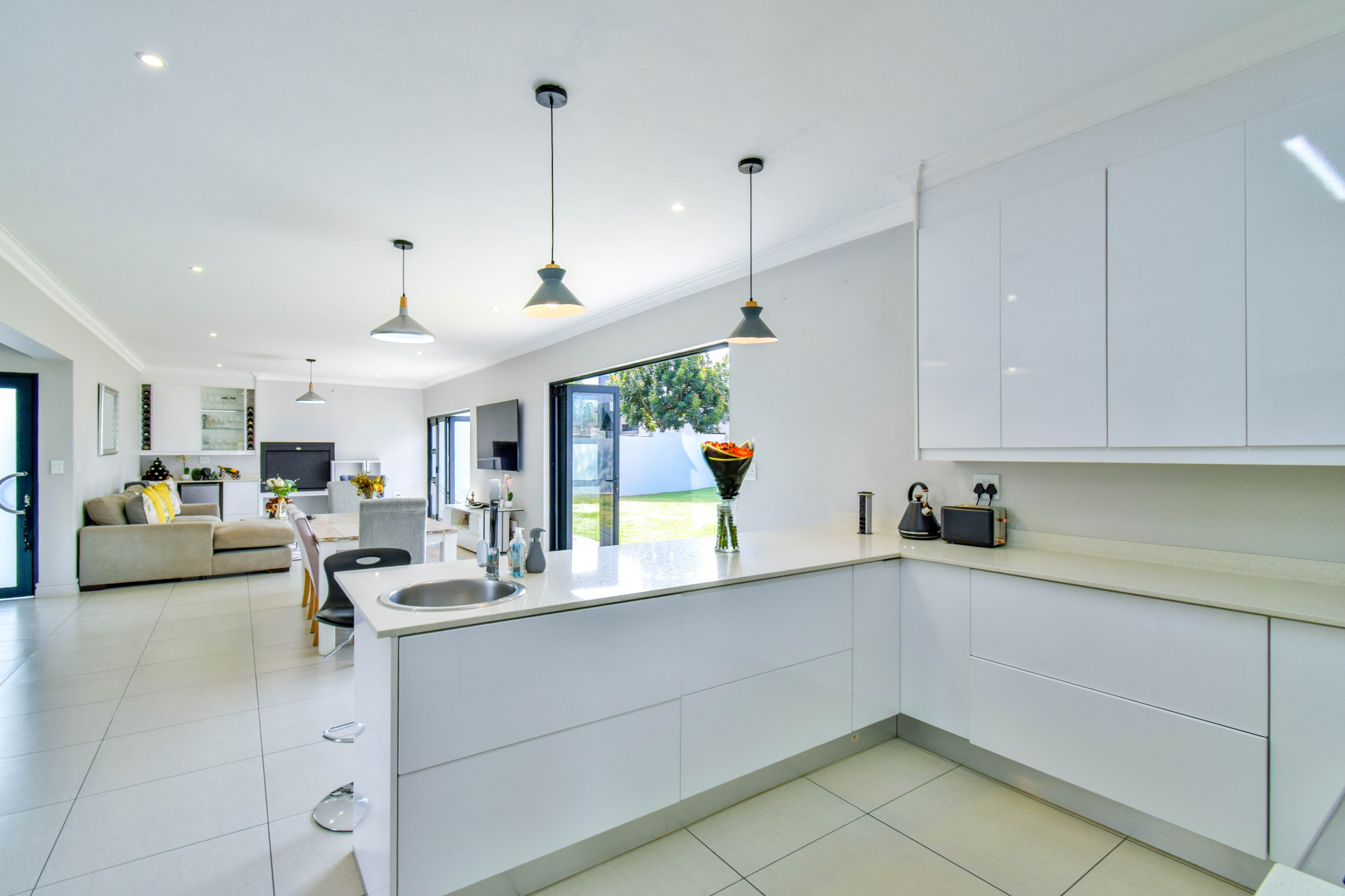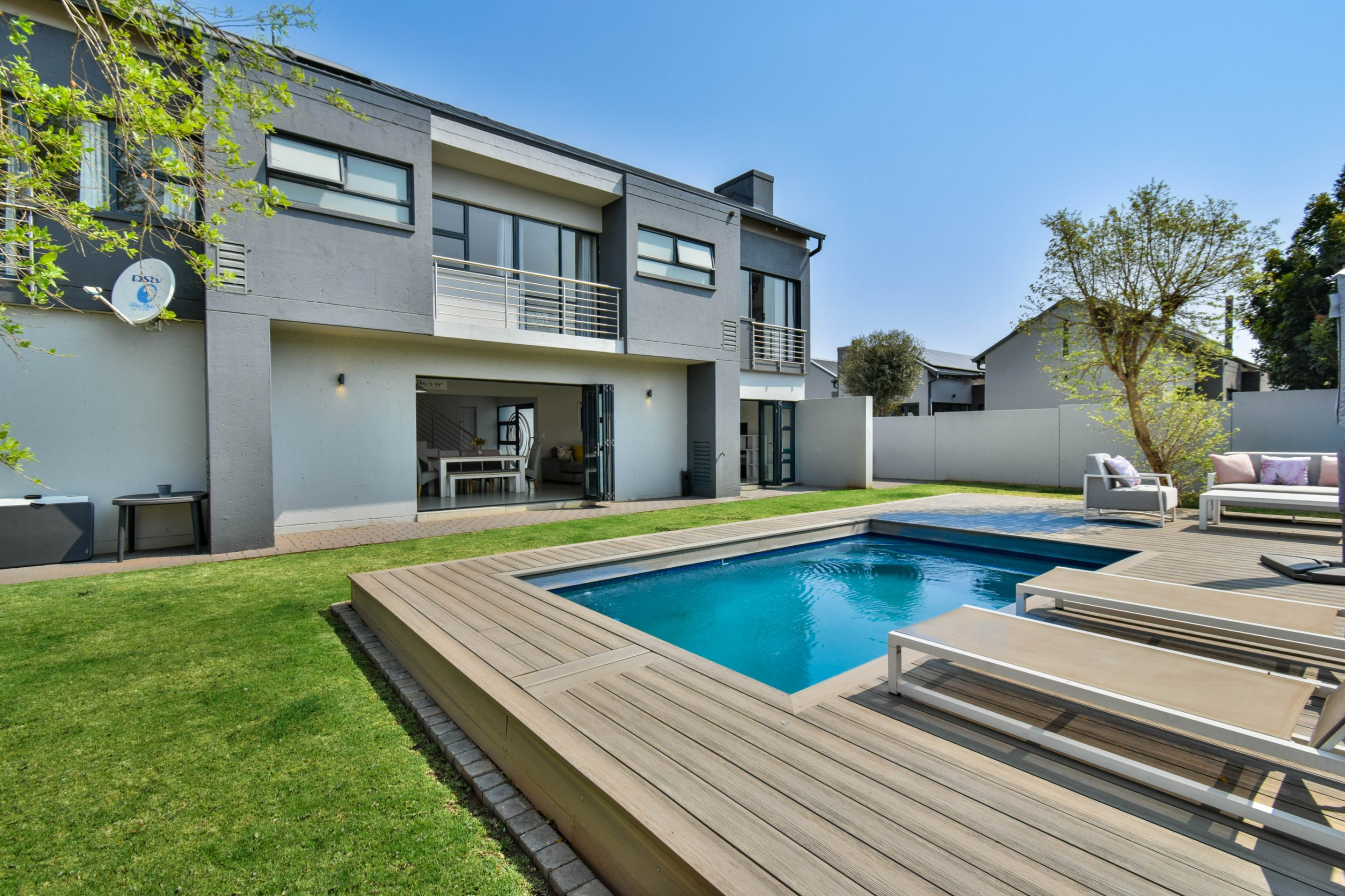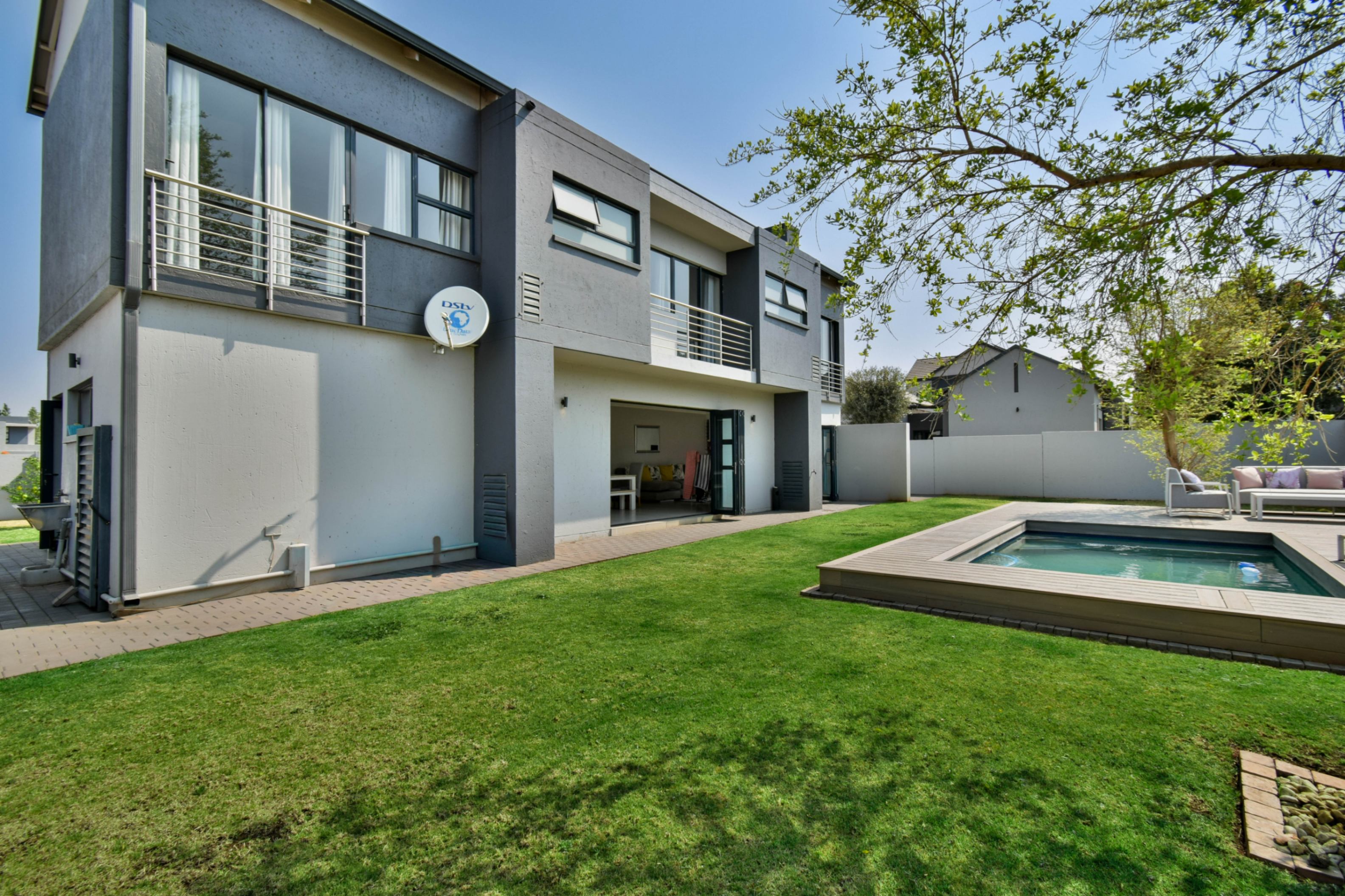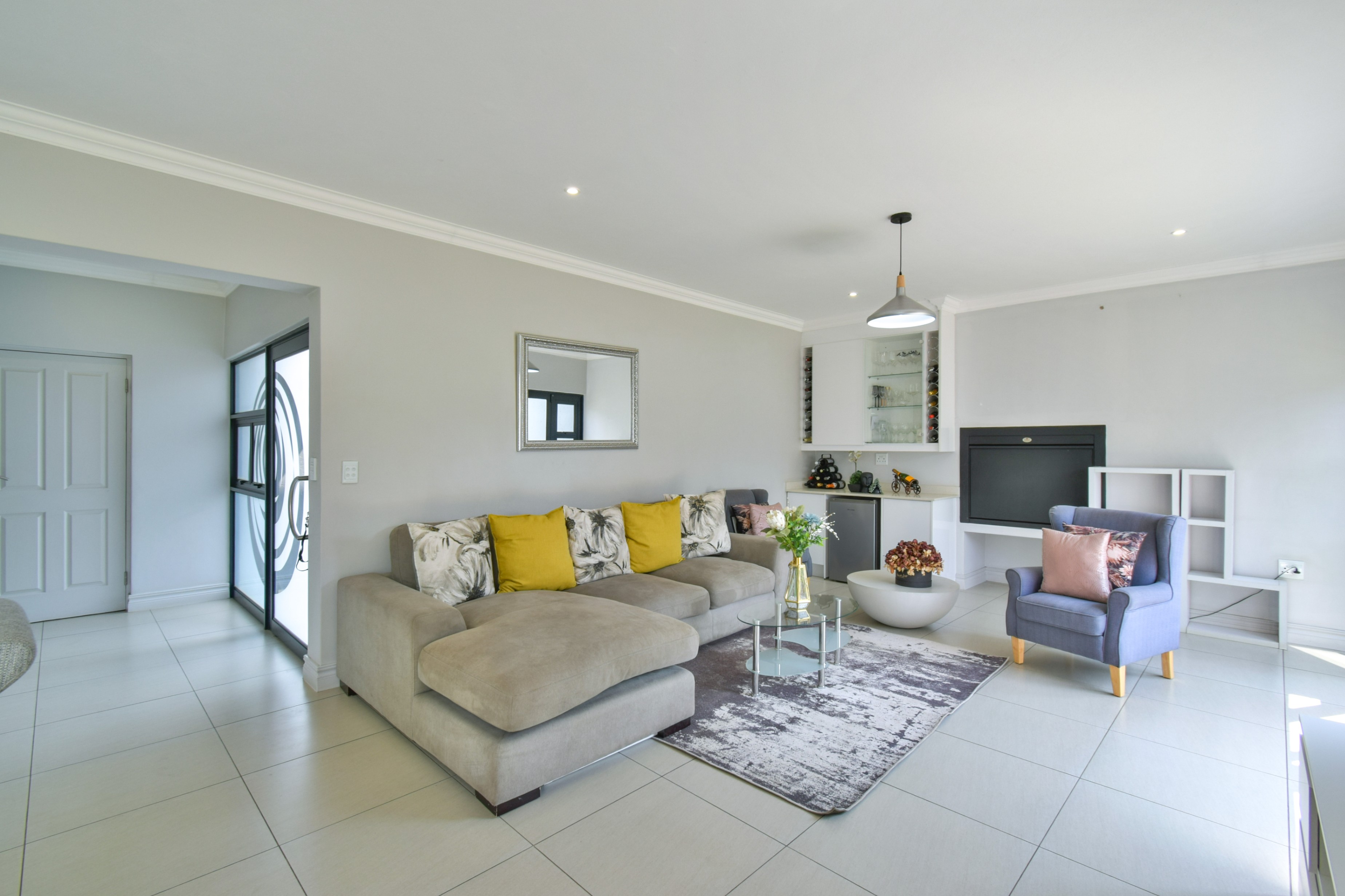 The lounge and dining area are perfect for entertaining, complete with a built-in braai, and both open through stacking doors onto a beautifully maintained garden and sparkling swimming pool - creating a seamless indoor-outdoor lifestyle.