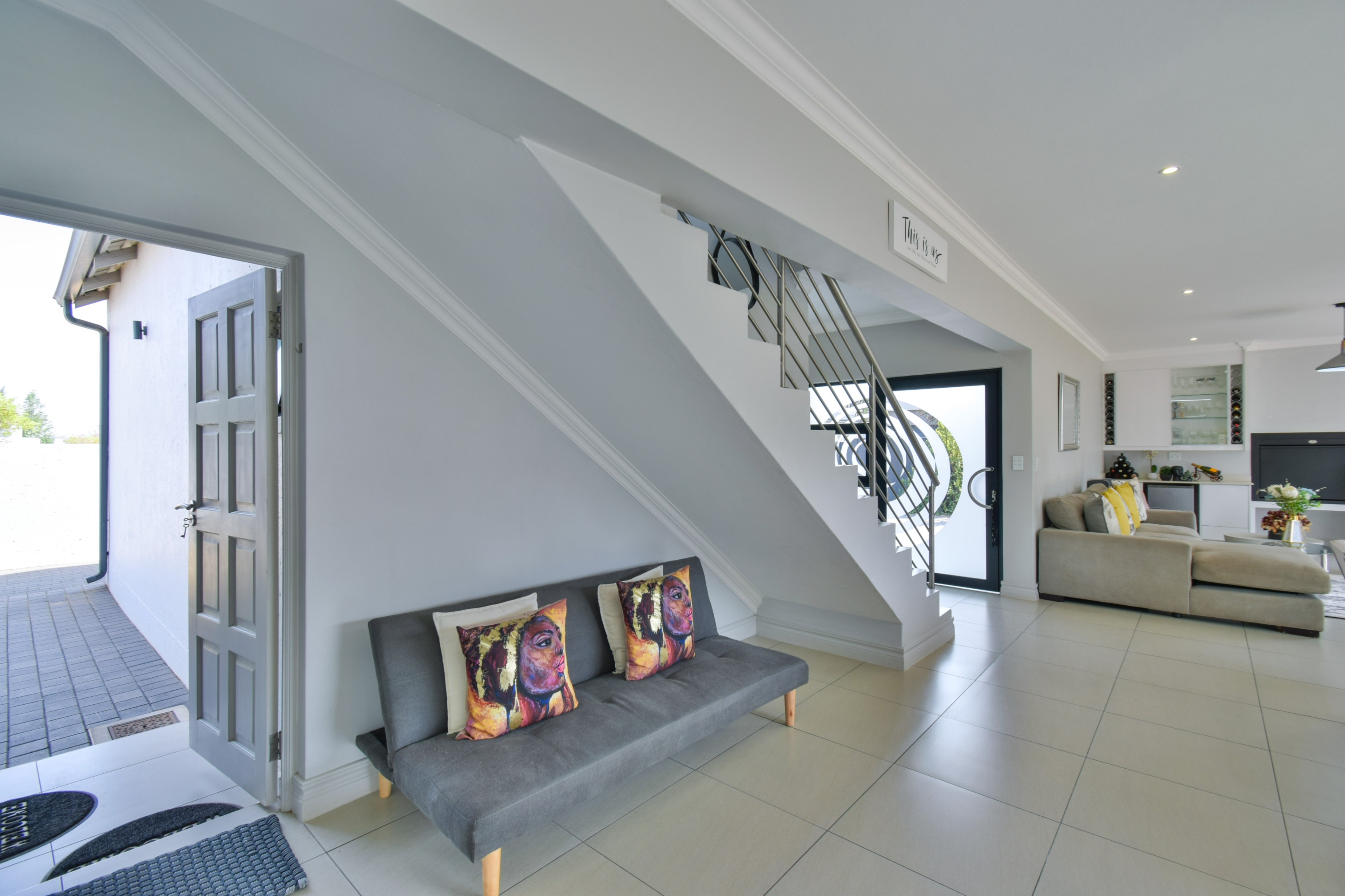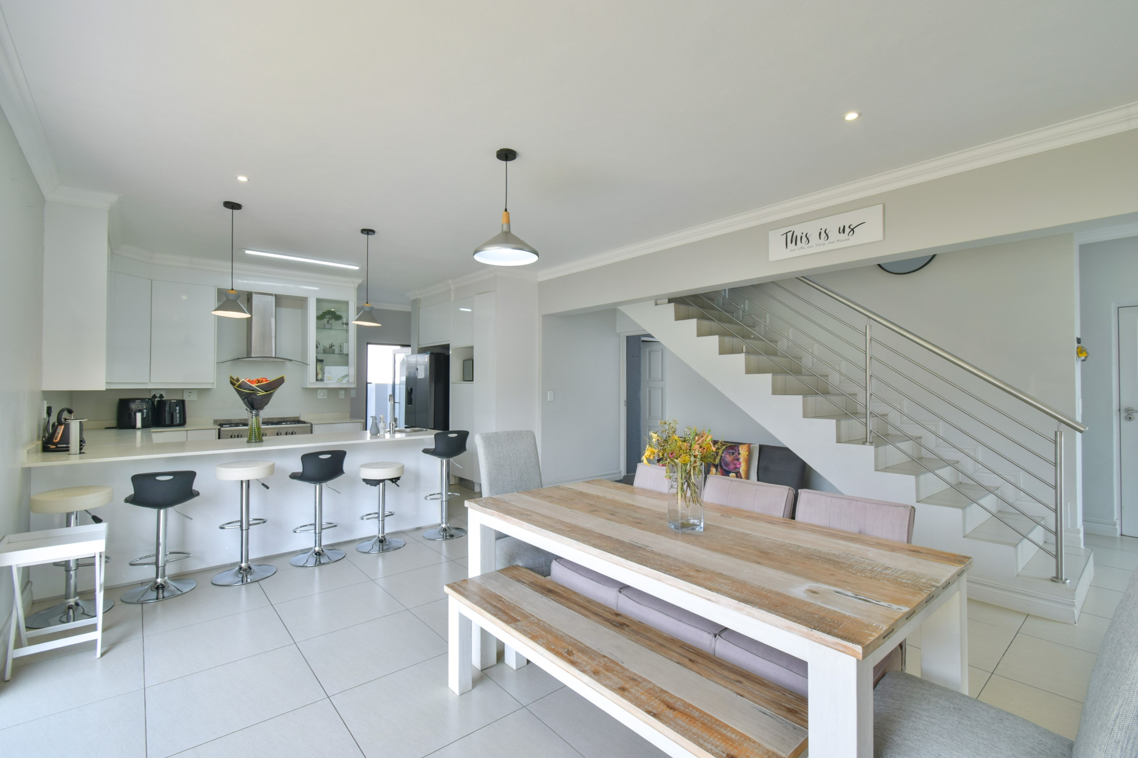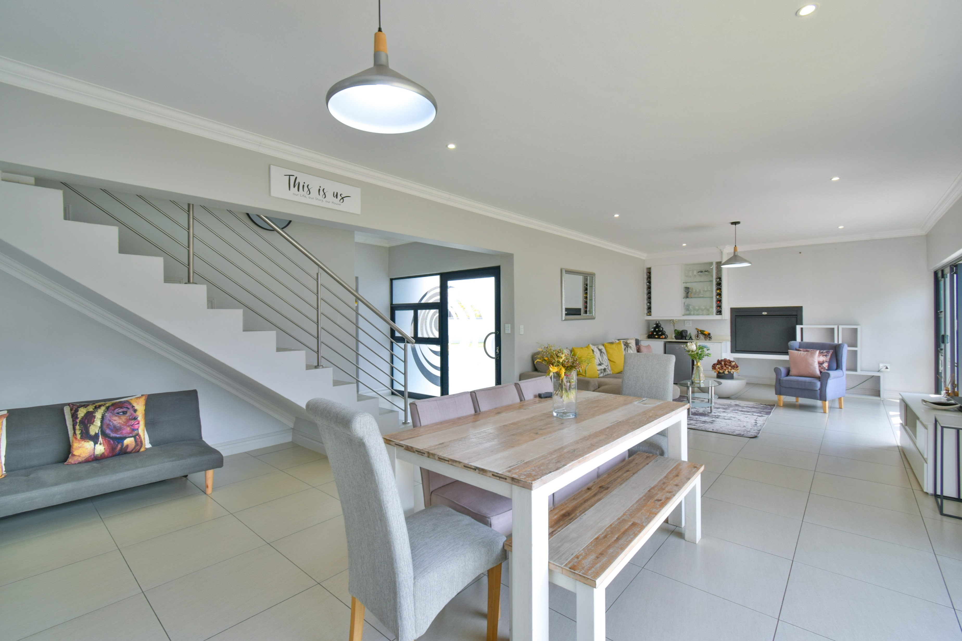 Upon entering, the staircase greets you straight ahead, with the heart of the home unfolding just beyond to the left. Here, you’ll find a spacious open-plan lounge, dining area, and kitchen designed to flow seamlessly for effortless living. The kitchen overlooks the living areas and features ample cupboard space, complemented by a separate scullery for added convenience.