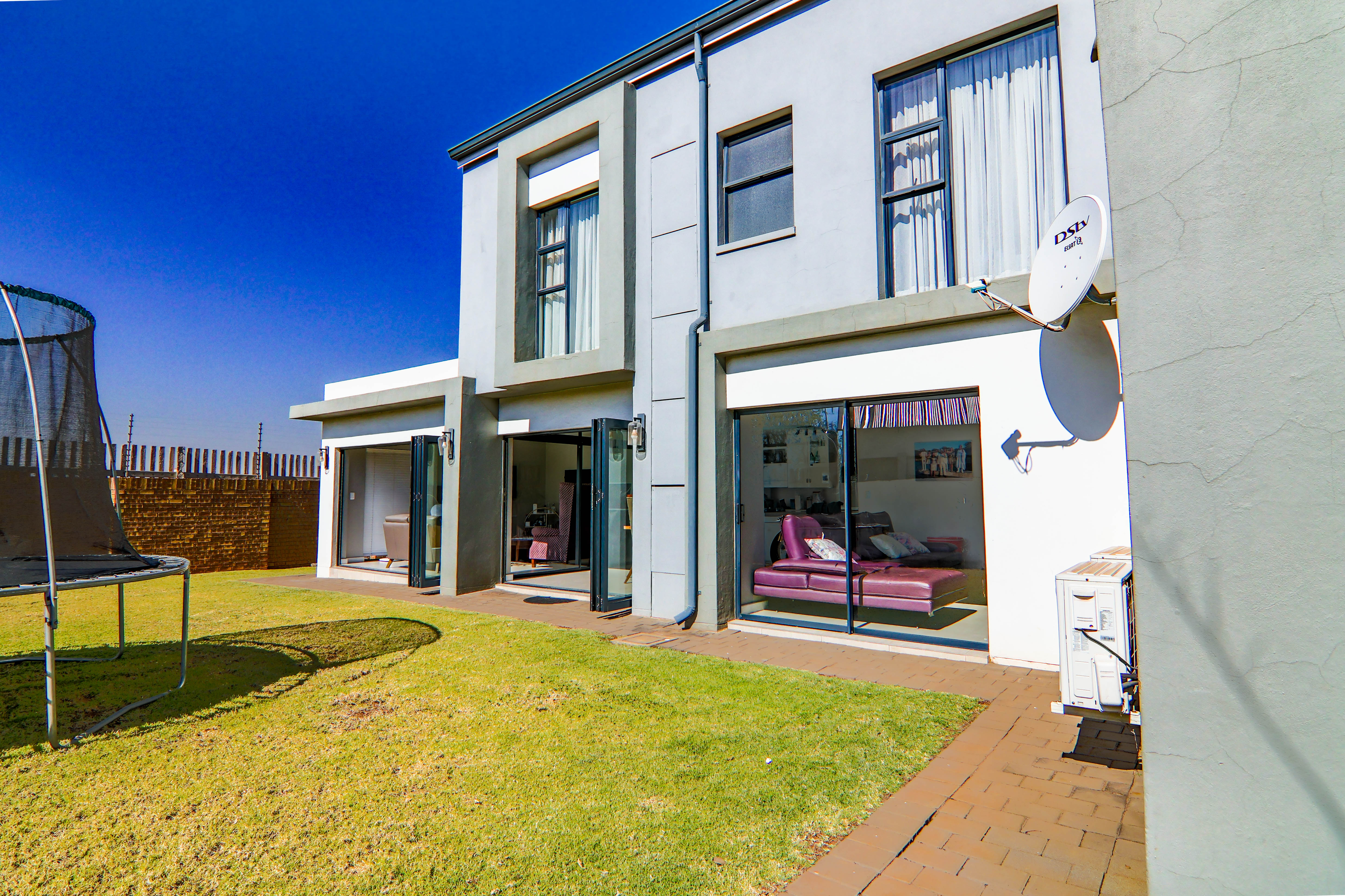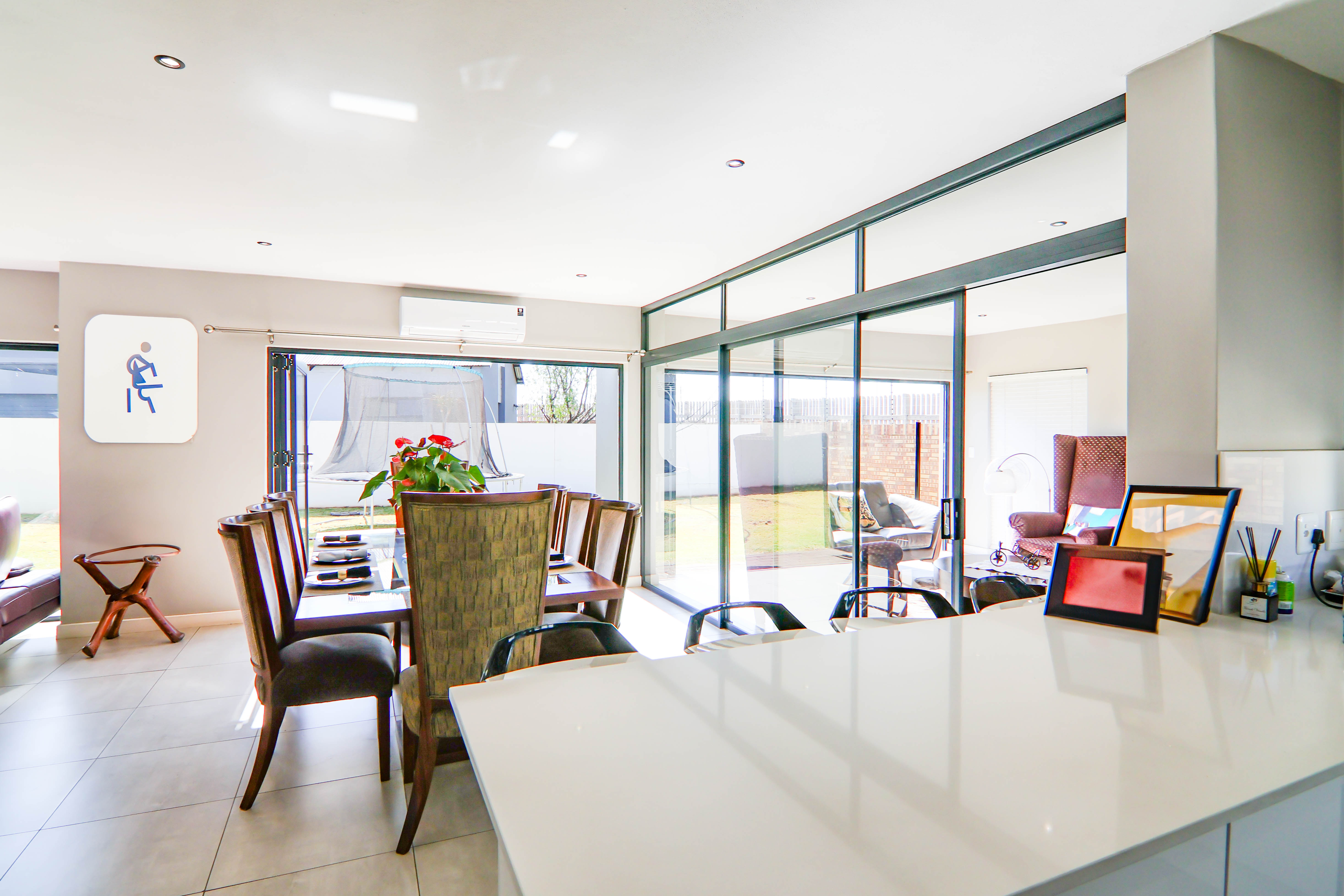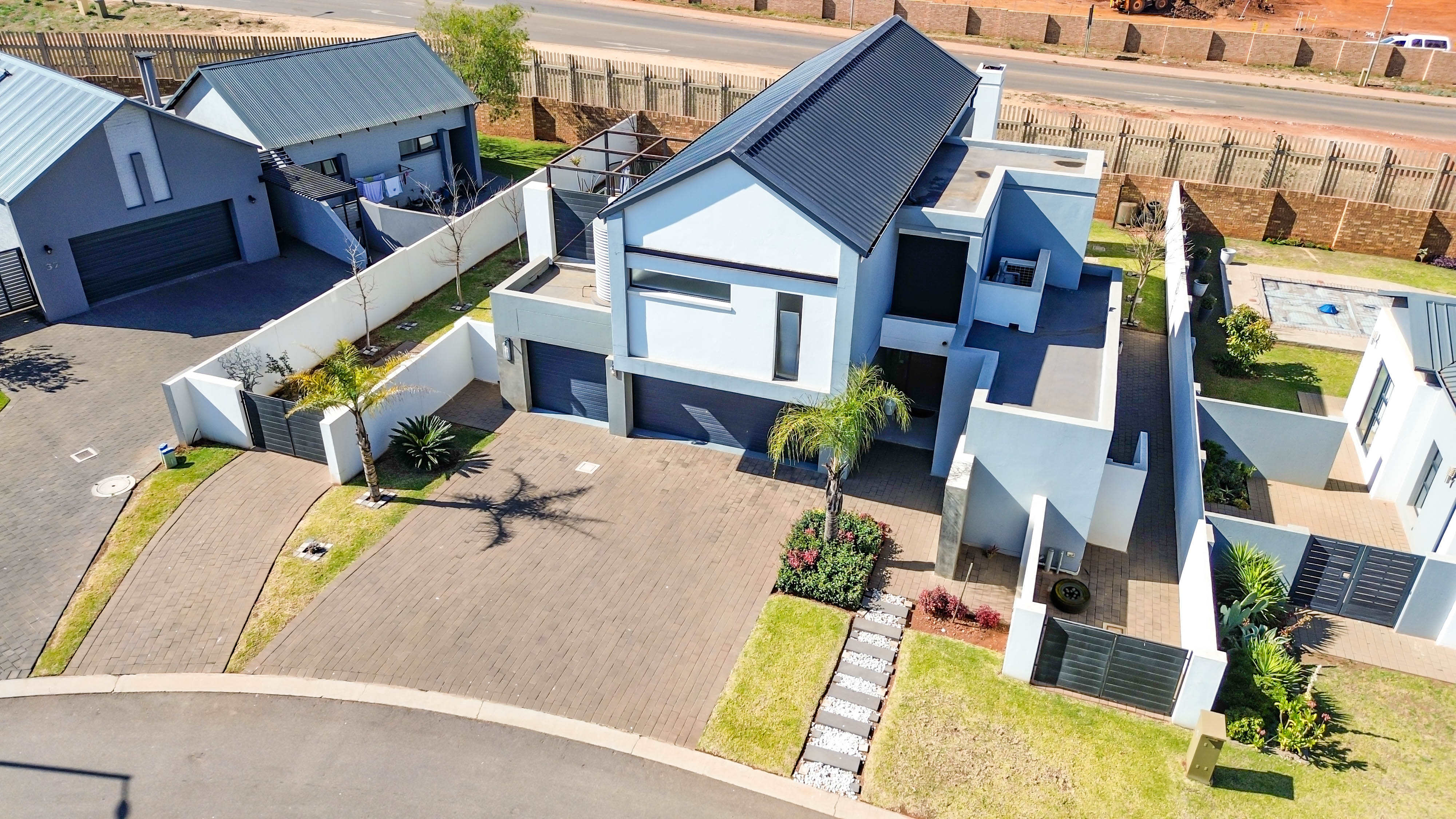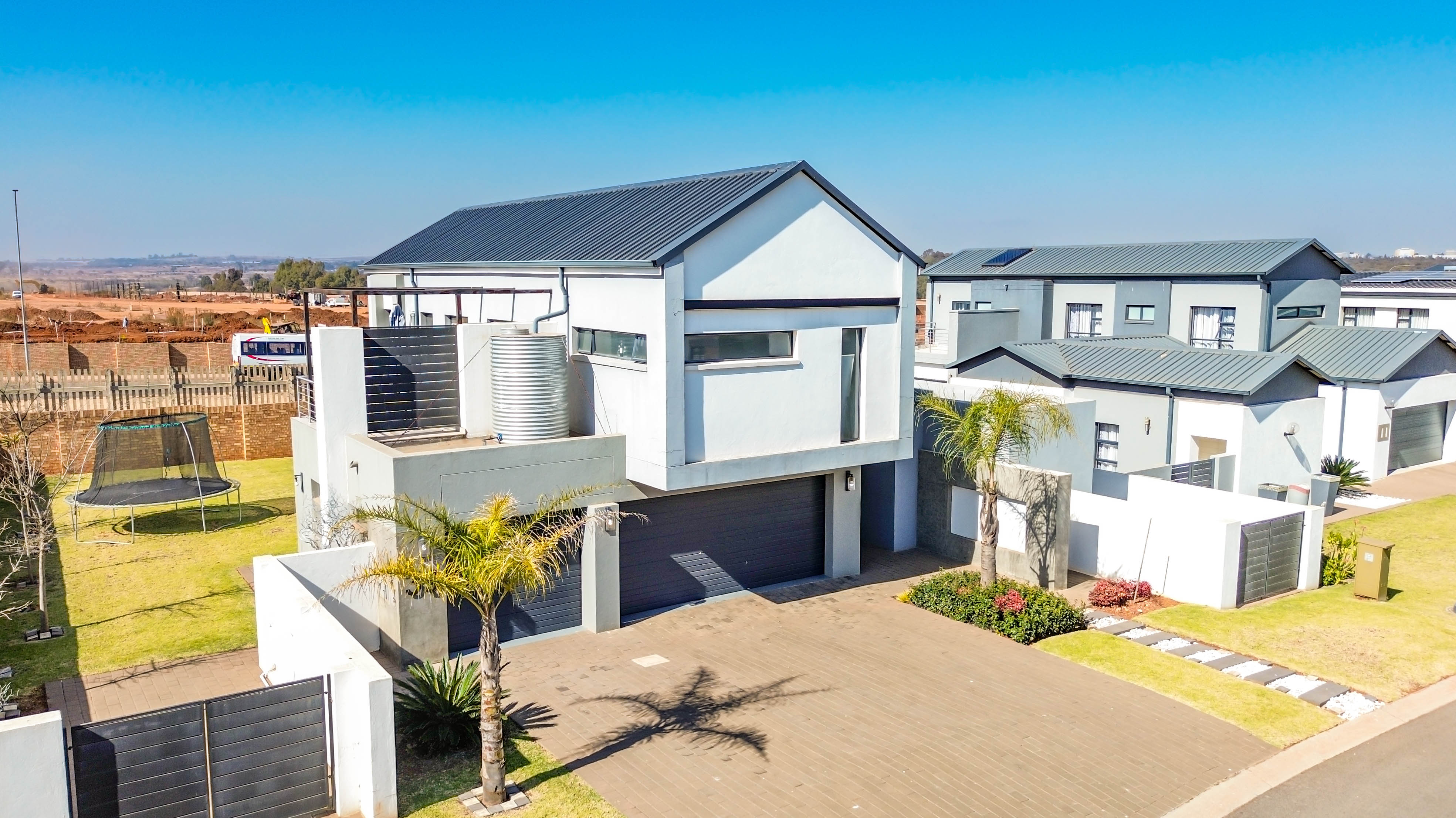 Sole-Mandated. This neat and well-planned double-storey home is perfectly located in Midstream, just off Korhaan Road and near the exciting new shopping centre development. It offers 3 spacious bedrooms, 2 full bathrooms upstairs (main en-suite), and a guest toilet downstairs. There’s also a large linen cupboard upstairs with potential to convert into a fourth room or study. The modern kitchen includes a Smeg gas stove and oven, a scullery with space for three undercounter appliances, and stacker doors that open up the dining area and sunny enclosed patio to the garden. Staff quarters with a private bathroom are also included, making this a practical choice for families. Outside, you’ll find 3 garages, parking for up to 6 cars, and gates on both sides of the home that can accommodate additional vehicles. A 3000L JoJo tank, full irrigation system, washing basins, and a neat garden complete the picture. This home is pet-friendly, functional, and in a very convenient part of Midstream.