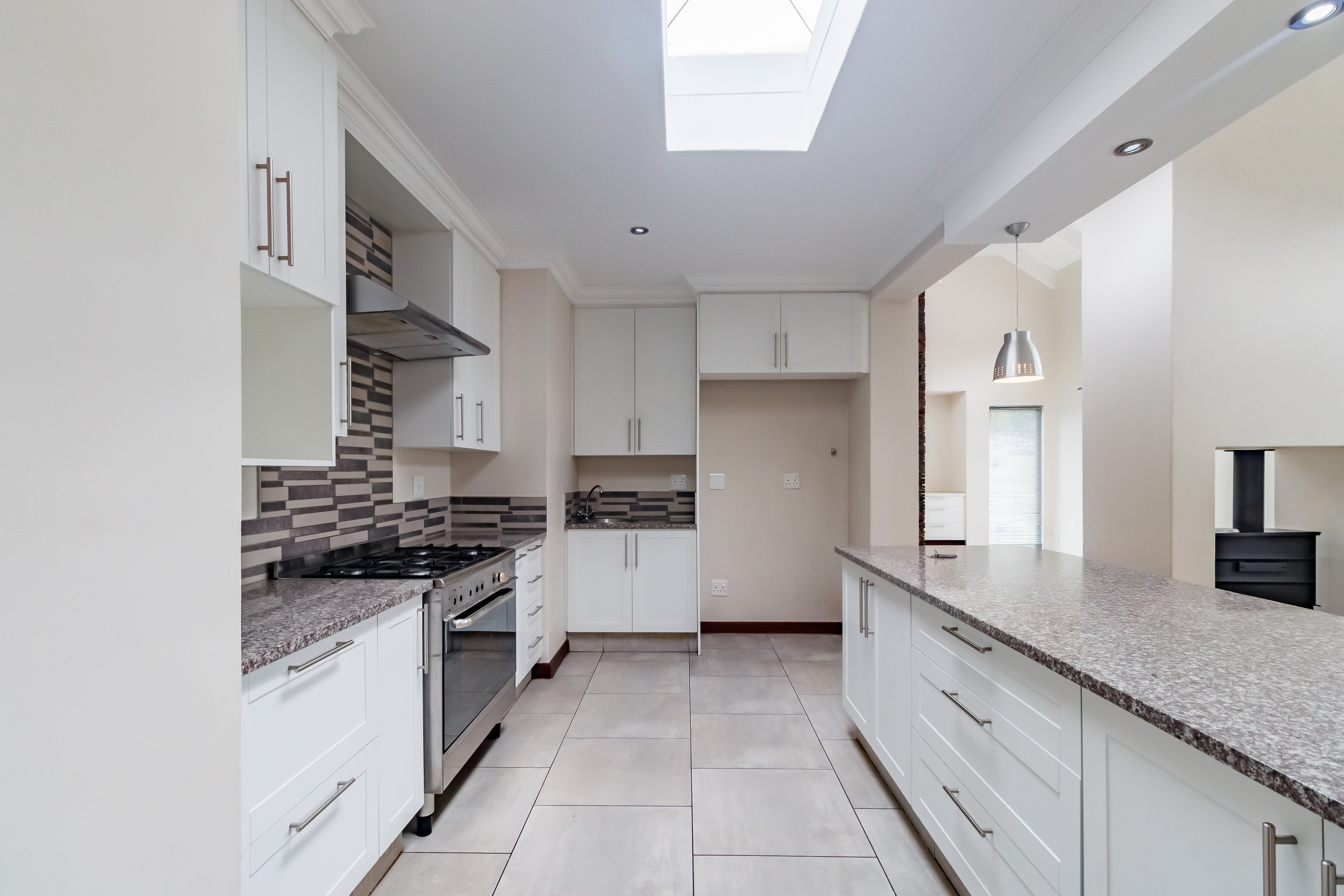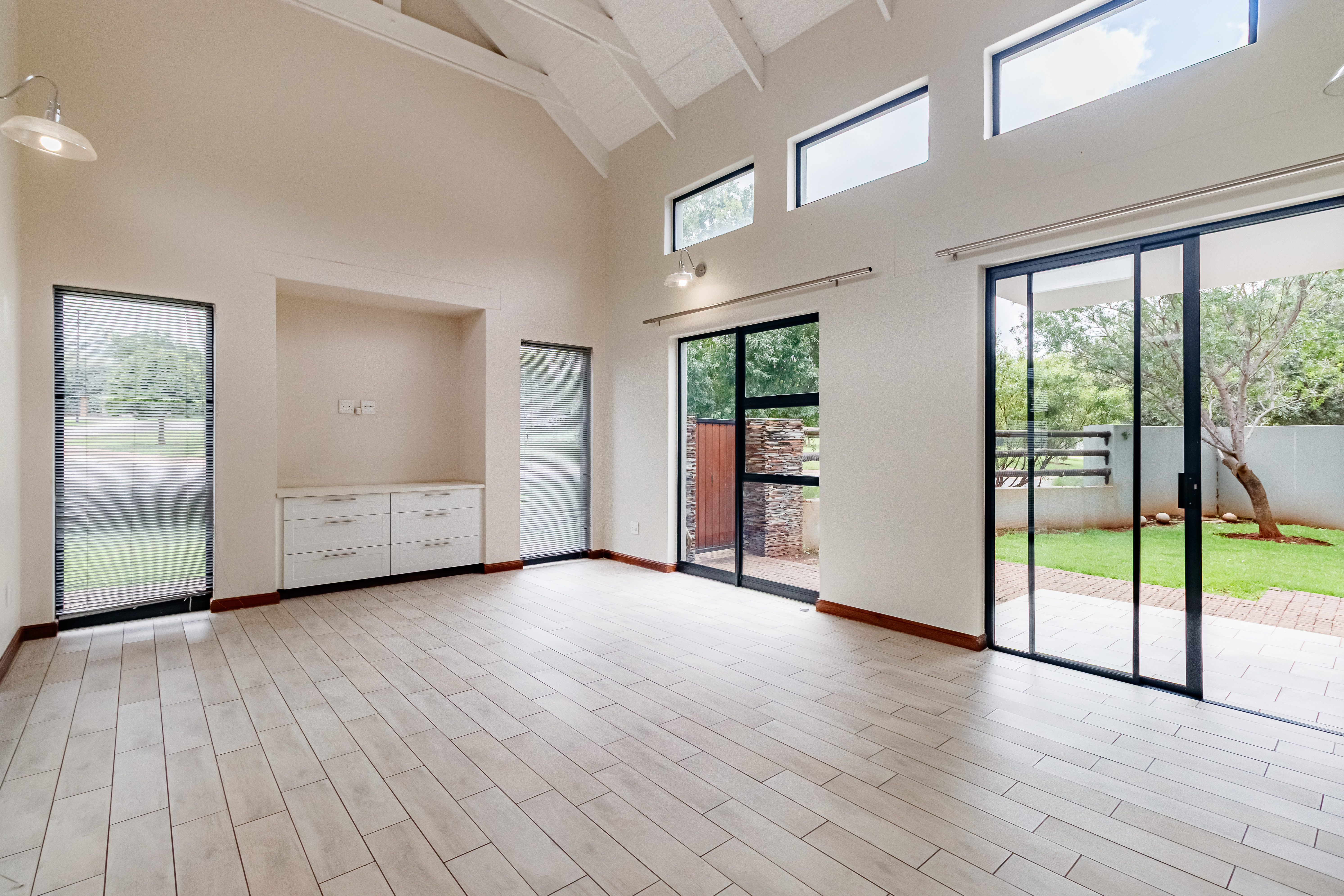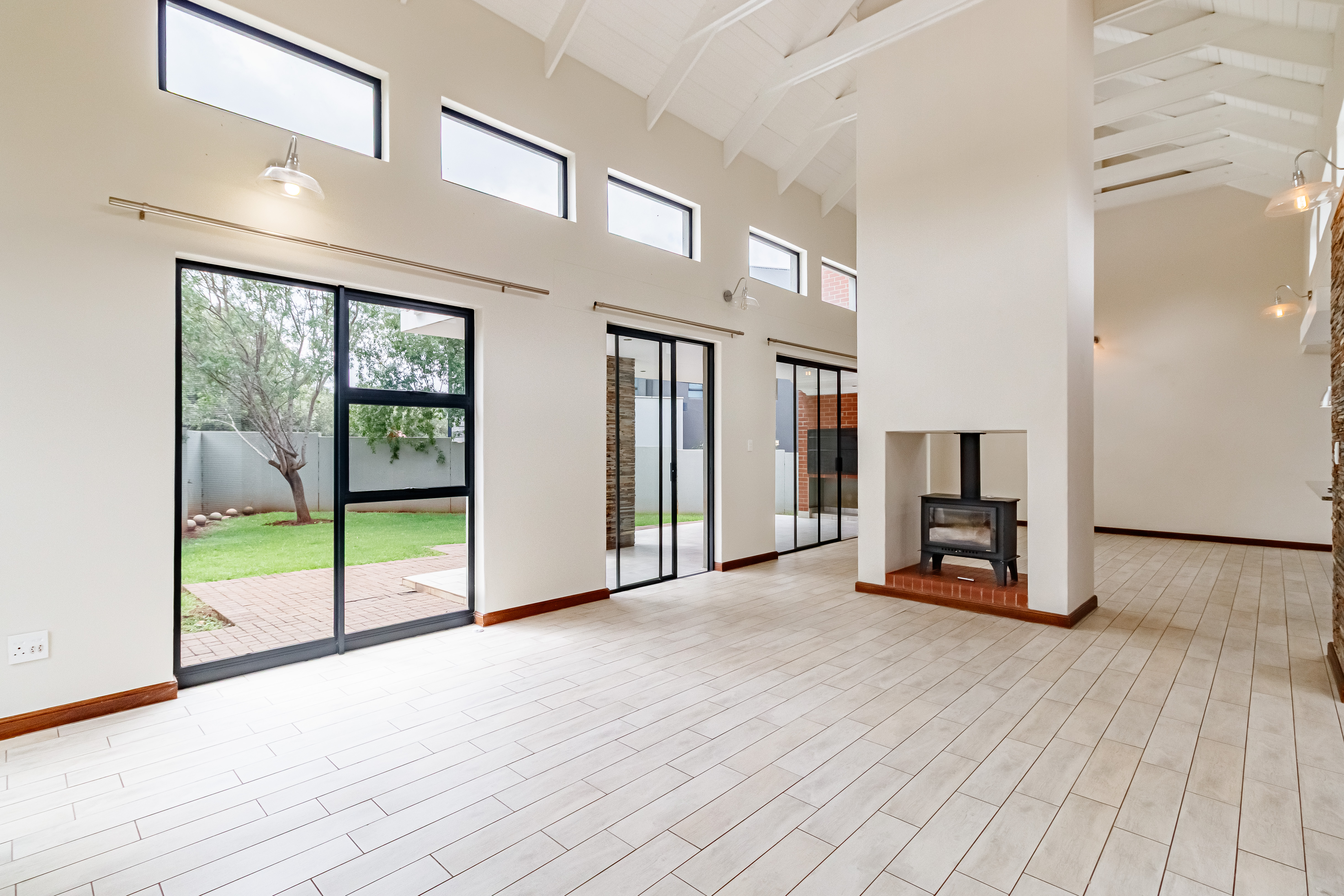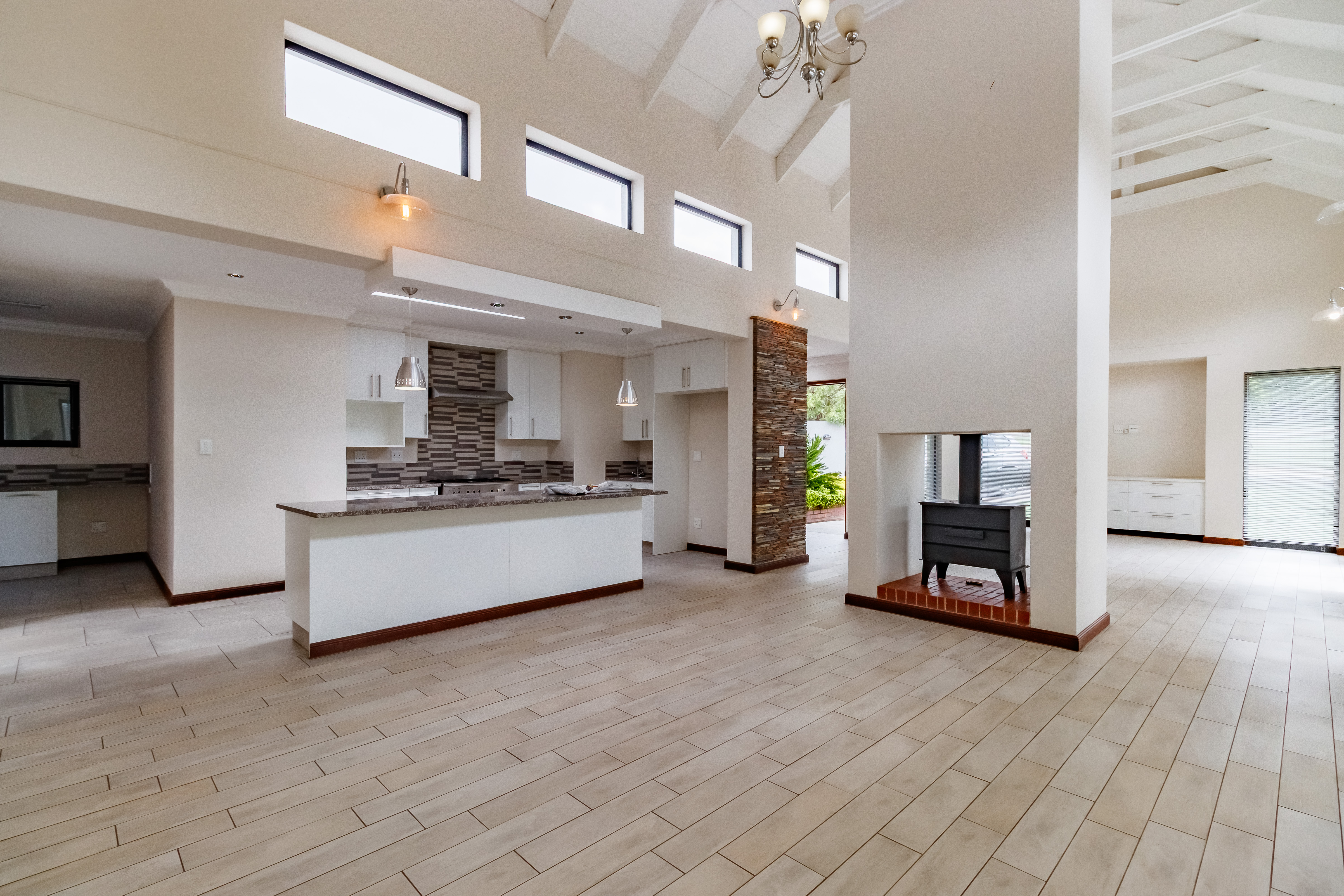 This beautifully designed farmhouse-style single-storey home is truly one of a kind, perfectly positioned in the secure and sought-after Midstream Ridge Estate. Situated in a prime location with direct access to a stunning park and playground, this home offers both charm and convenience. Upon entering, you’re greeted by a spacious guest bedroom with an en-suite bathroom and private outdoor access — ideal for guests or as a staff accommodation. The home opens up into an inviting open-plan living area that flows seamlessly into the modern kitchen, scullery, and garage. The kitchen overlooks the living and entertainment spaces, allowing you to stay connected during family gatherings. High ceilings, an indoor fireplace, and an outdoor braai area create the perfect blend of warmth and elegance for everyday living and entertaining.