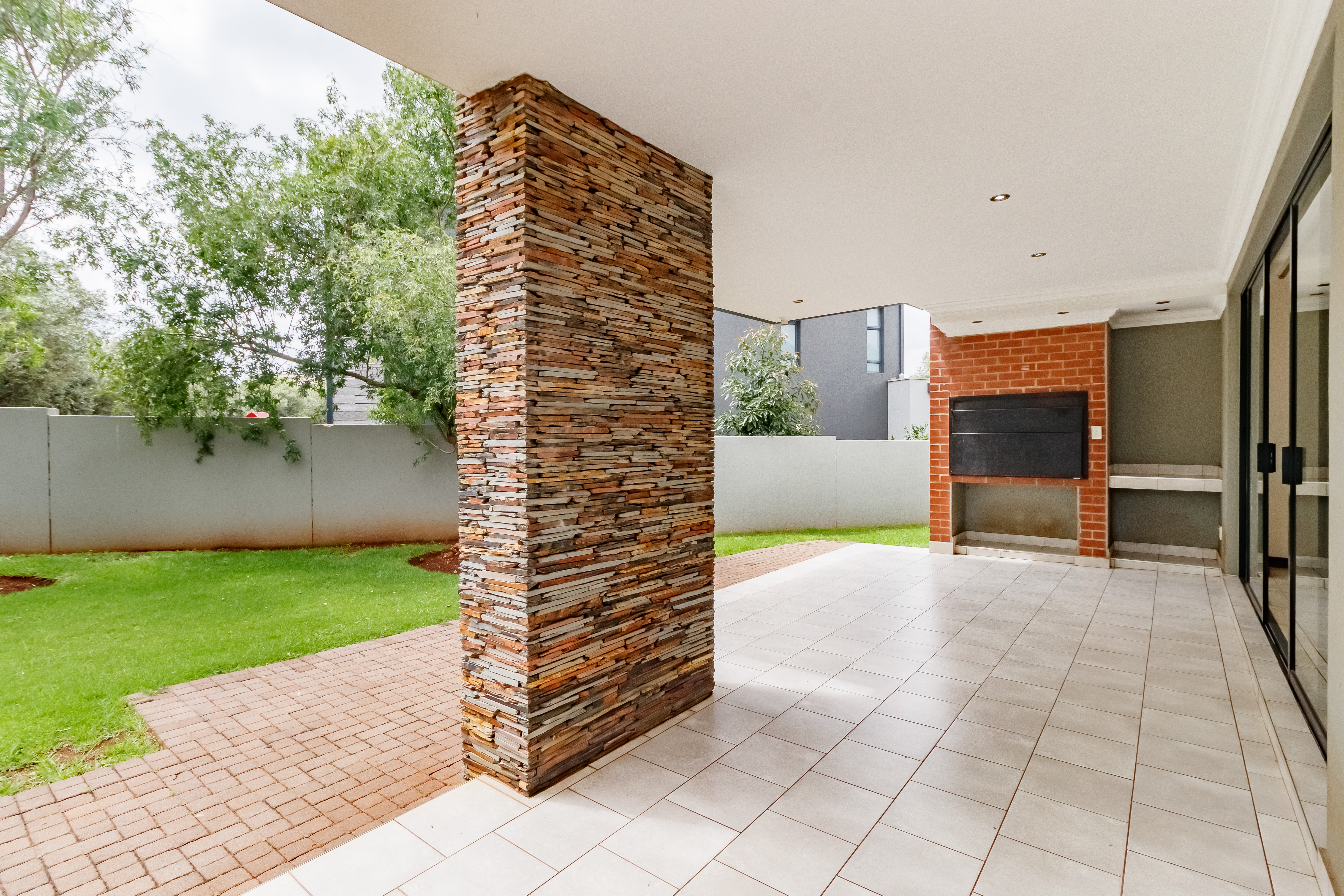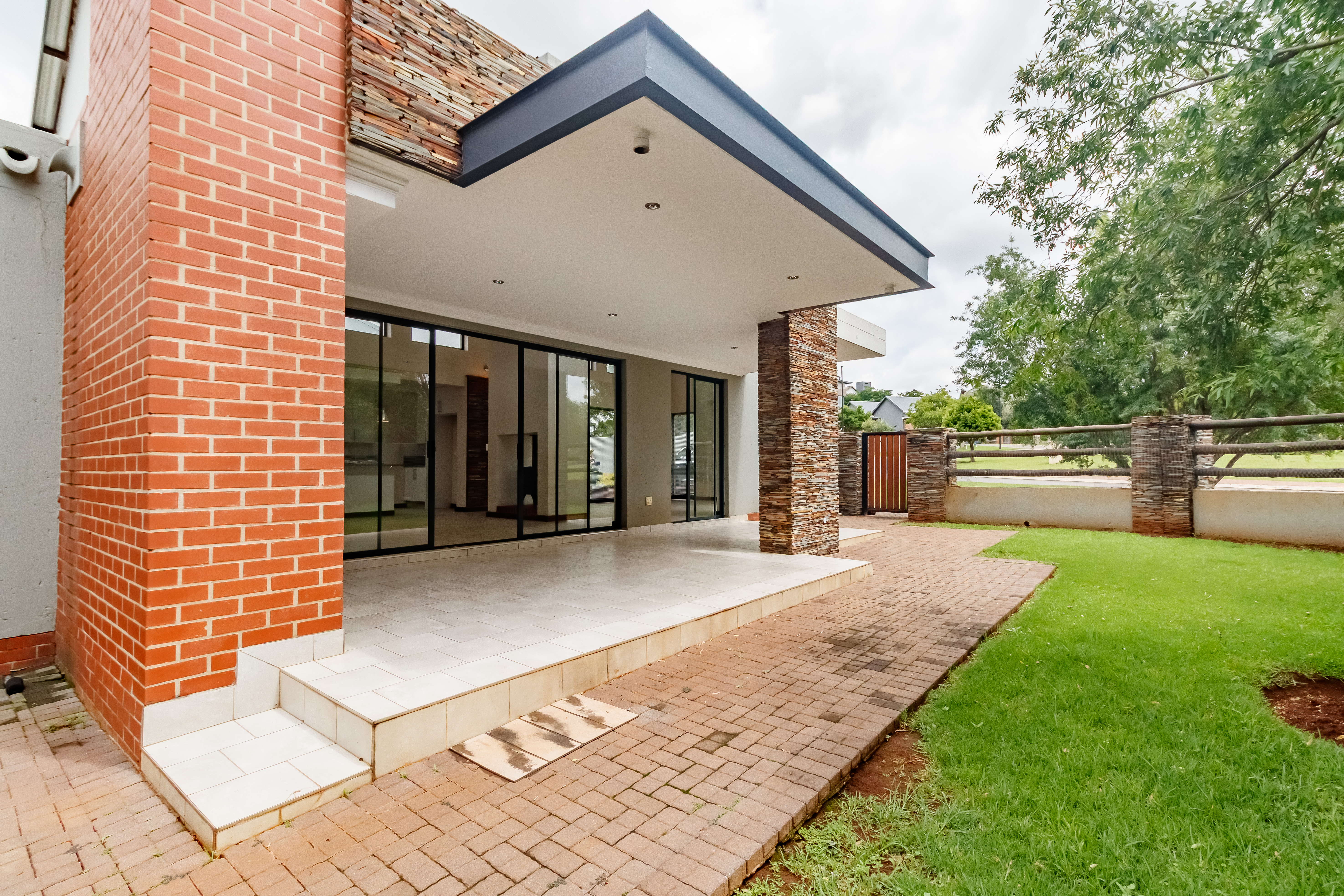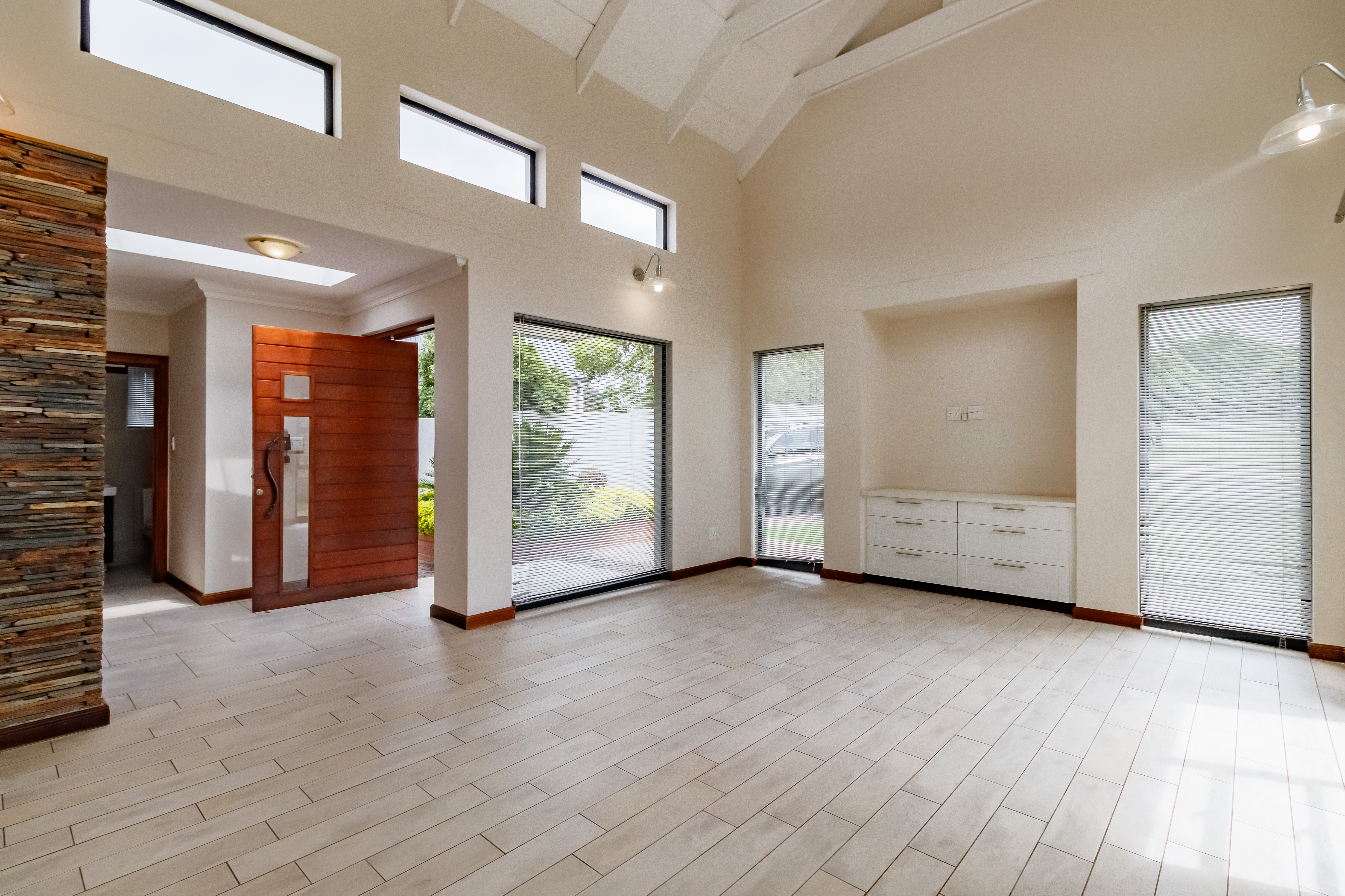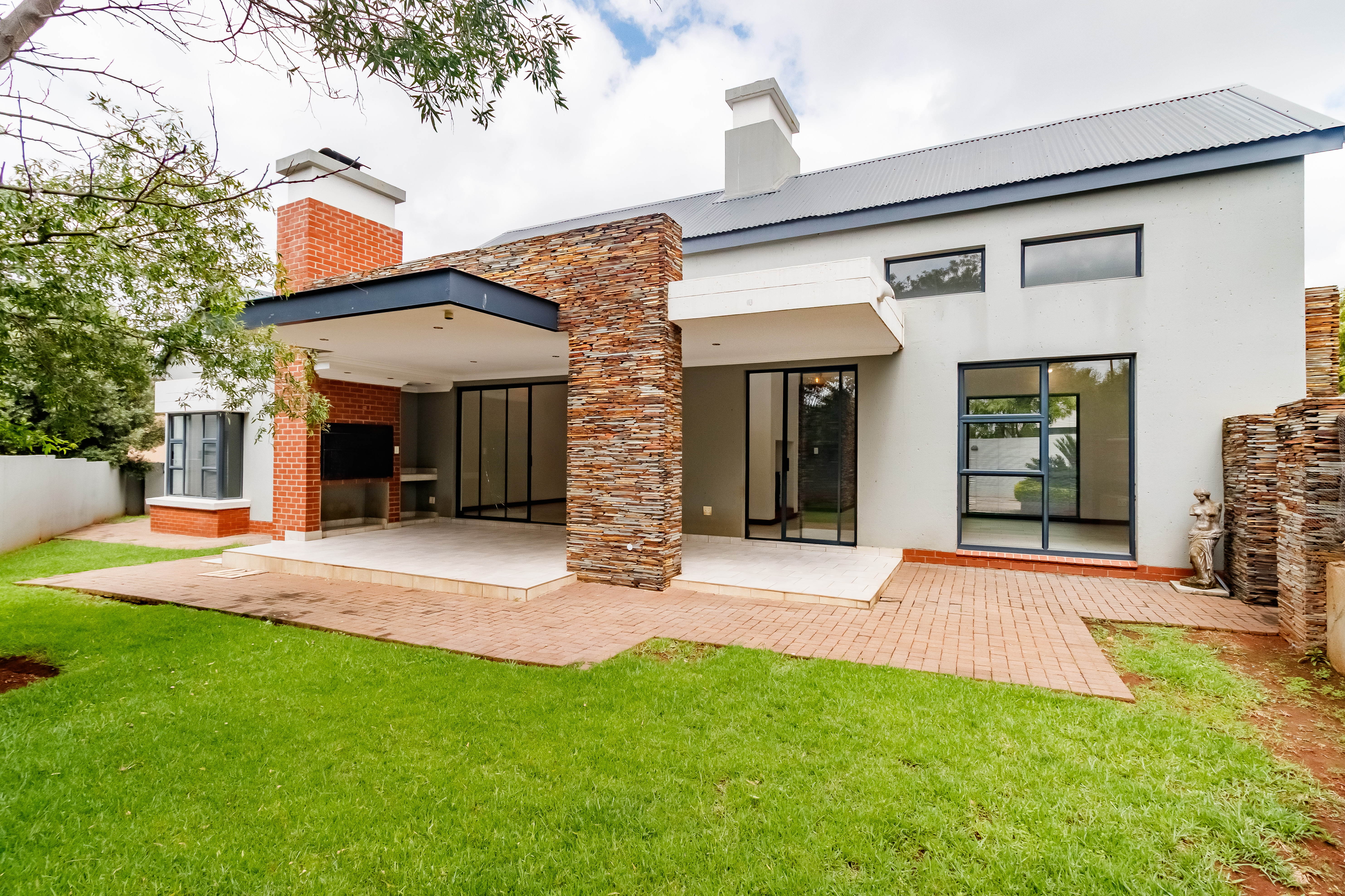 This beautifully designed farmhouse-style single-storey home is truly one of a kind, perfectly positioned in the secure and sought-after Midstream Ridge Estate. Situated in a prime location with direct access to a stunning park and playground, this home offers both charm and convenience. Upon entering, you’re greeted by a spacious guest bedroom with an en-suite bathroom and private outdoor access — ideal for guests or as a staff accommodation. The home opens up into an inviting open-plan living area that flows seamlessly into the modern kitchen, scullery, and garage. The kitchen overlooks the living and entertainment spaces, allowing you to stay connected during family gatherings. High ceilings, an indoor fireplace, and an outdoor braai area create the perfect blend of warmth and elegance for everyday living and entertaining.