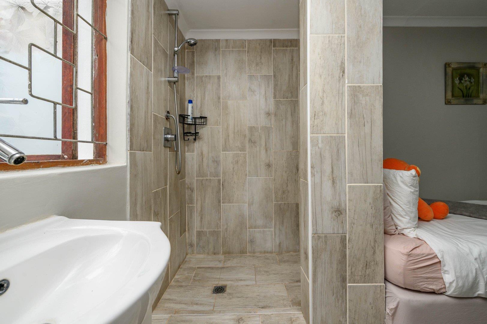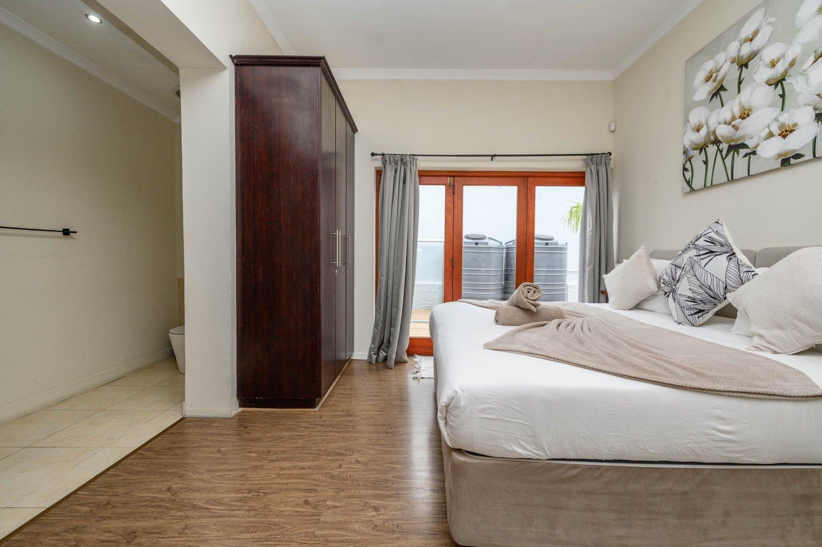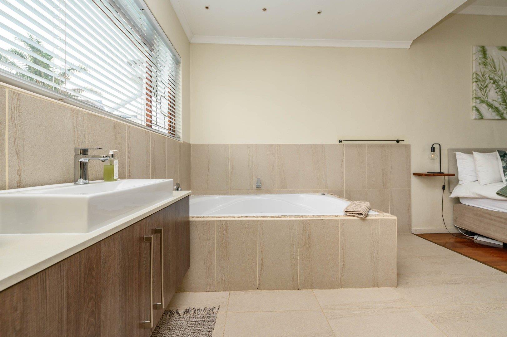 Modern open-plan living with a contemporary kitchen and island, polished wooden floors, and seamless indoor-outdoor flow to a covered patio, pool and braai area. The main house features three spacious bedrooms, including a luxurious master suite with walk-in closet, double-volume shower and jet spa bath.