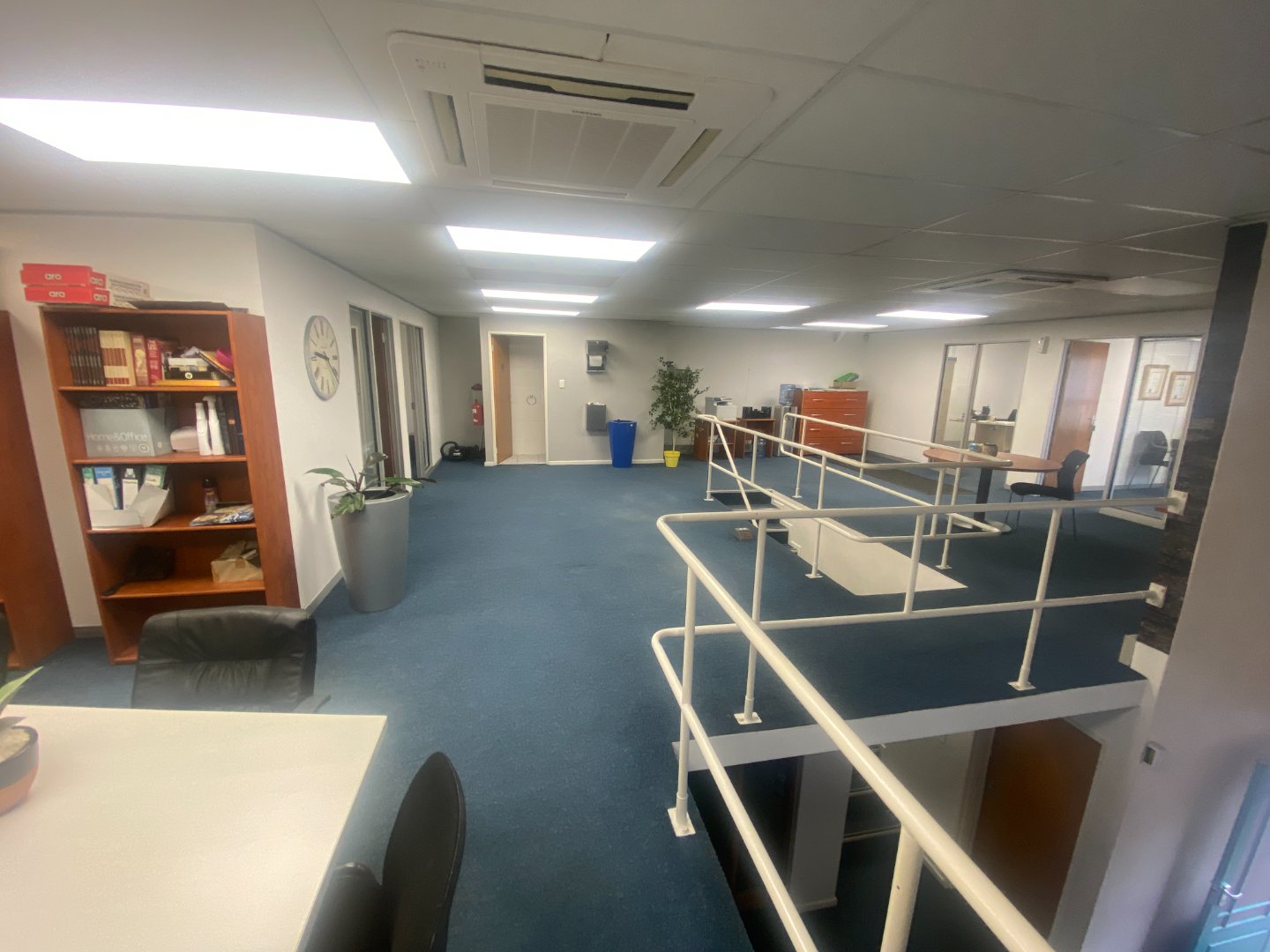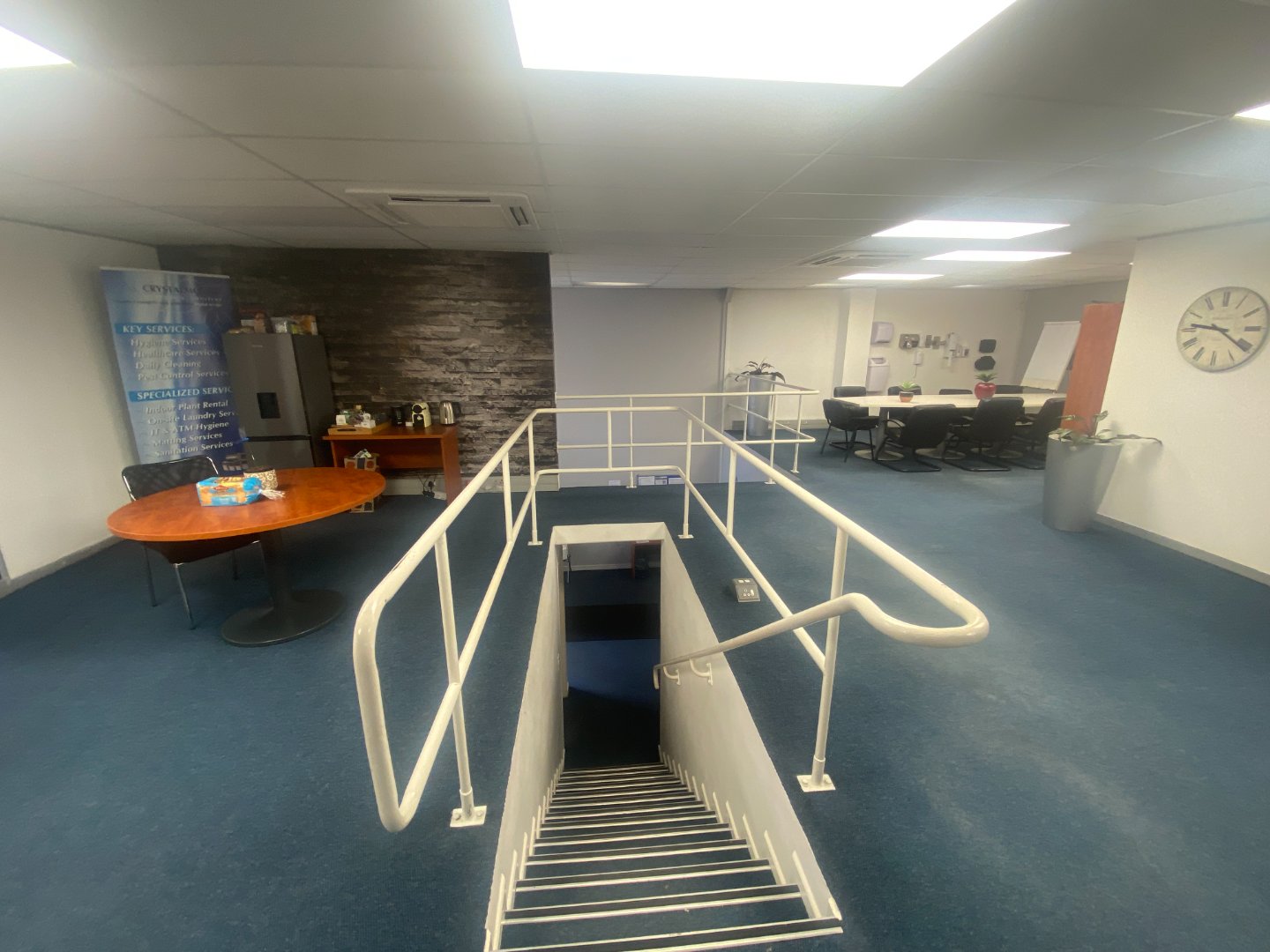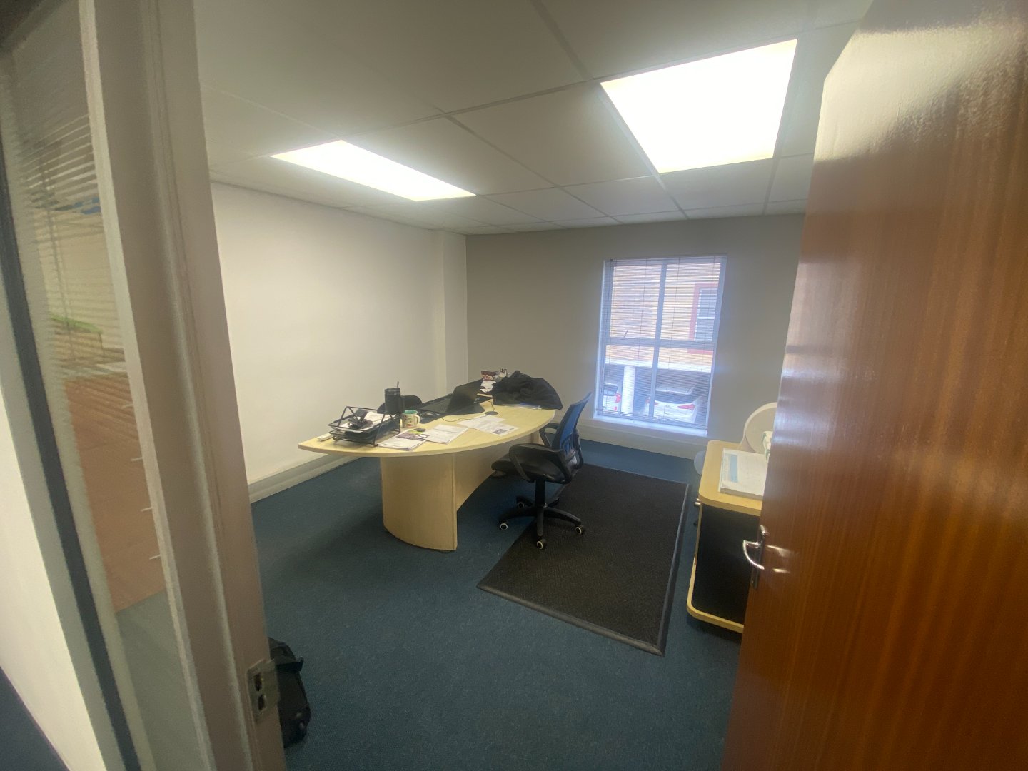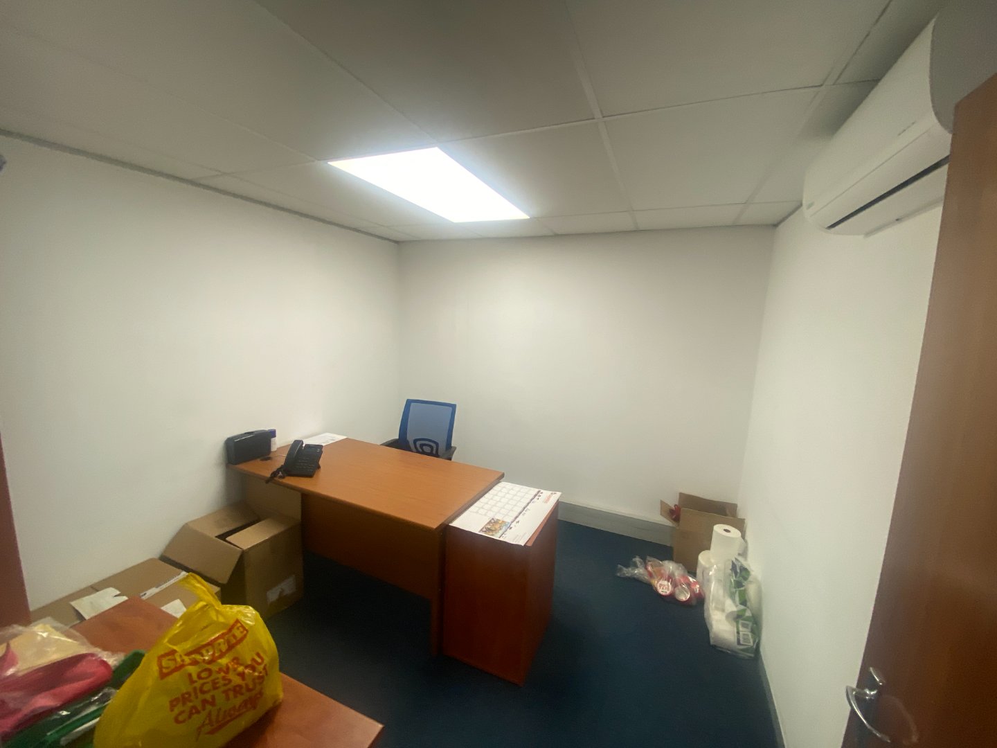 Positioned in a well-secured business complex with 24/7 access control, this professional office unit offers a safe and orderly working environment. The building is in excellent condition and presents a range of workspace configurations, including enclosed offices, an open-plan section upstairs with individual partitions, and a generously sized storage room.