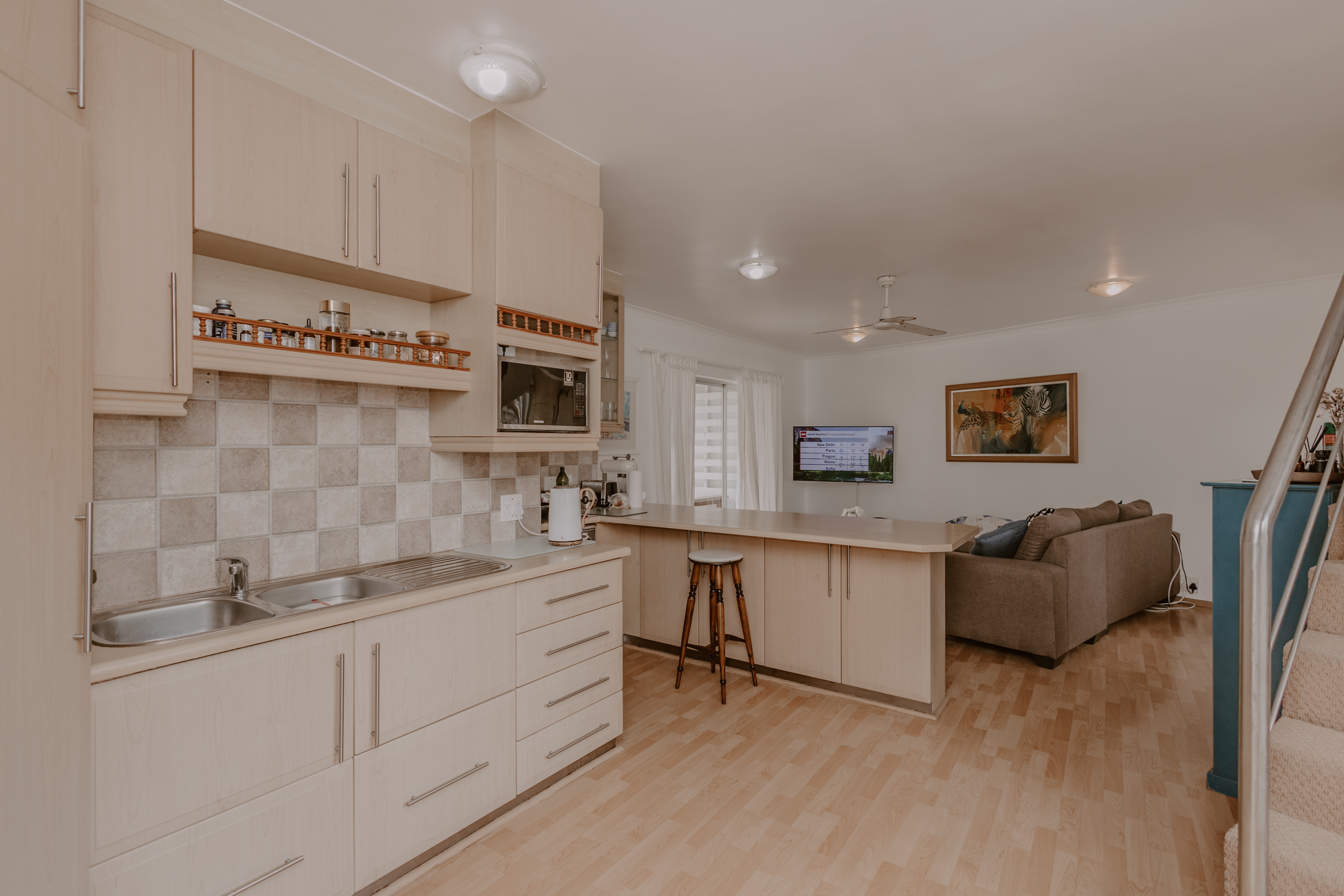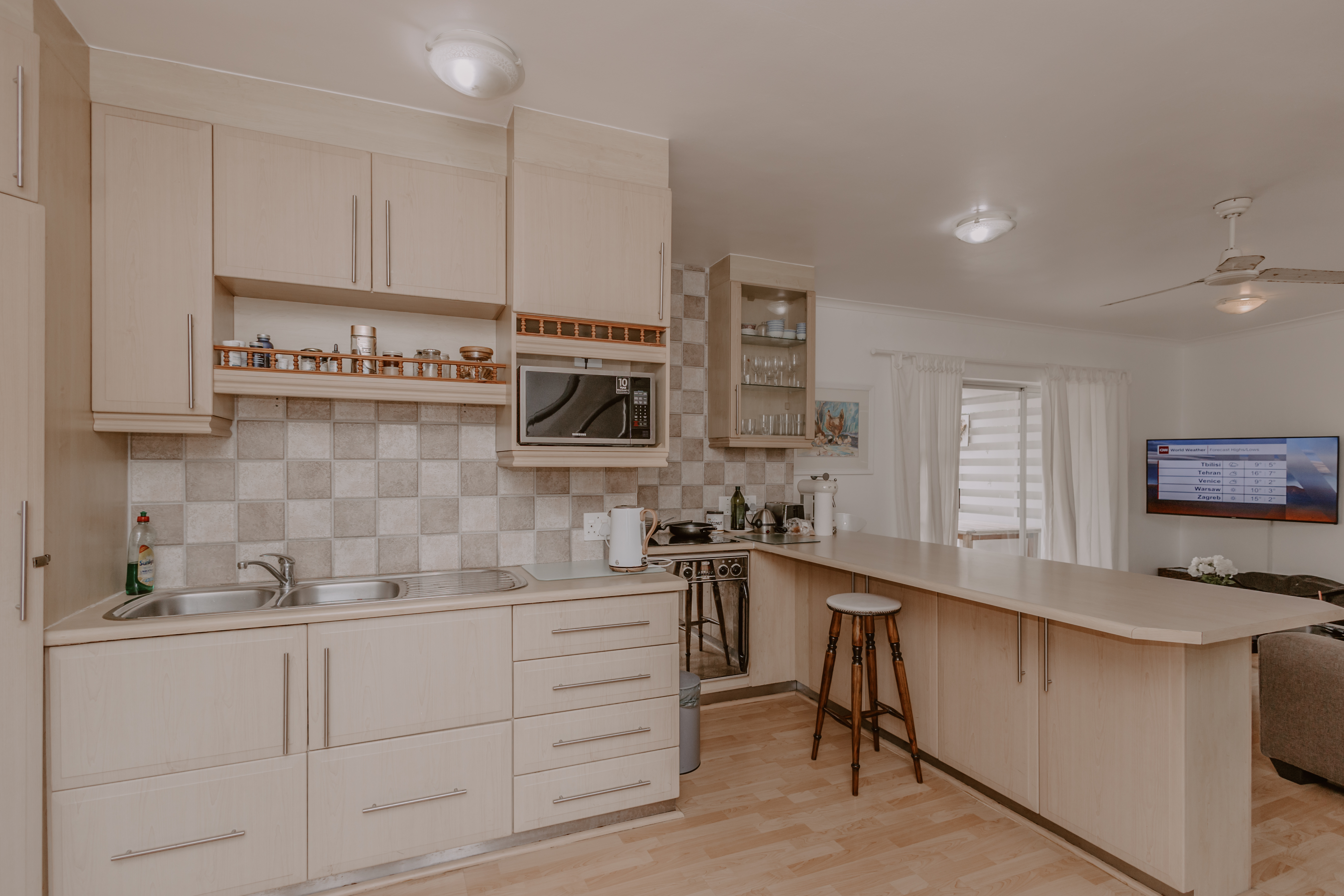 - Neat self-contained kitchen with breakfast counter.