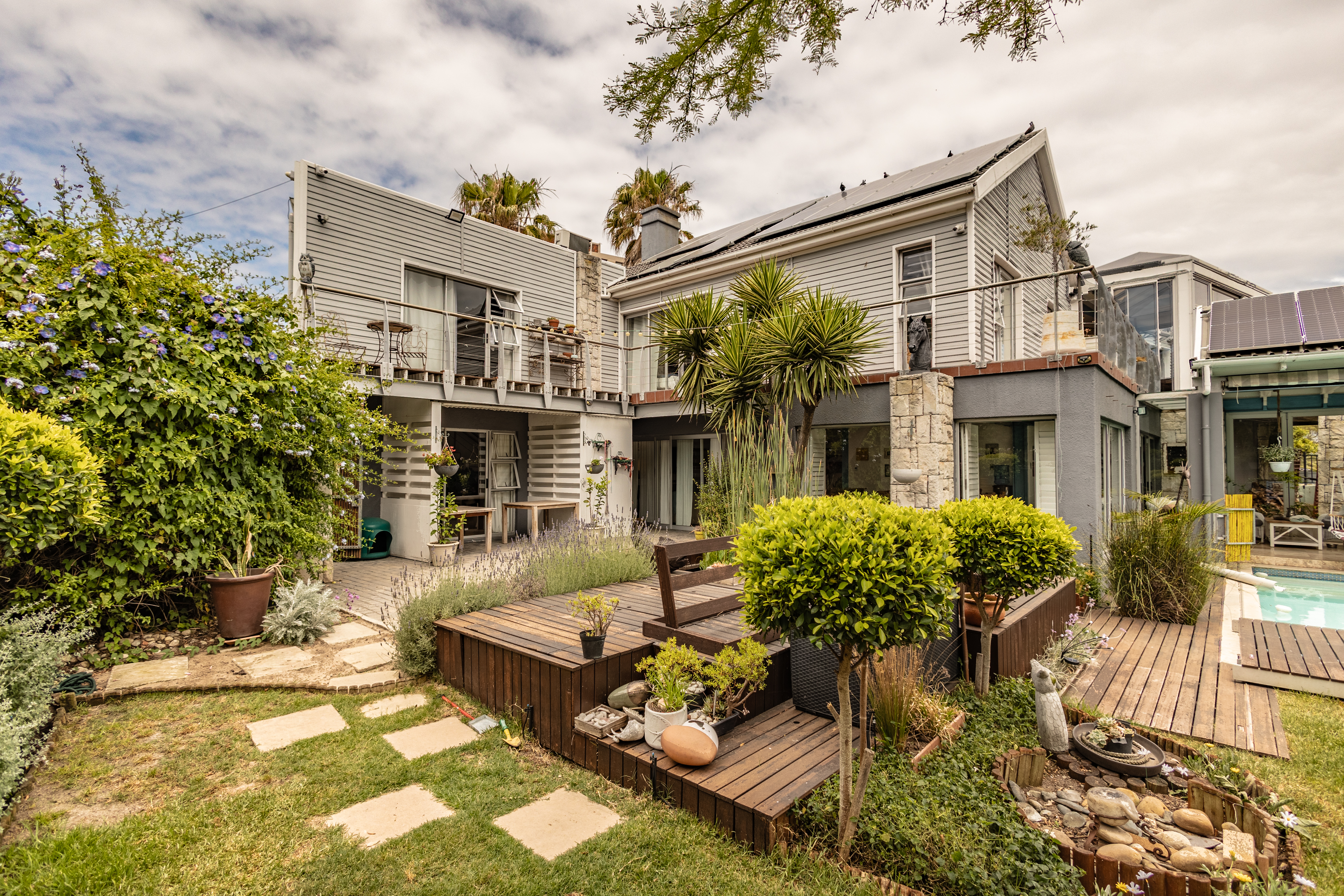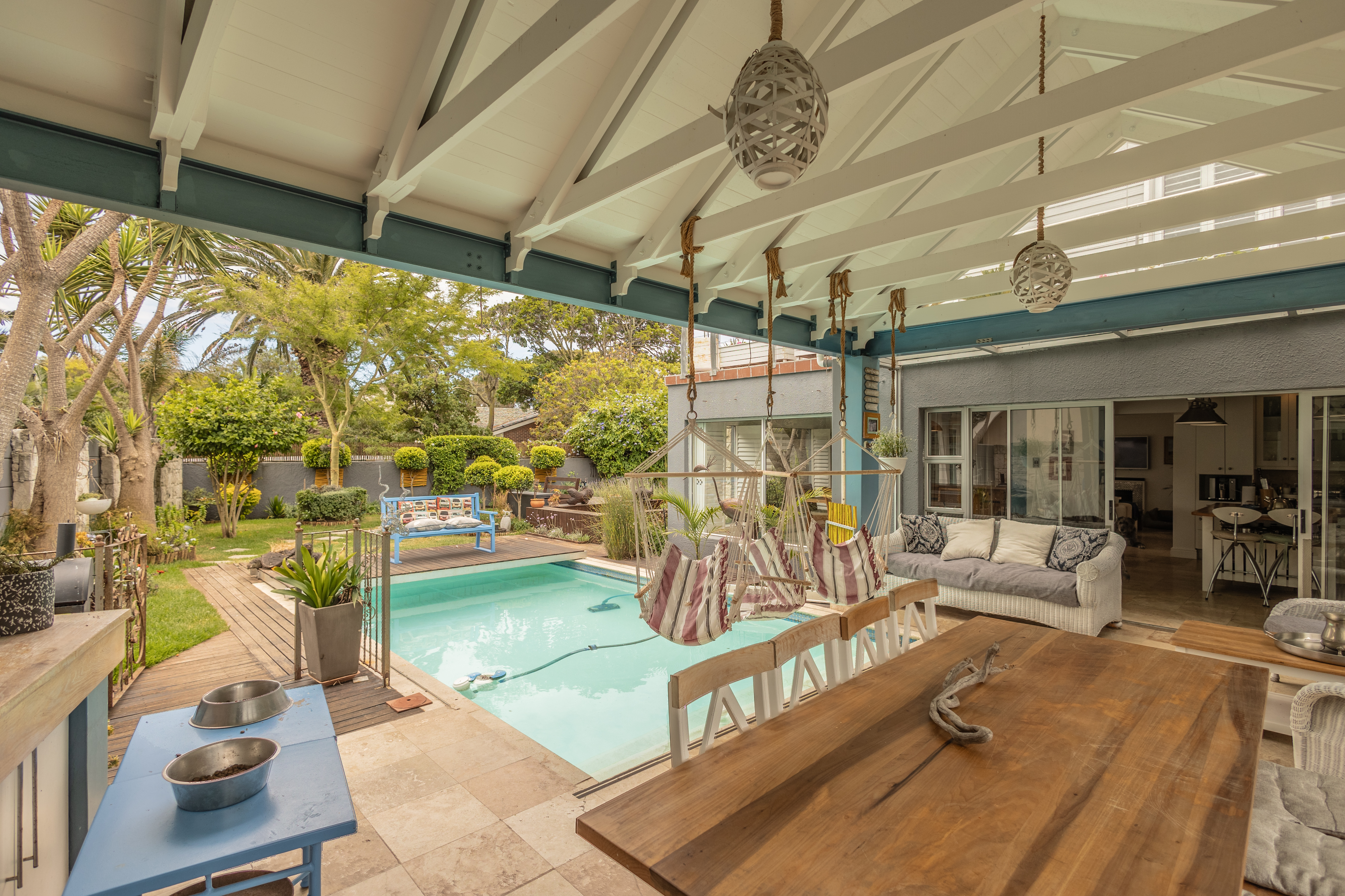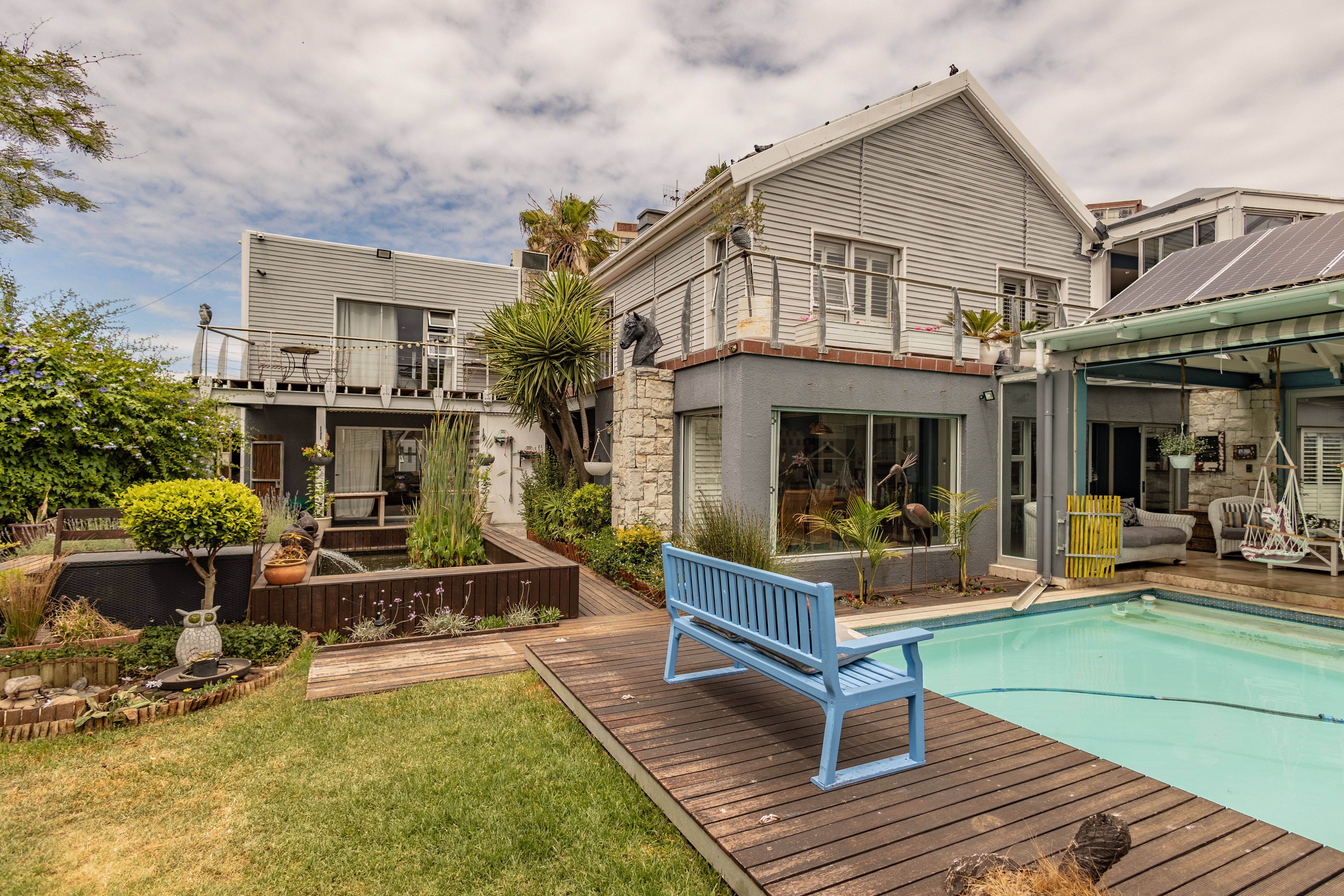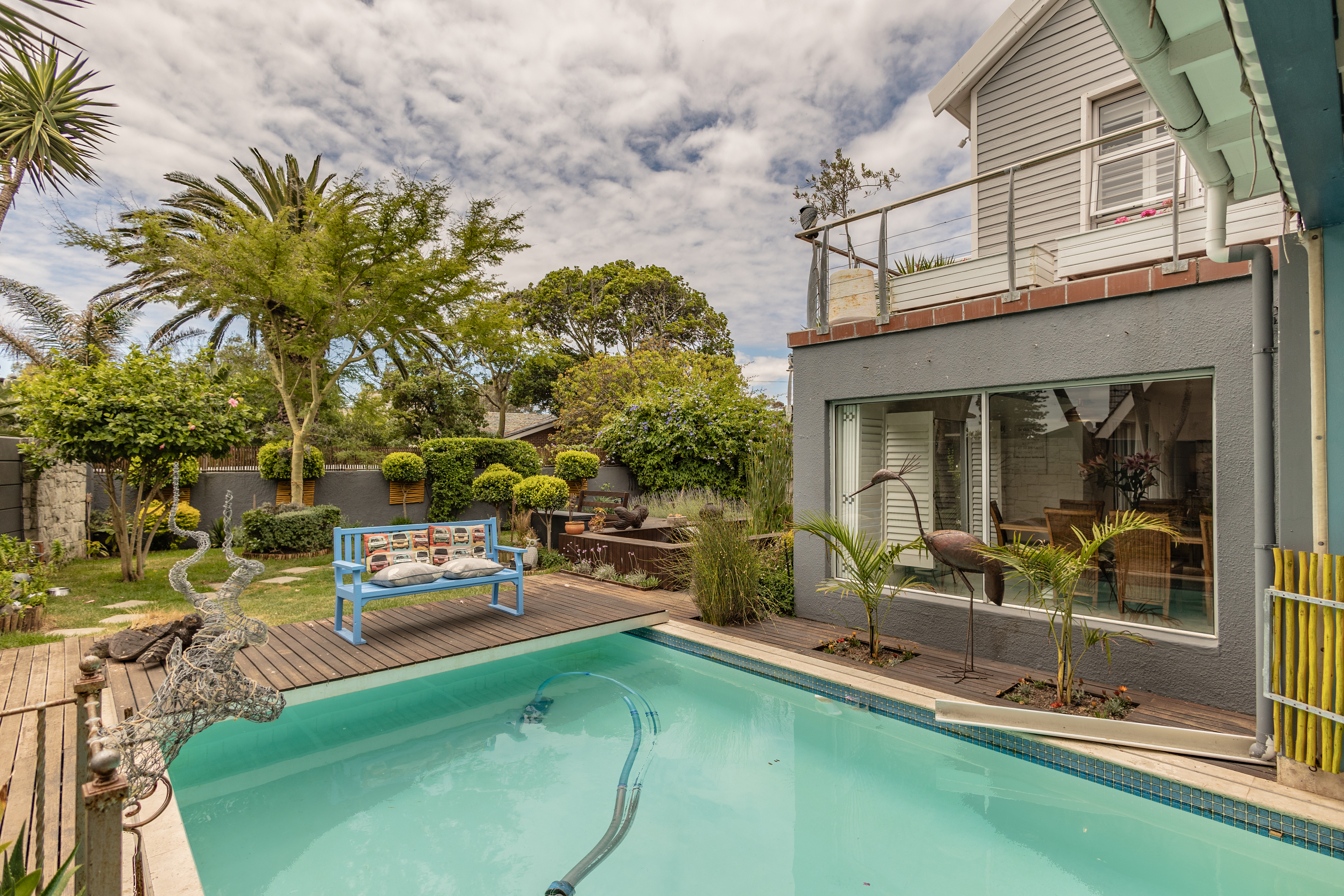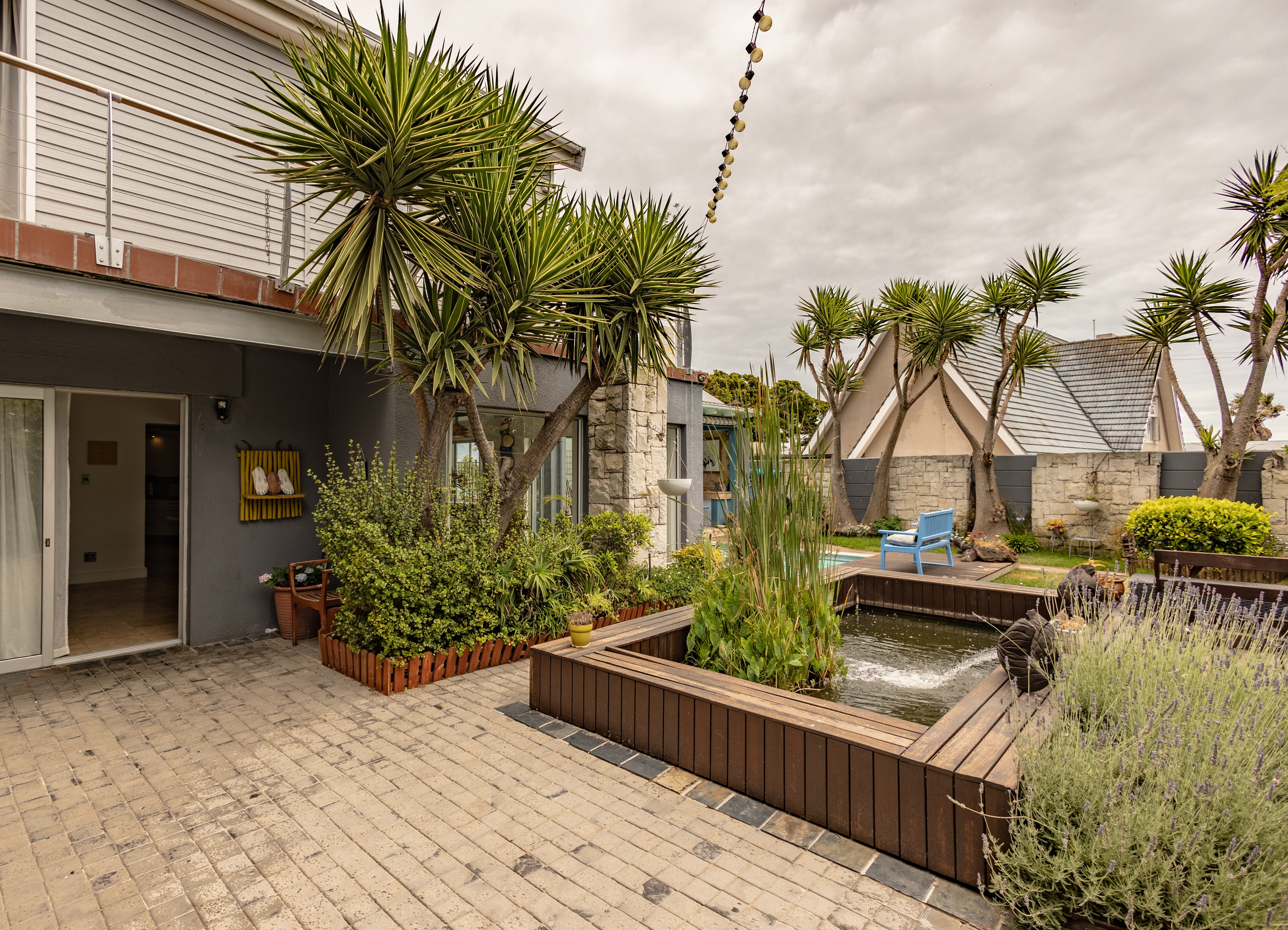 - Manicured pet-friendly garden with heated pool and fish pond.